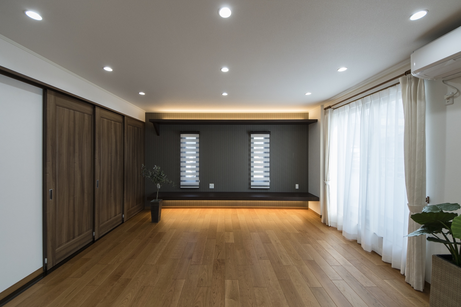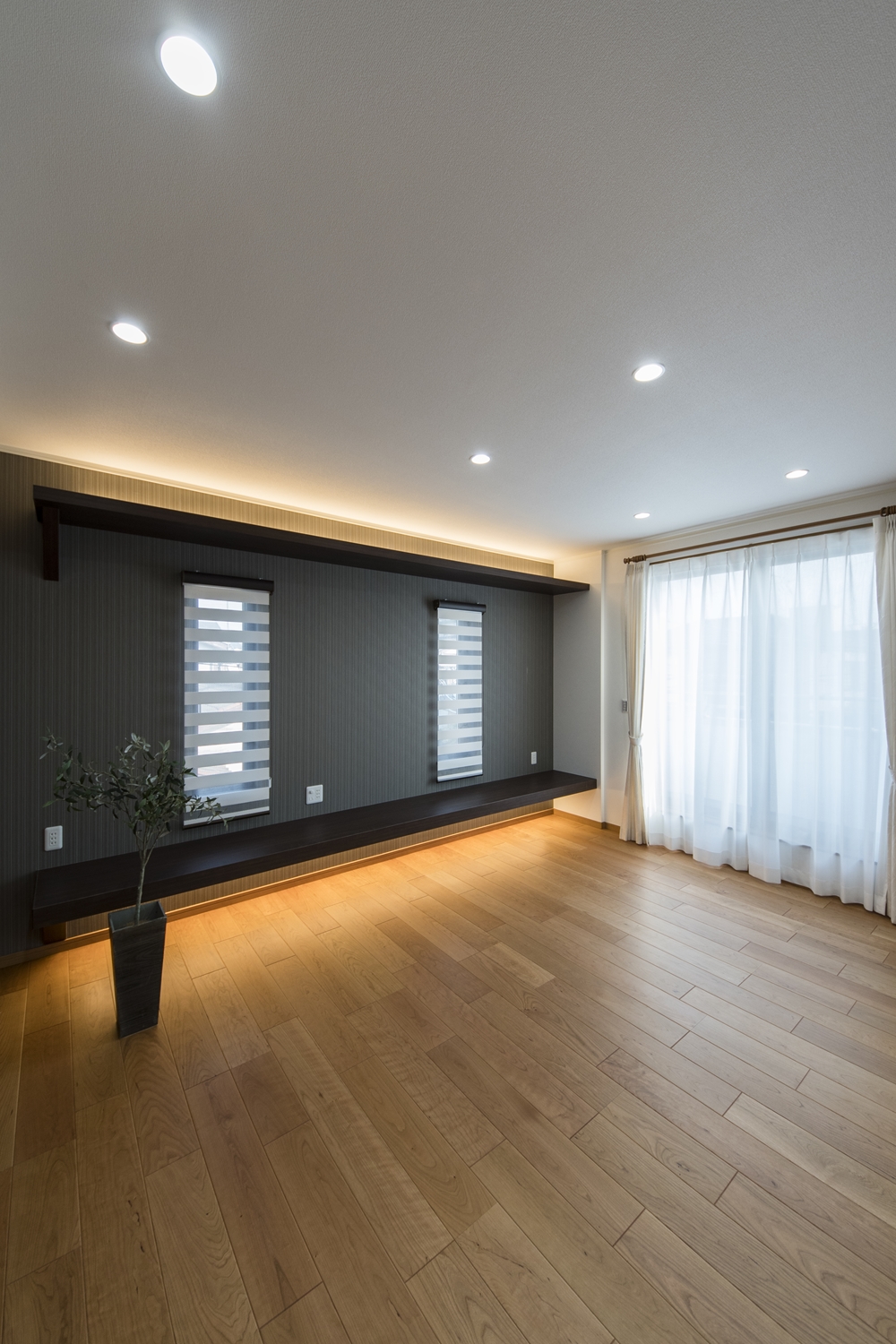 2Fリビング(子世帯)/TVボードと間接照明を施した、見た目も機能美も充実した上質な空間のリビング。