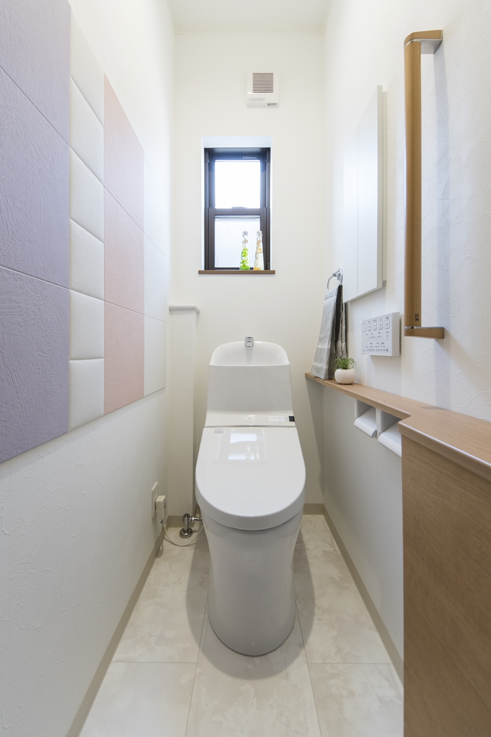2Fトイレ(子世帯)/消臭・調湿効果のあるエコカラットタイルを施しました。パステルカラーを組み合わせた可愛らしいデザインです。