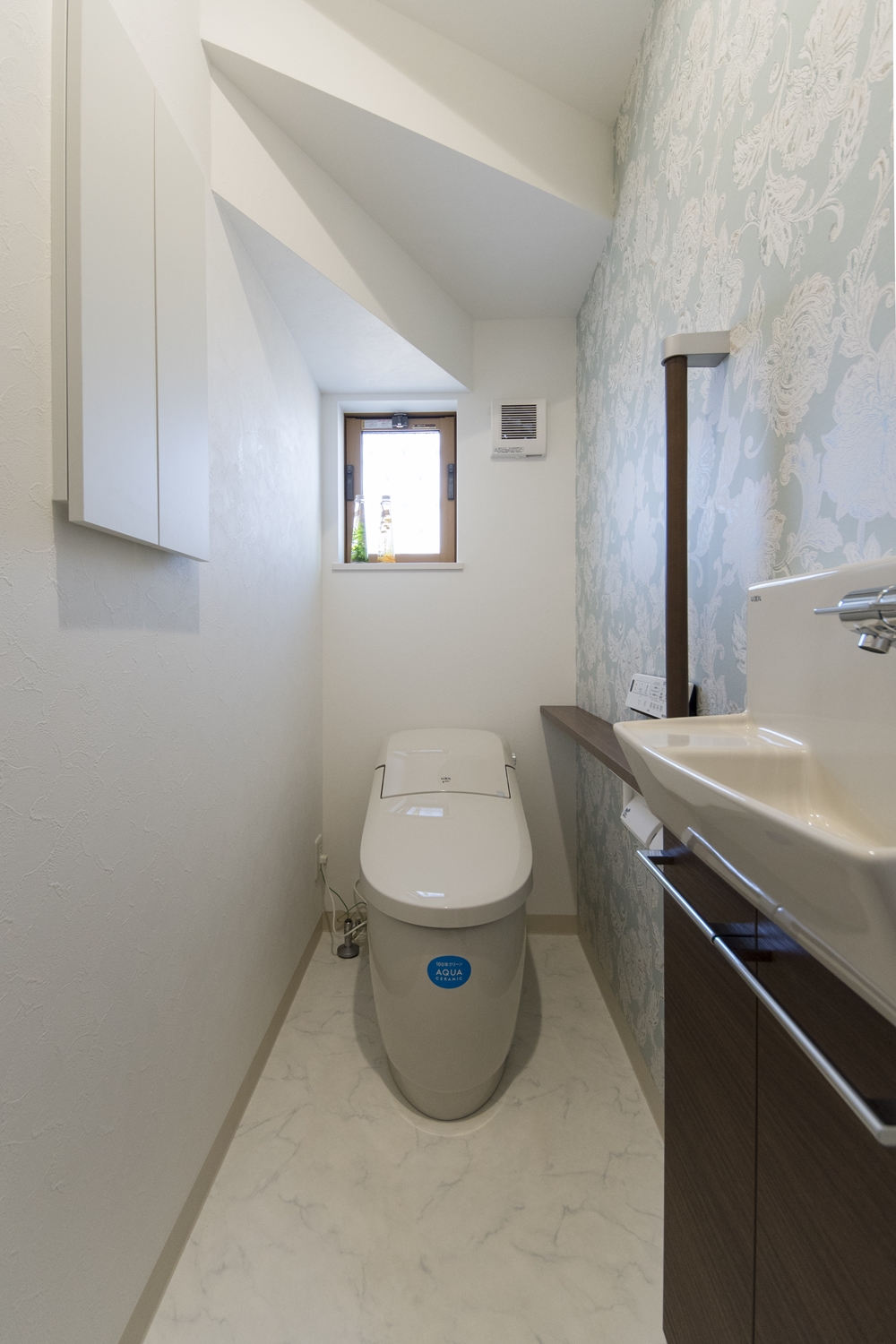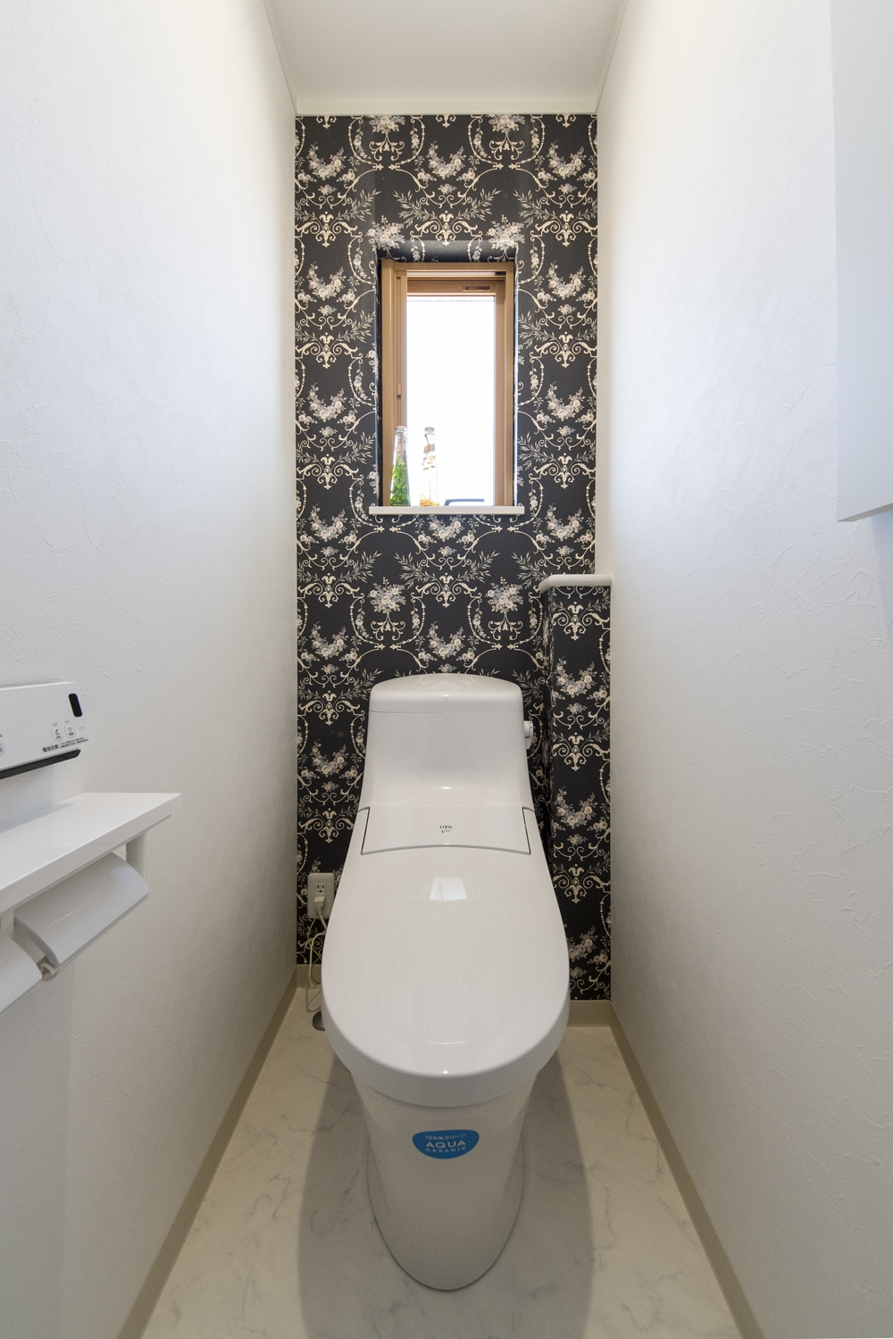 清潔感のある2階トイレ。アクセントクロスがエレガントな印象を与えます。
