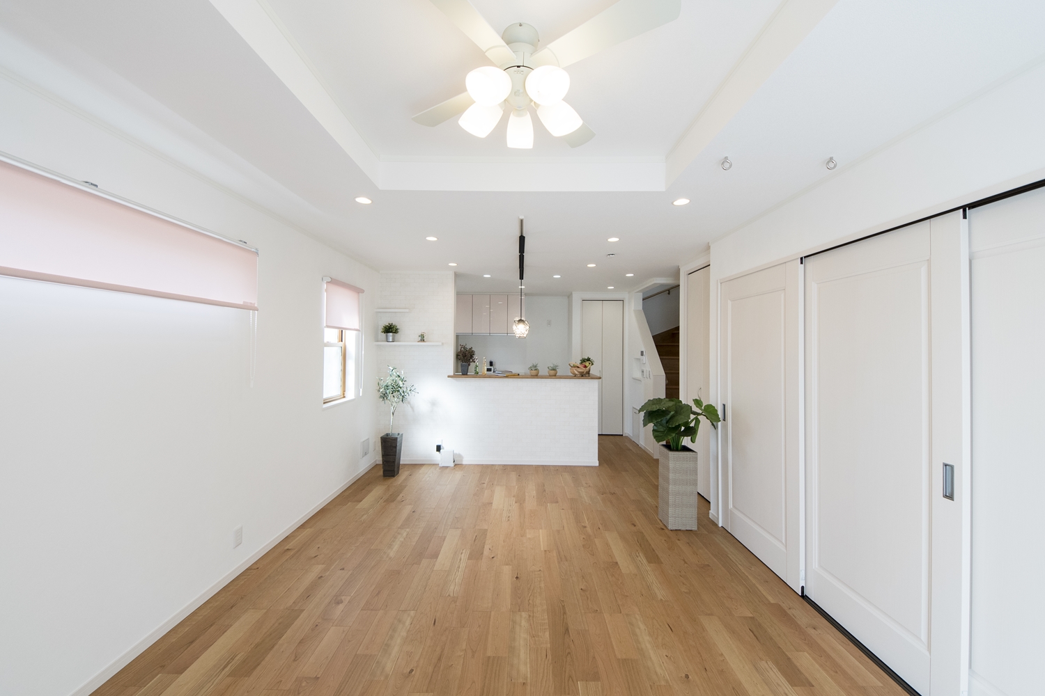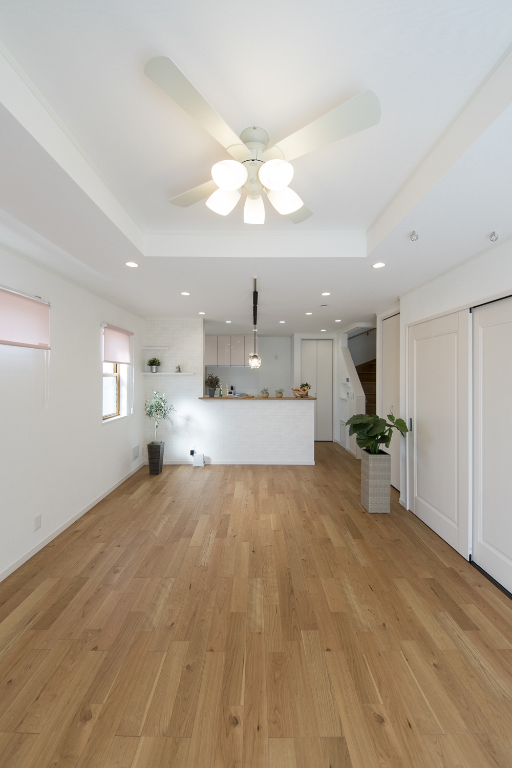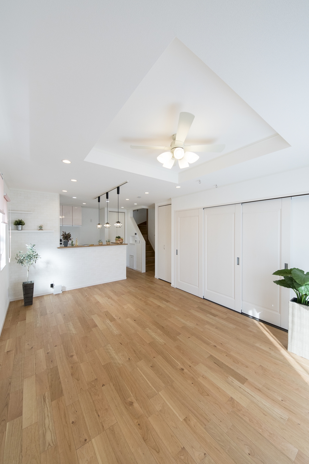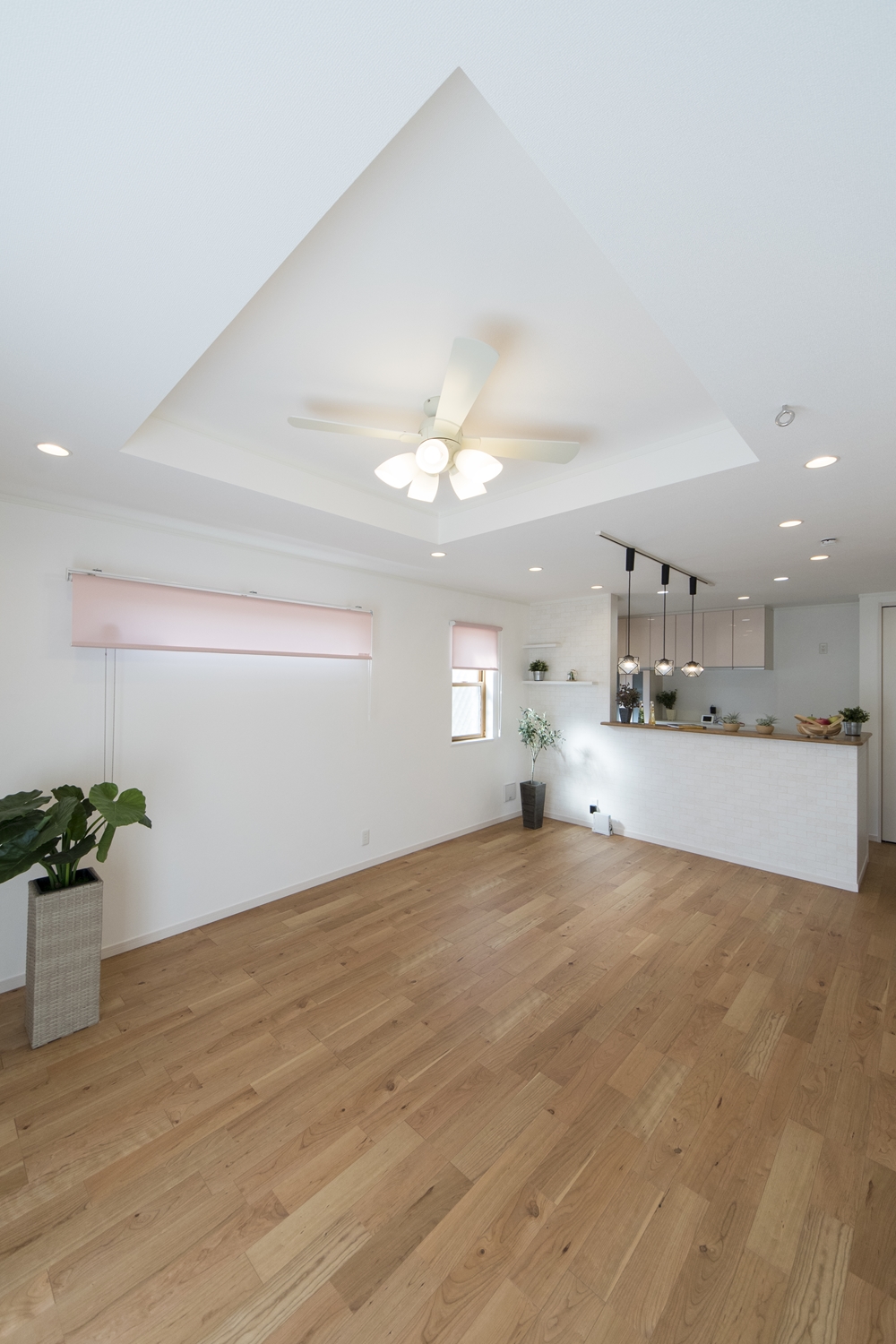リビング全体を広々に見せてくれる折り上げ天井と、シーリングファンライトの組合せが素敵です。