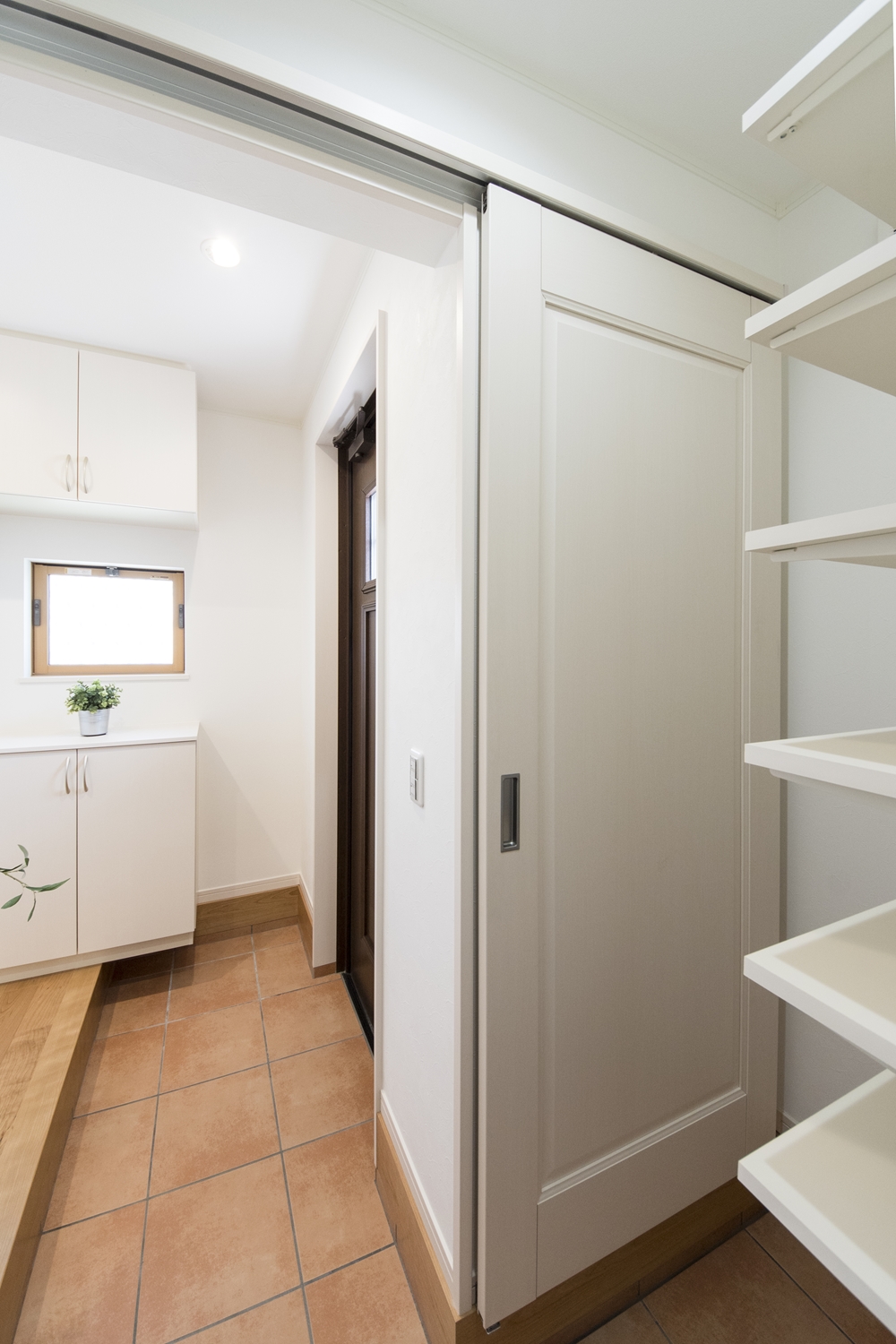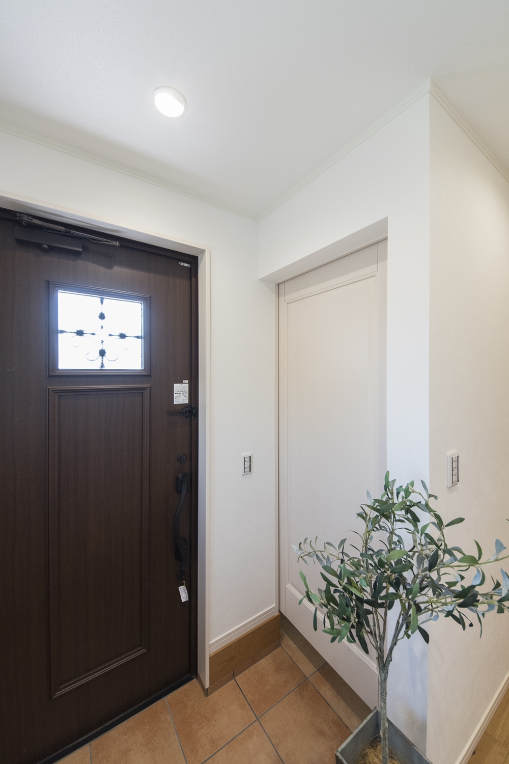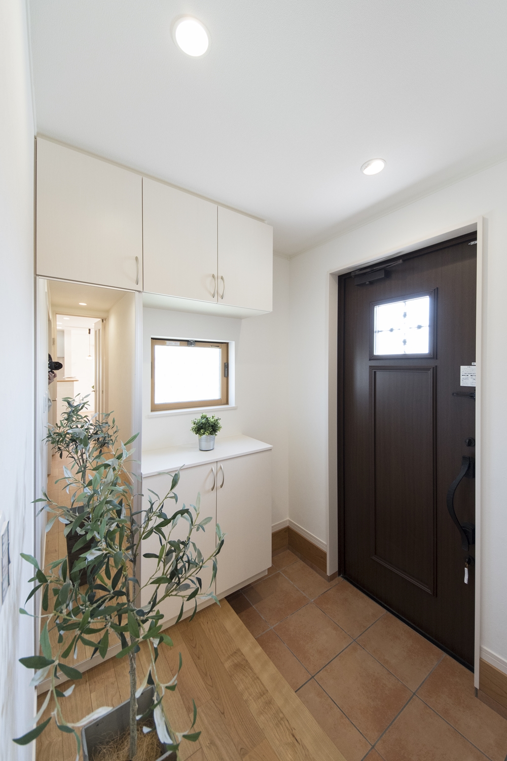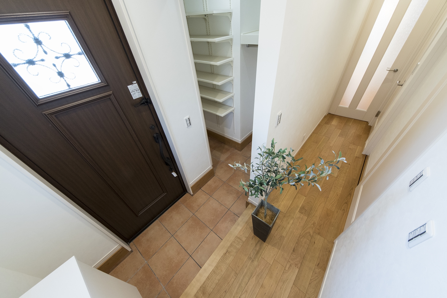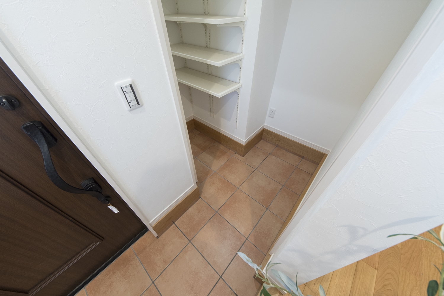 木の温もり感じる玄関ドアや収納、レッドのテラコッタ調タイルがナチュラルテイストな空間を演出。