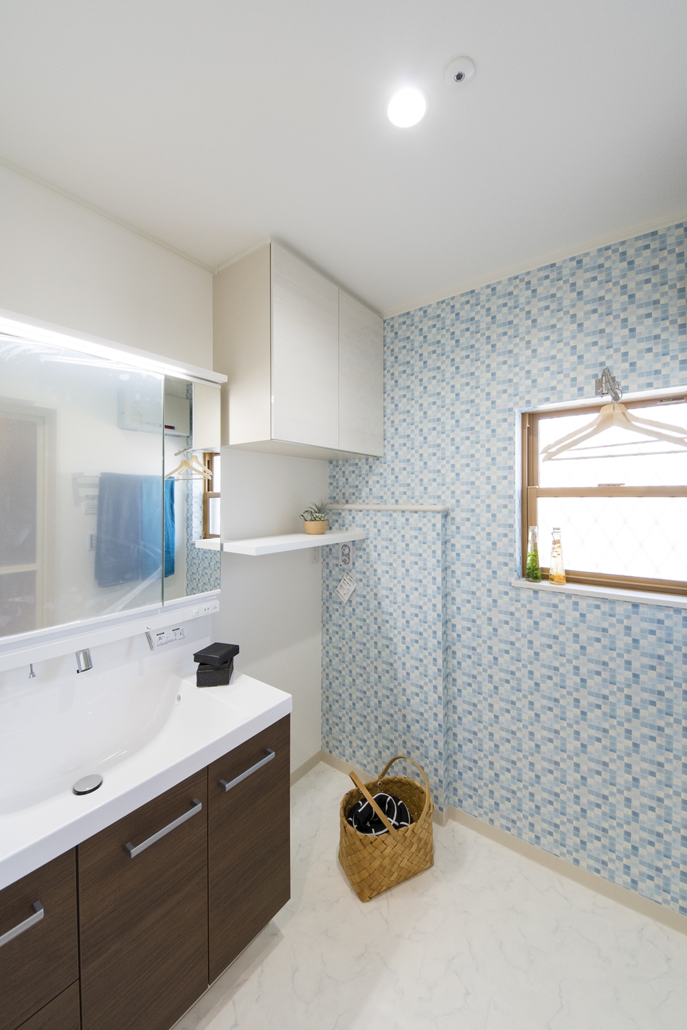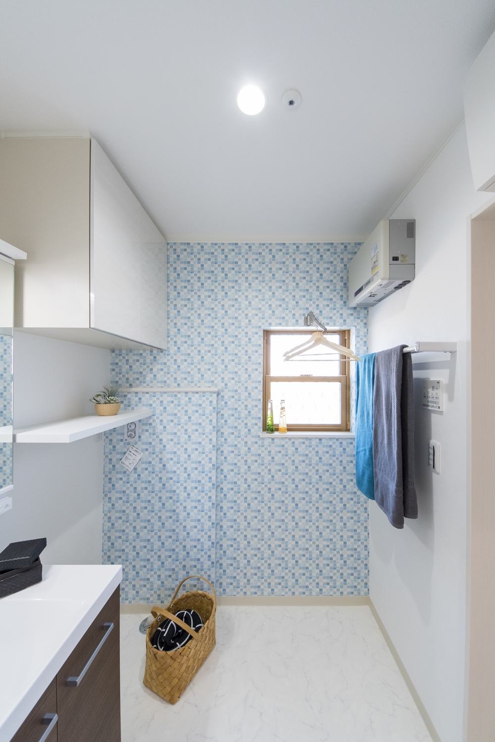 モザイクタイル柄のアクセントクロスが爽やかな空間を演出。