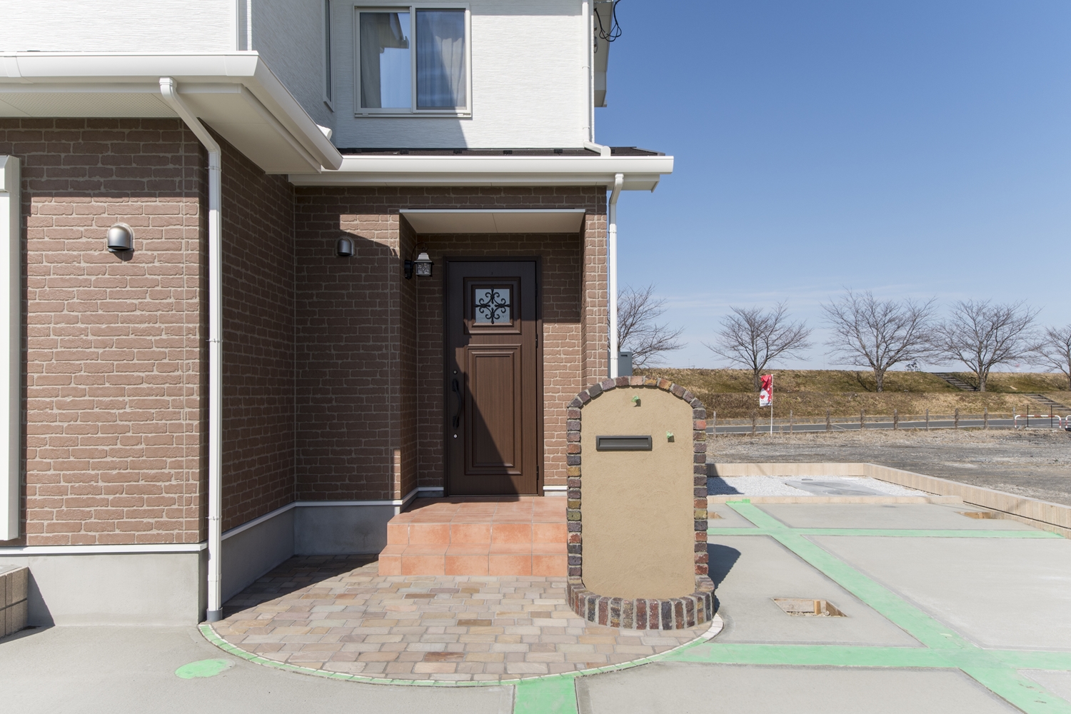ナチュラルテイストな玄関まわり。可愛らしいレンガデザインの郵便受けが優しく彩ります。