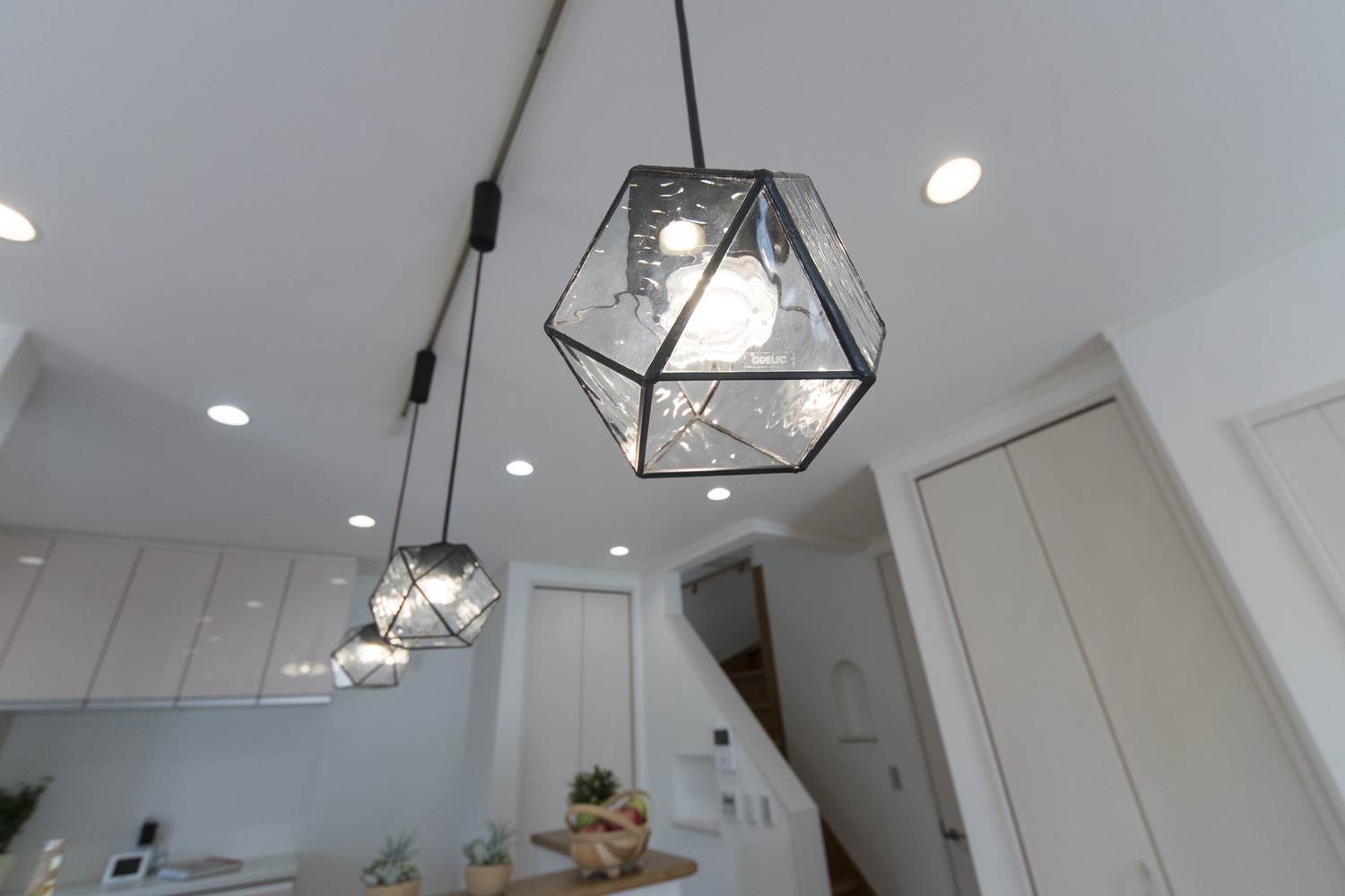 ガラスのペンダントライトの柔らかな光が、ダイニングをやさしく照らします。
