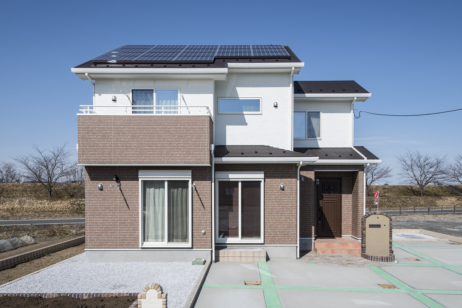白とレンガ調の外壁を上下に張り分けた、温かみのあるナチュラルテイストな外観。太陽光発電システムを導入したエコライフを叶える住まいが完成しました。
