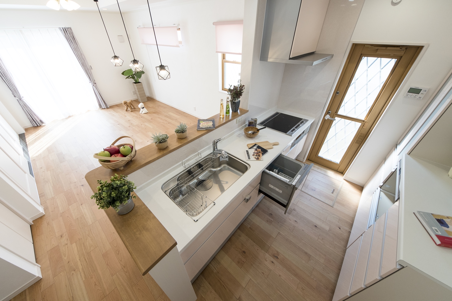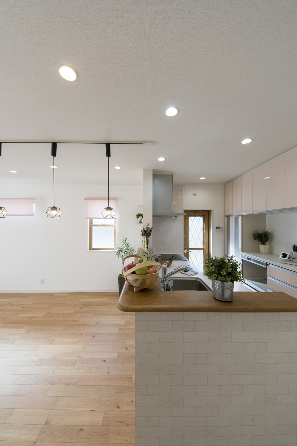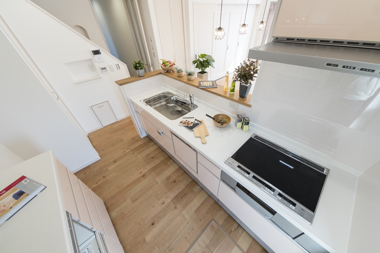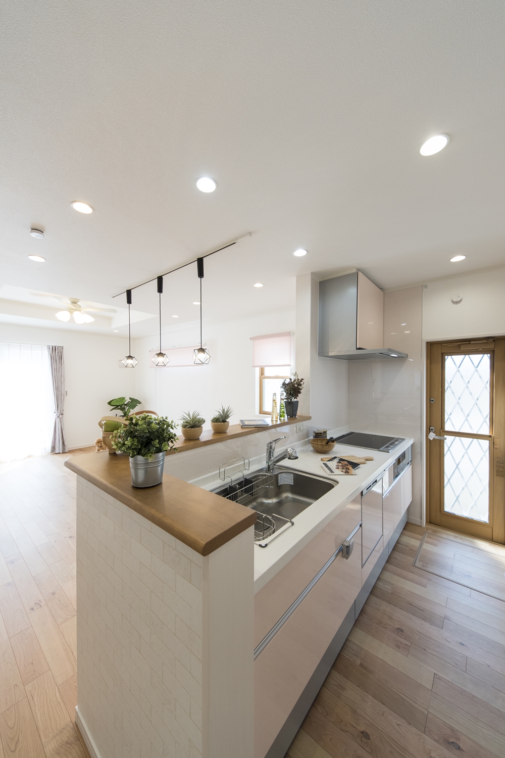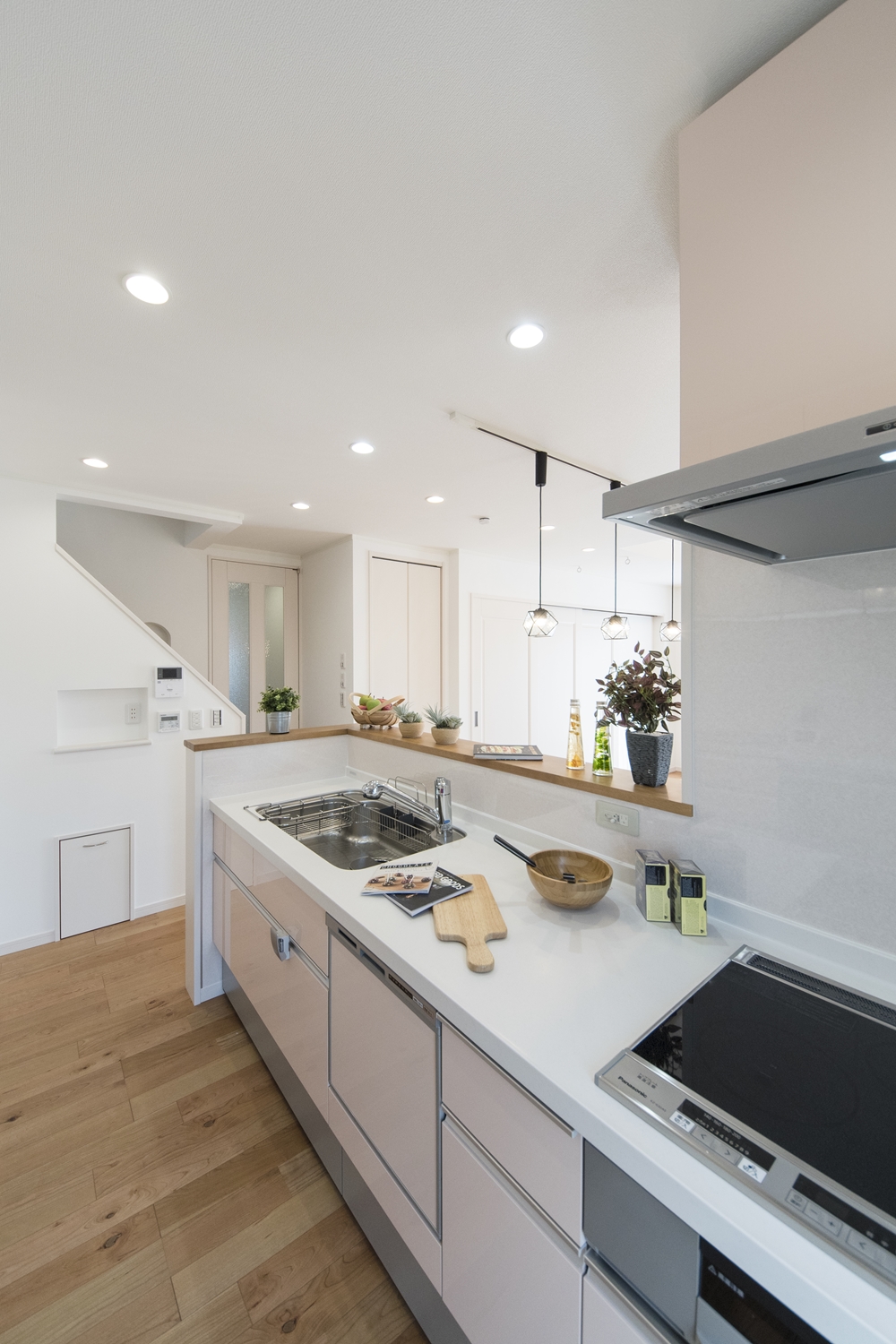 家族のコミュニケーションをはぐくむ対面式キッチン。キッチンカウンターにはアイテムを飾ったりインテリアも楽しめます♪
