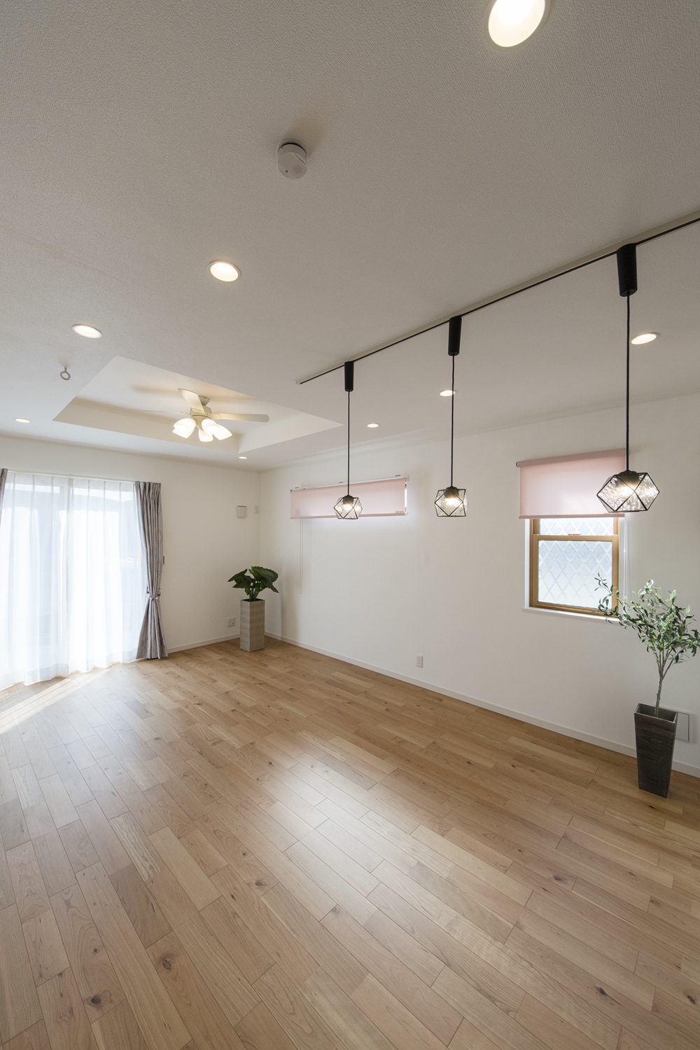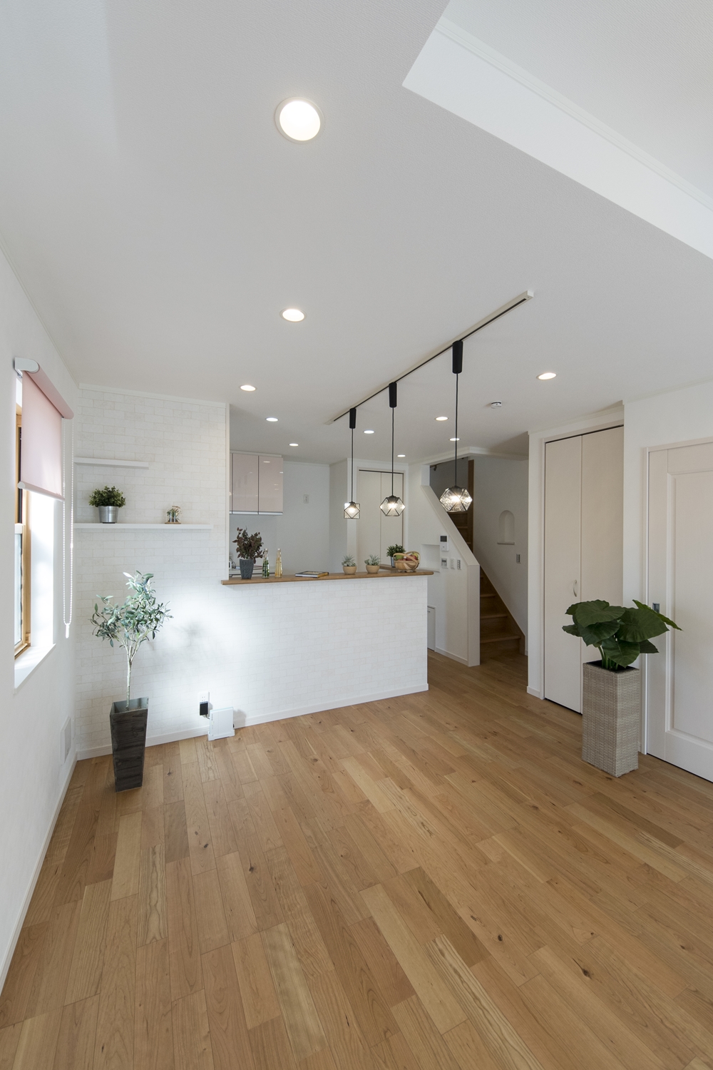 日中は窓からの光が部屋全体を包み込み、夜はダウンライトやおしゃれな照明が空間を彩ります。