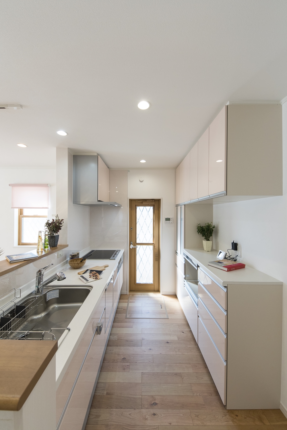 パステルカラーをアクセントにした明るく可愛らしい印象のキッチン。カップボードの扉カラーもキッチンとお揃いにしました♪