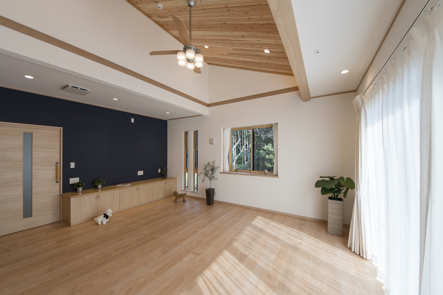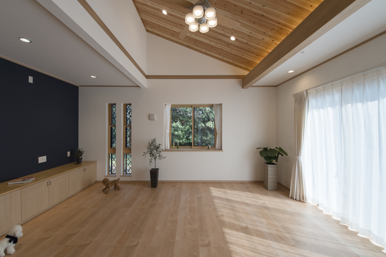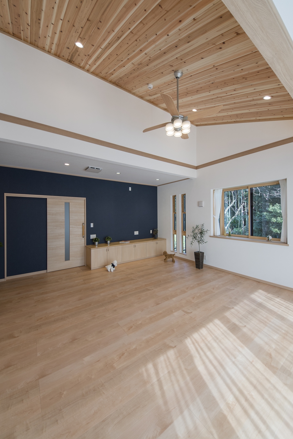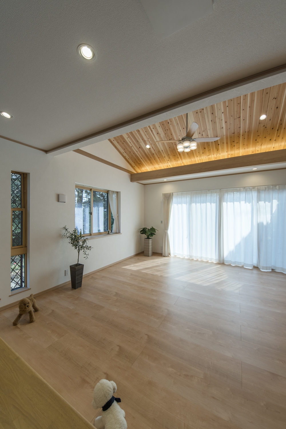 洋室/勾配天井に杉板を張り、間接照明を施しました。森林浴をしているような、やわらかい空間に仕上がりました。