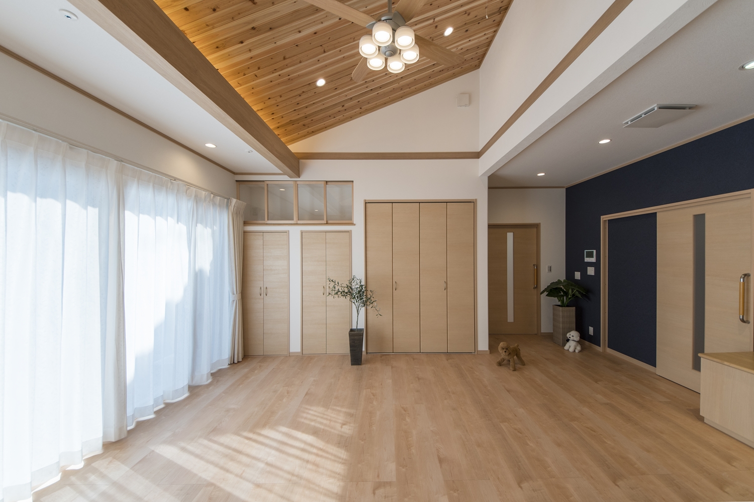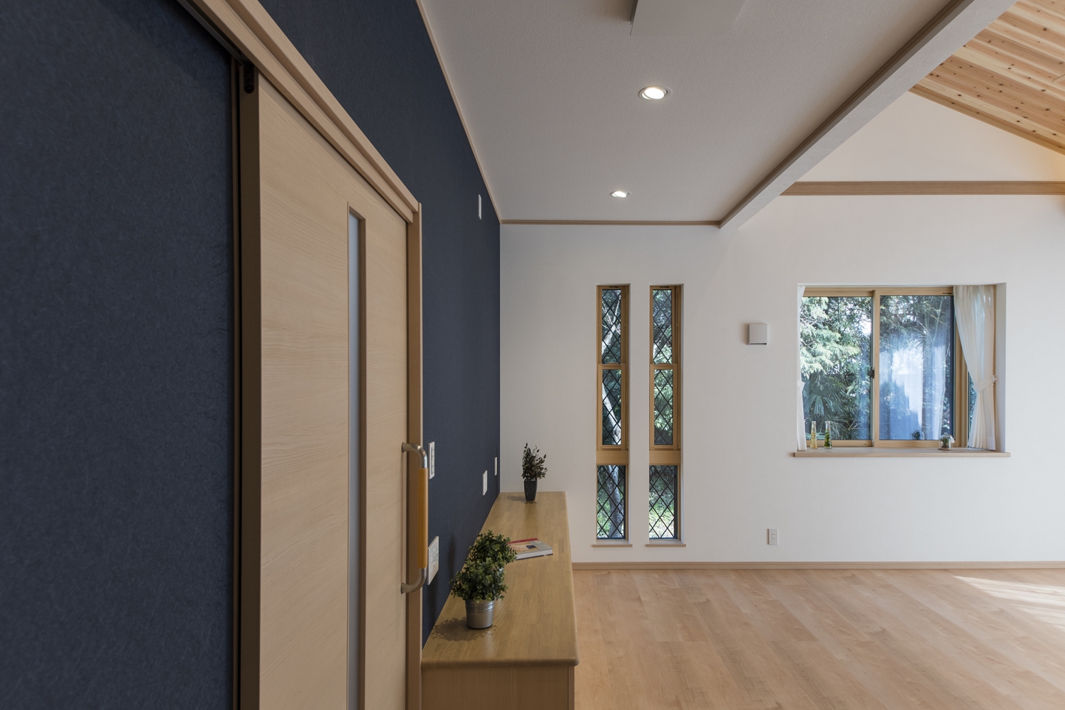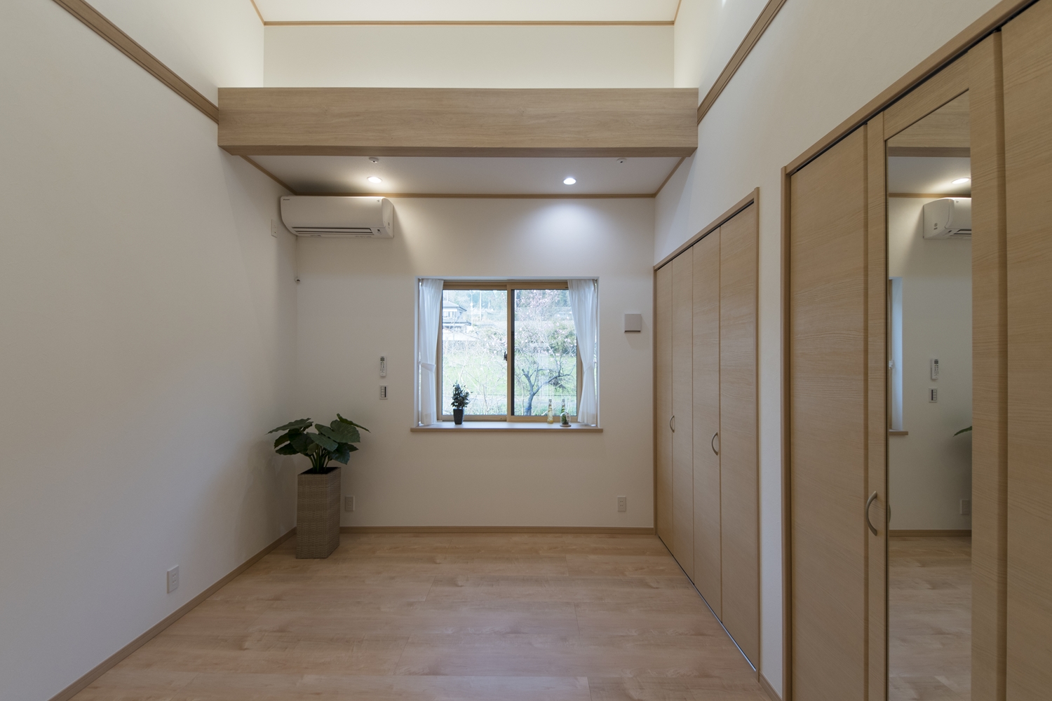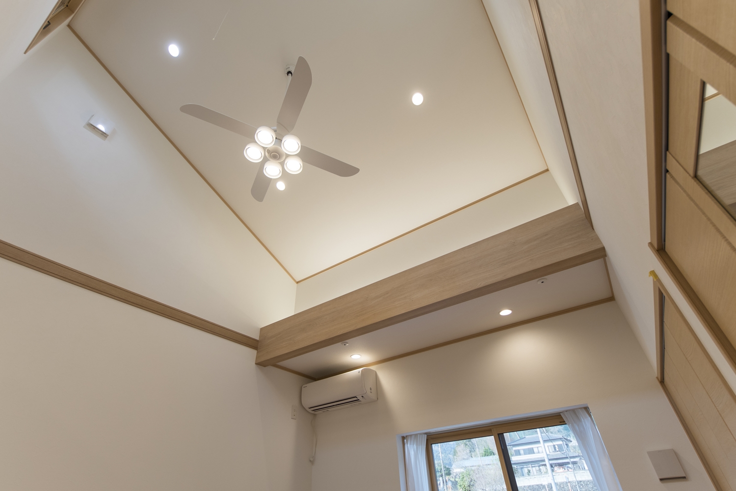 洋室/勾配天井に杉板を張り、間接照明を施しました。森林浴をしているような、やわらかい空間に仕上がりました。