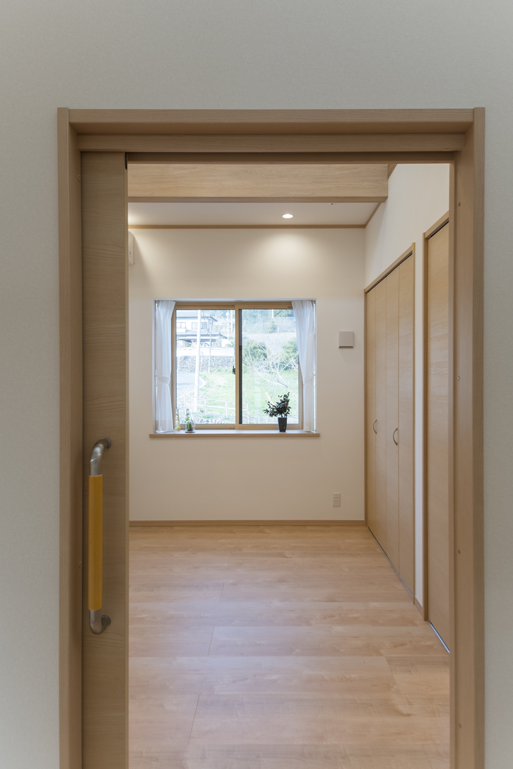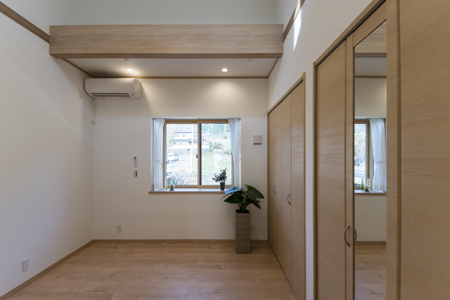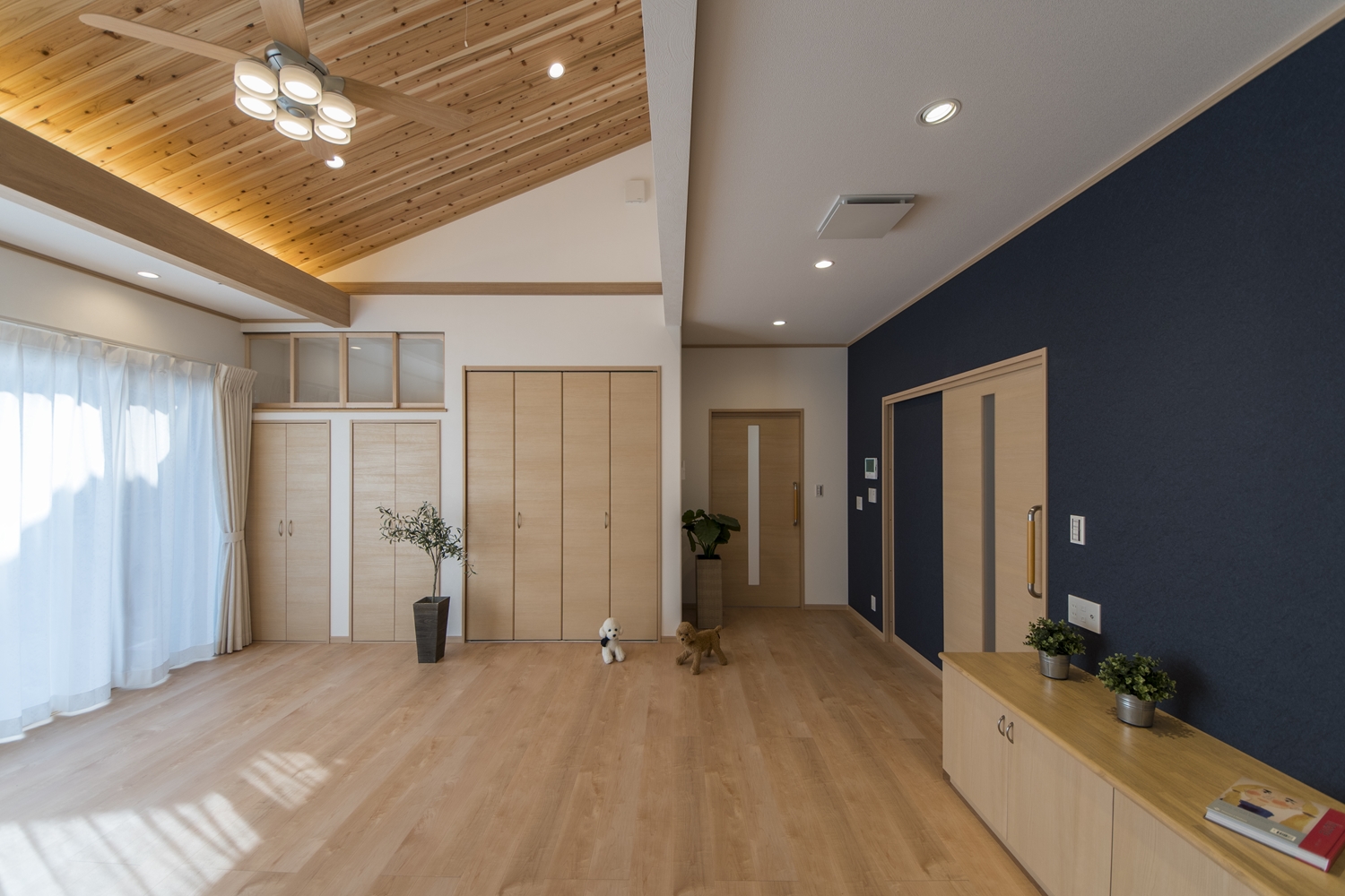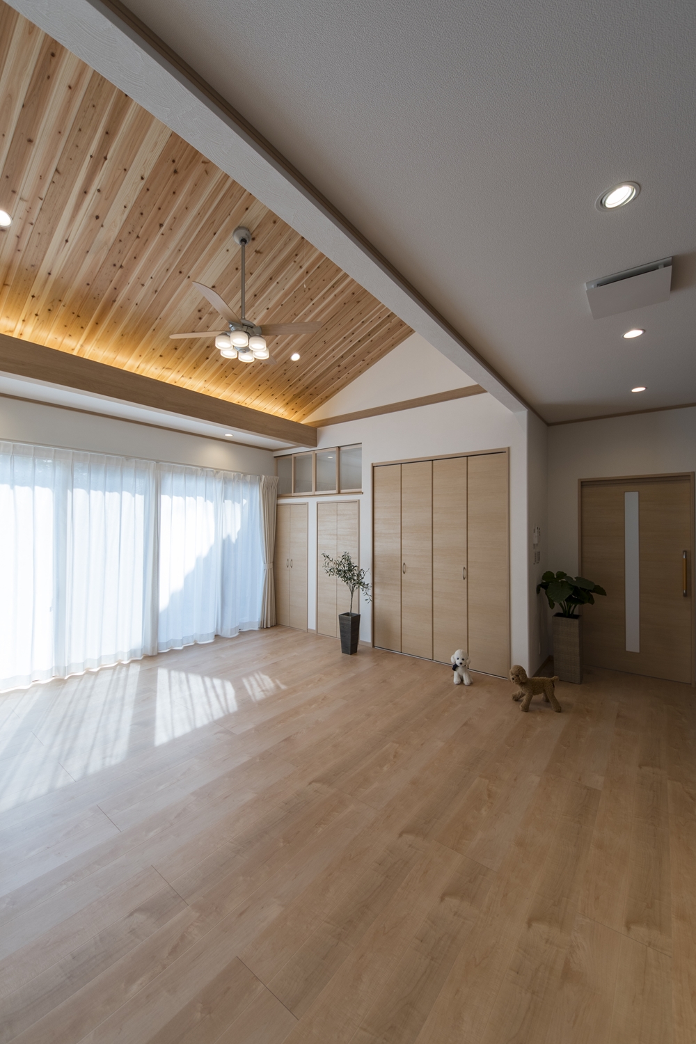 洋室/勾配天井に杉板を張り、間接照明を施しました。森林浴をしているような、やわらかい空間に仕上がりました。