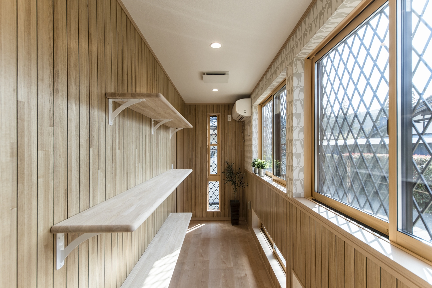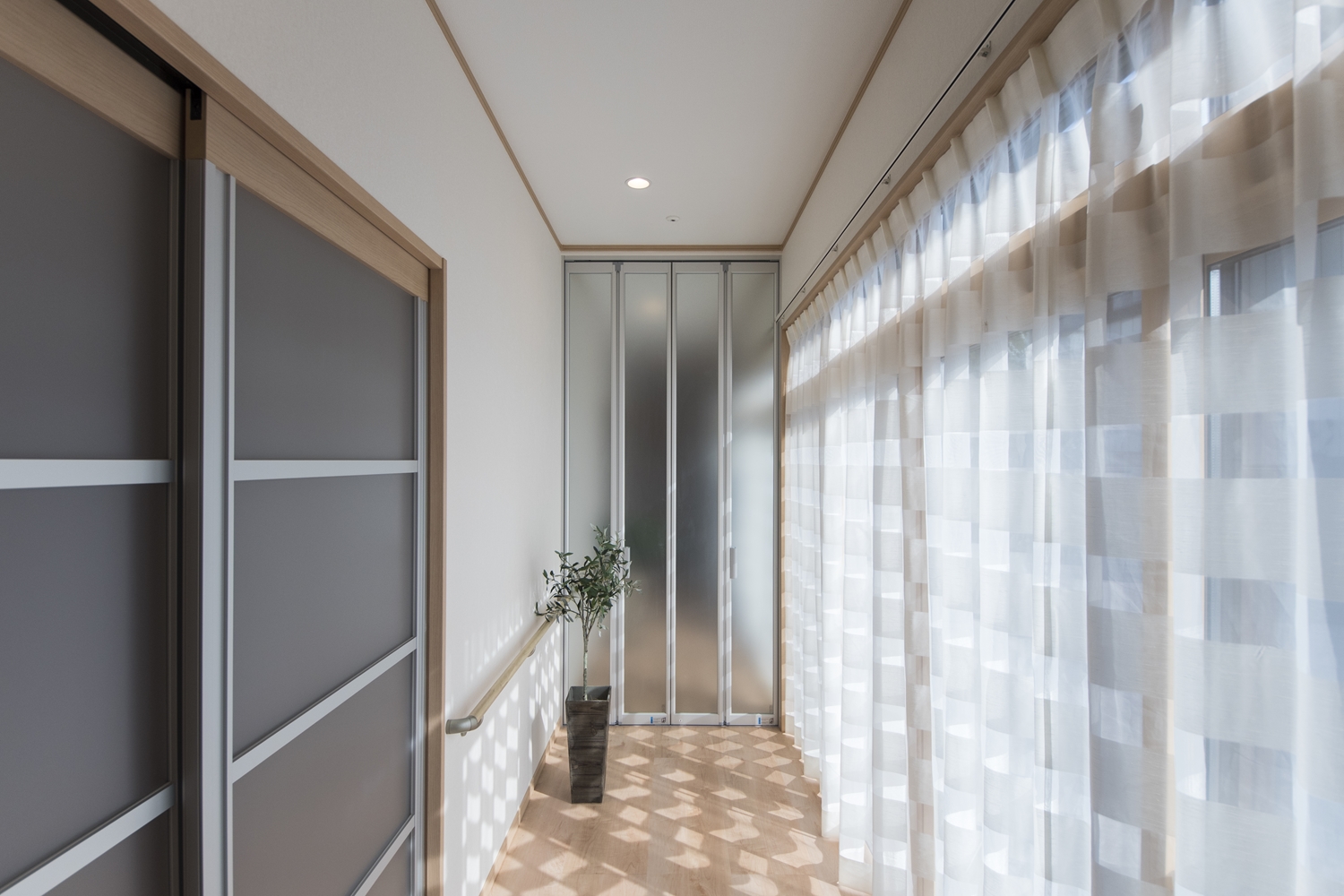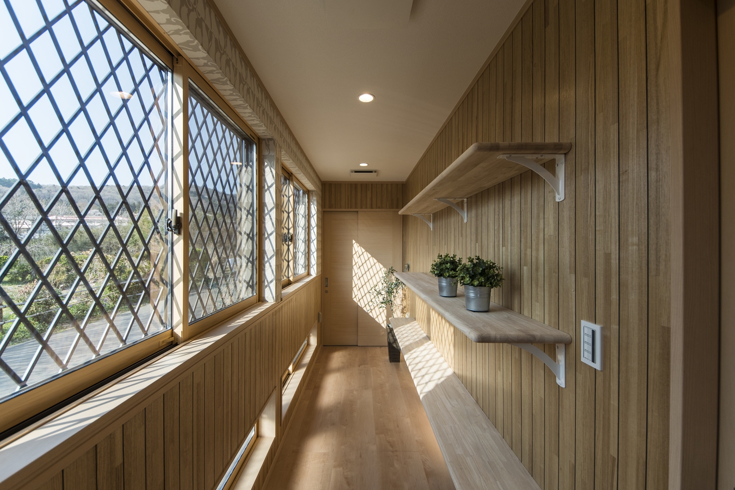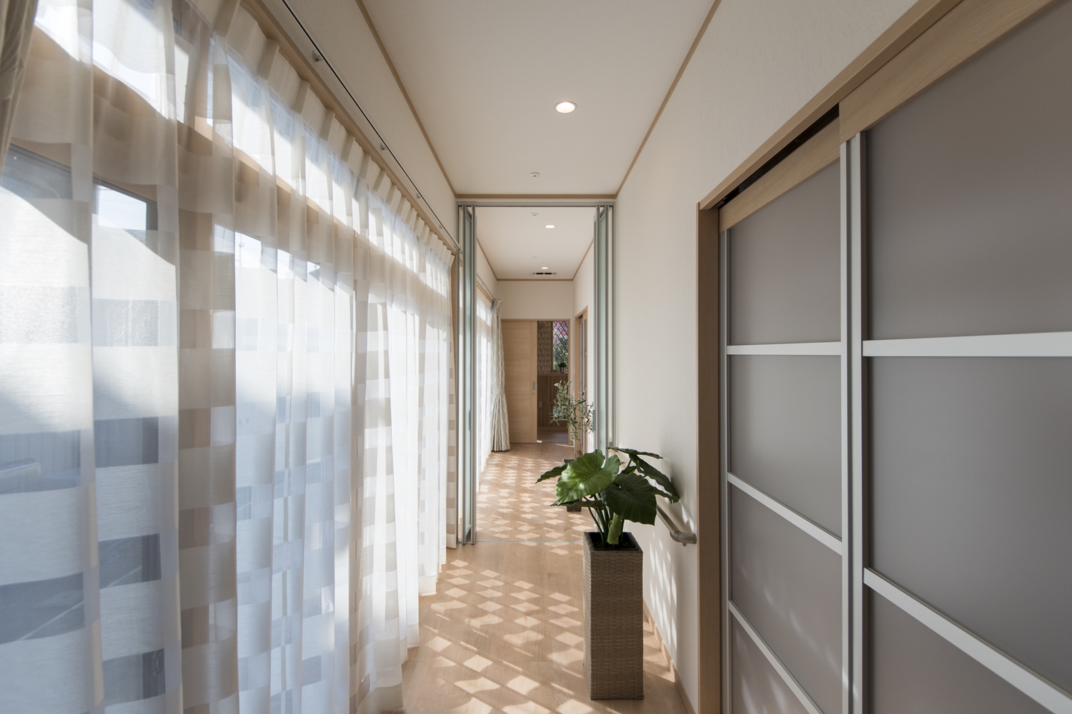お部屋をぐるっと囲む設計の廊下。特に南側の廊下は明るく光のあふれる場所。ちょっとしたテラスのような空間です。
