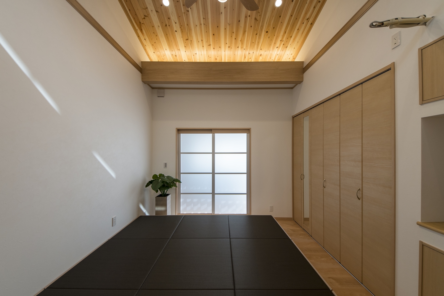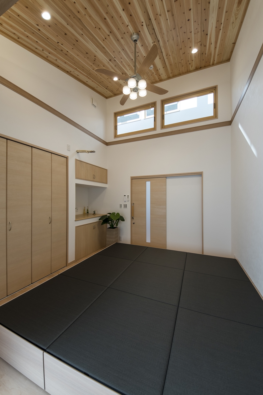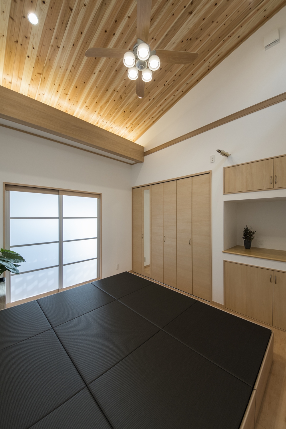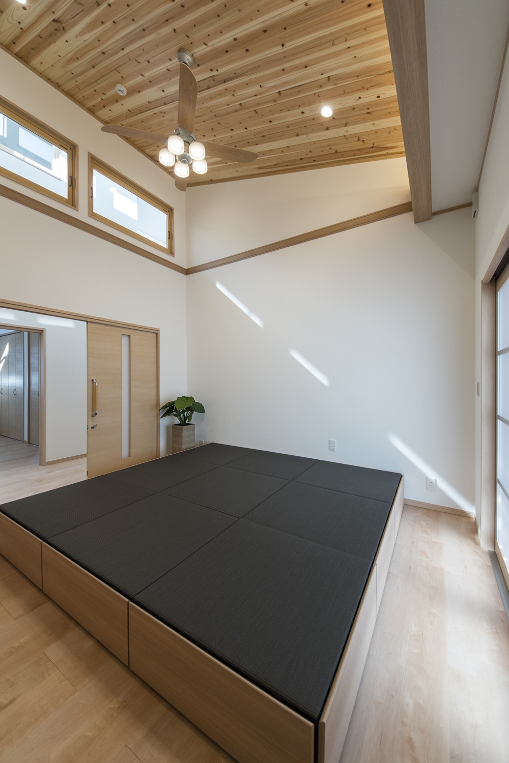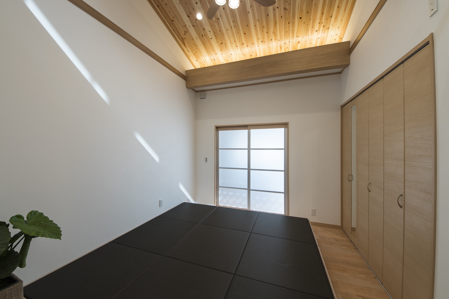 洋室/和モダンな畳収納を設置。チャコールグレーの畳の下は収納になっていて、ベッドとしても使用可能です。