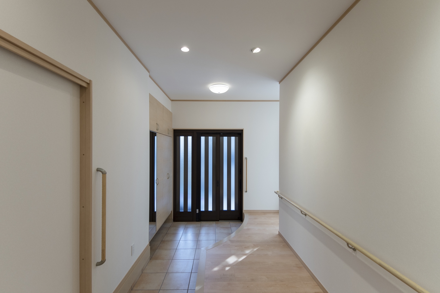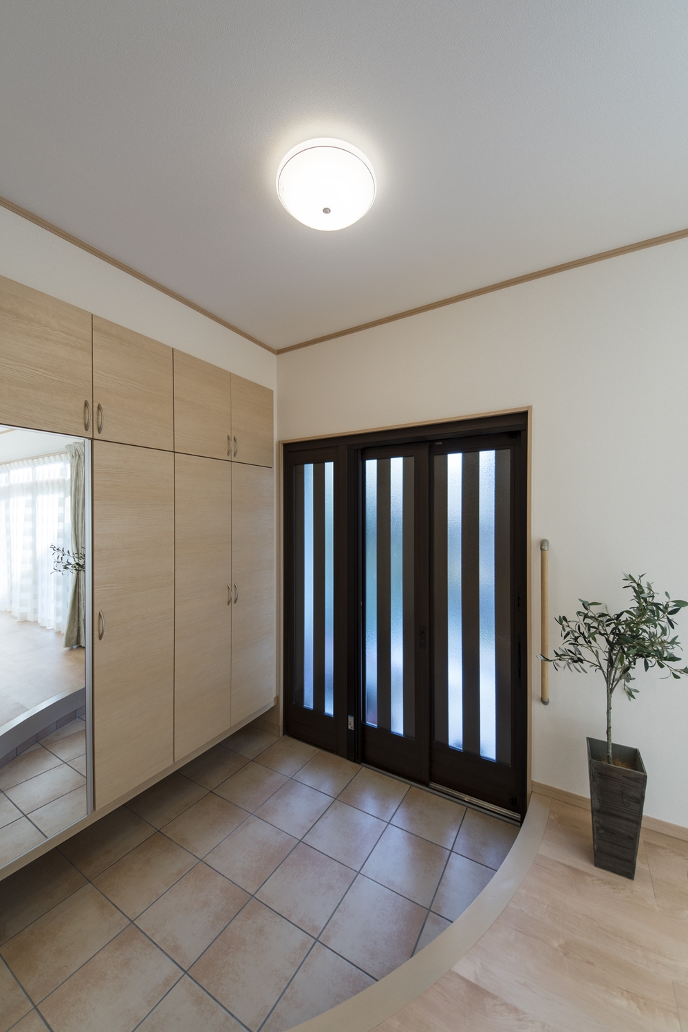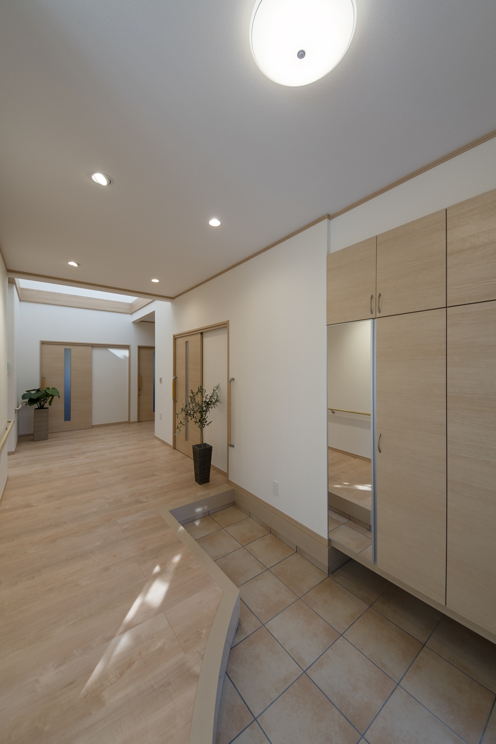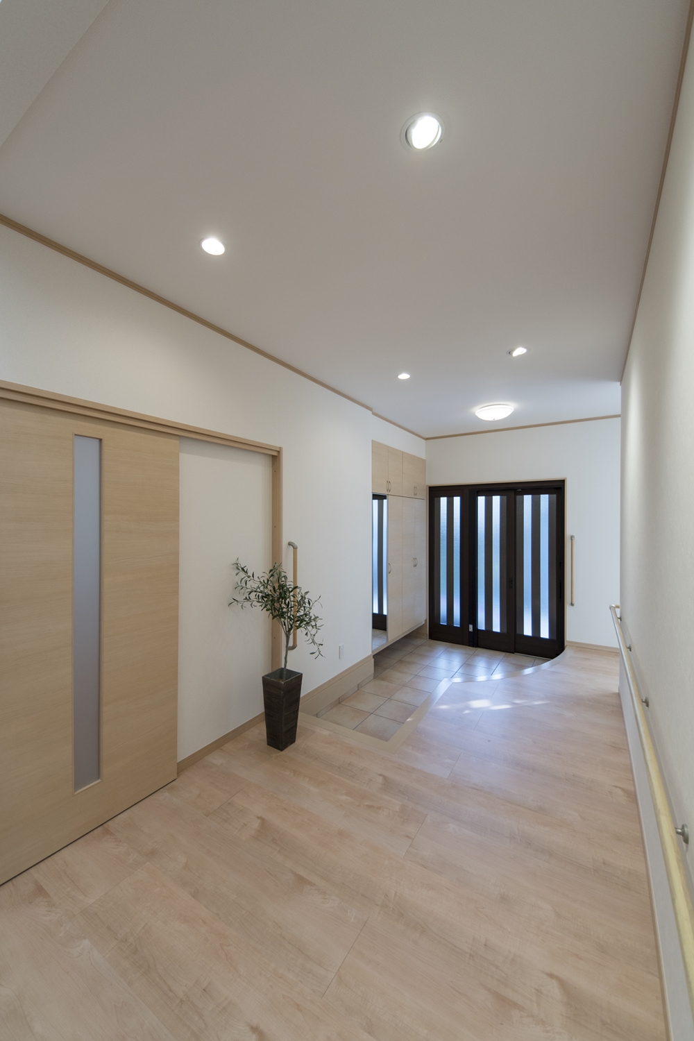 広々とした玄関ホール。壁の中にシューズボックスを埋め込んでフラットにして、スッキリと魅せました。