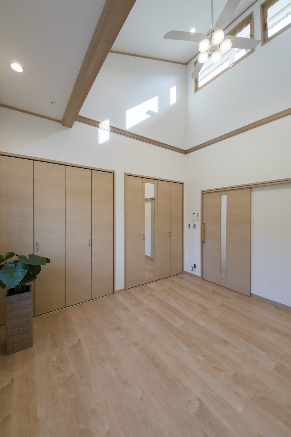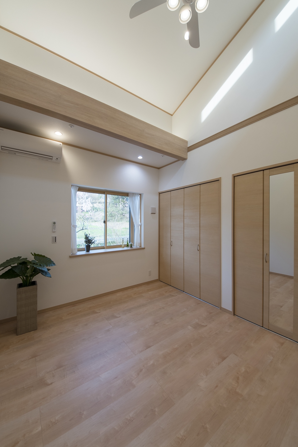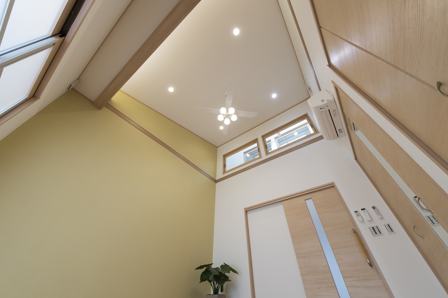洋室/勾配天井と高い位置に窓を設えた光のあふれる空間。