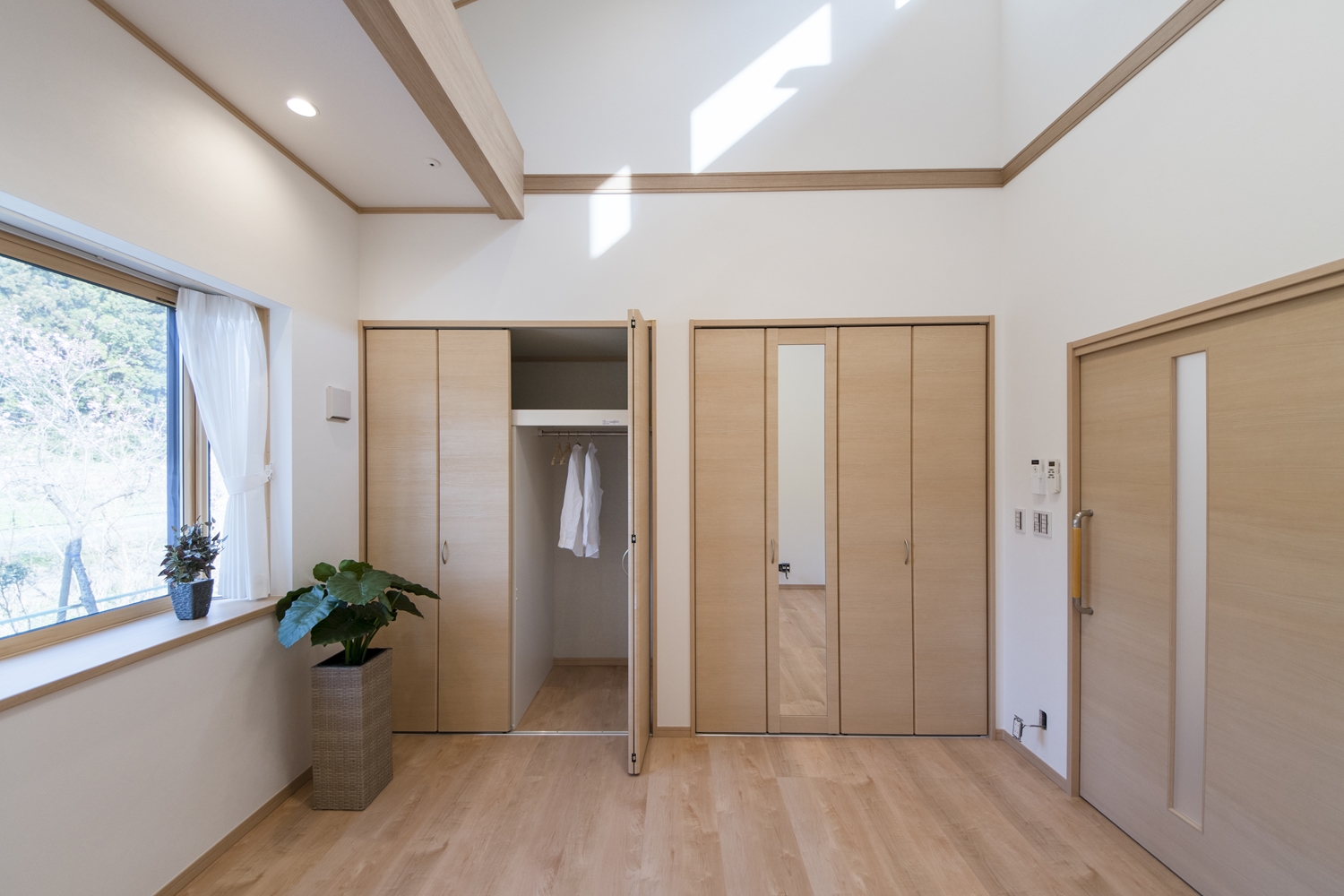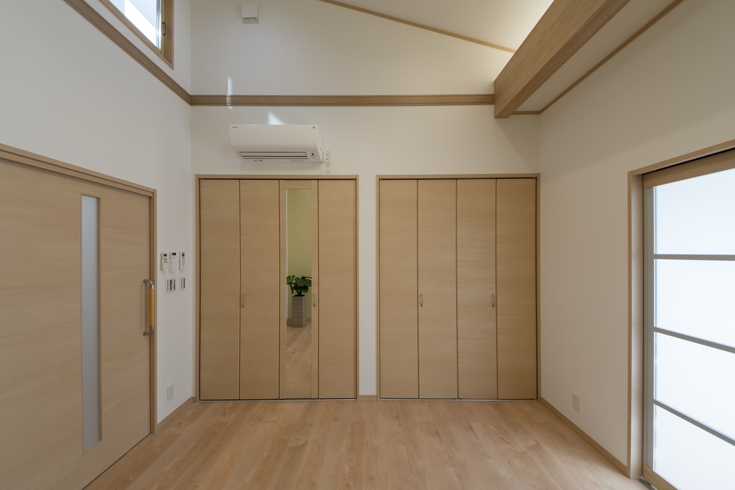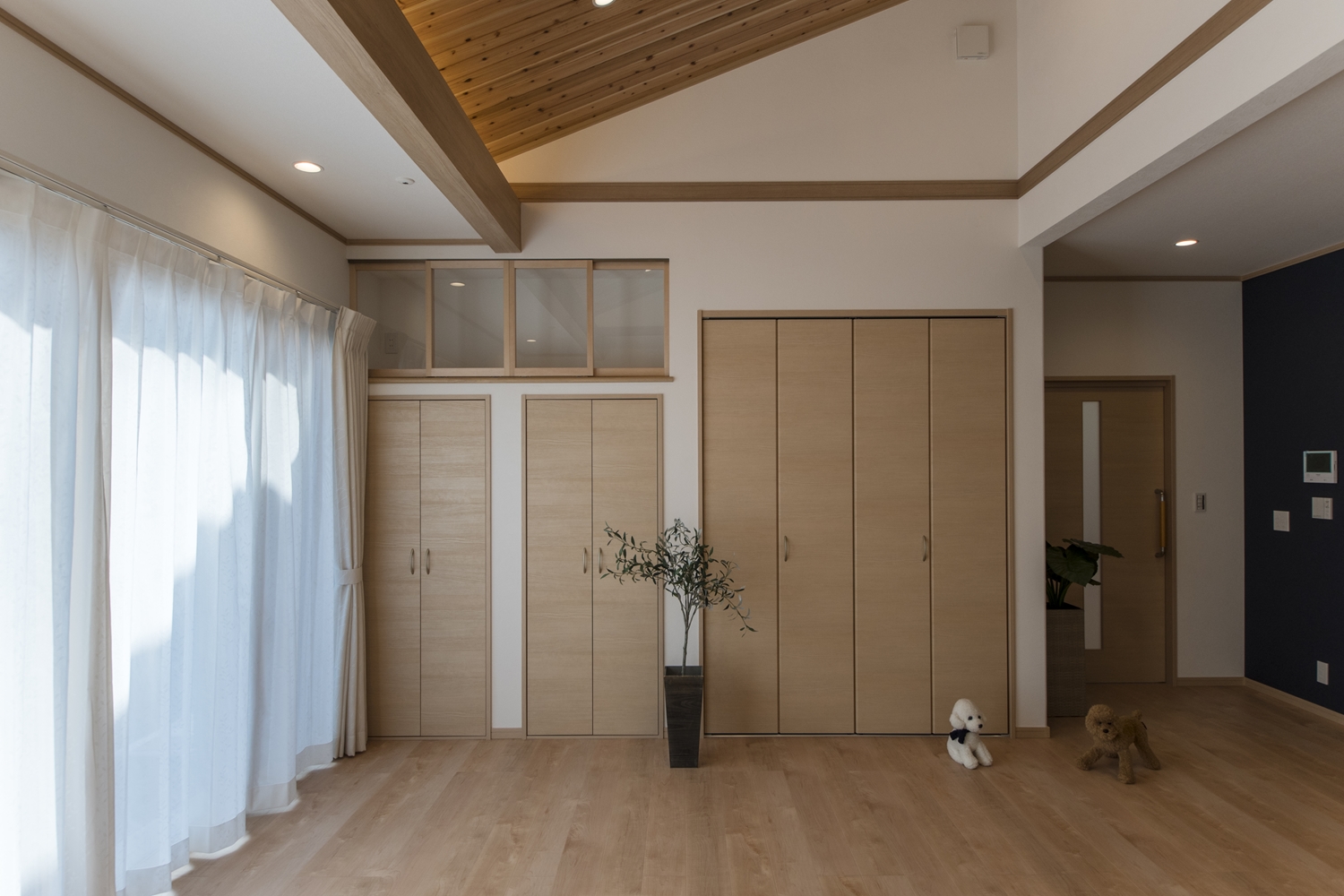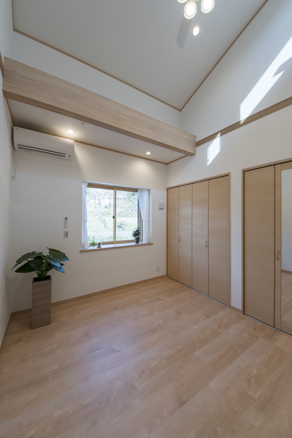 洋室/勾配天井と高い位置に窓を設えた光のあふれる空間。