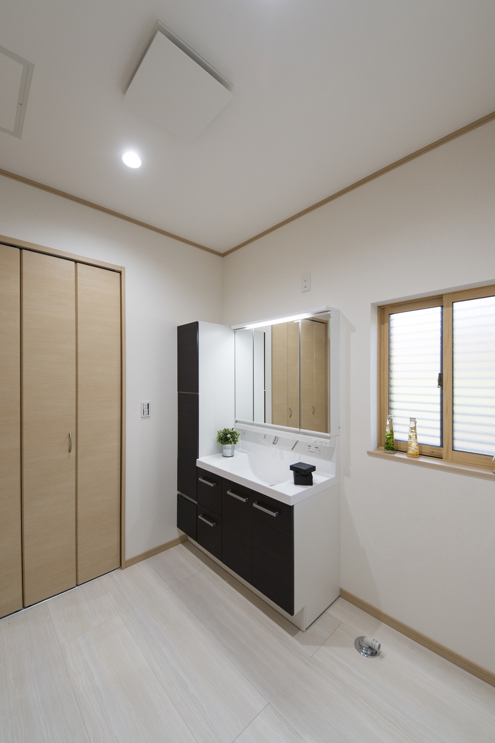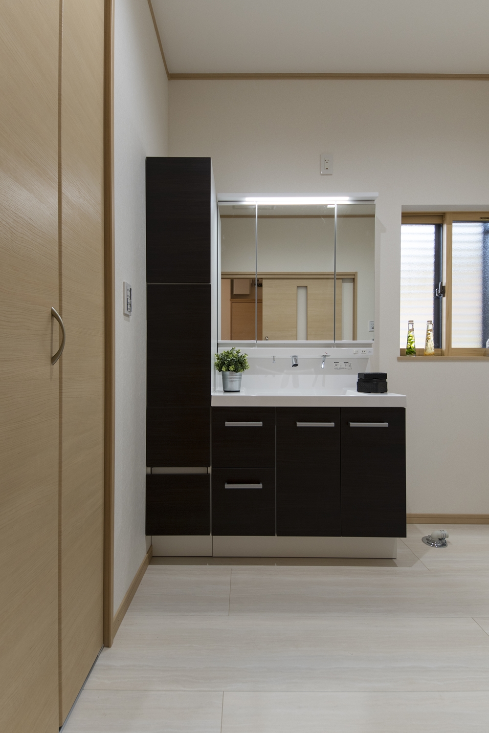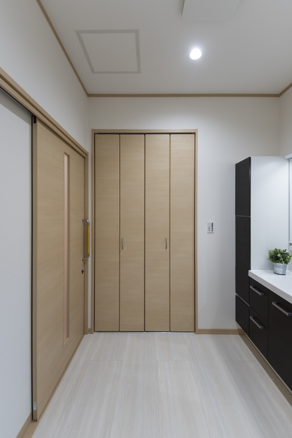 タオルや洗剤等をたっぷり収納できる扉付のリネン棚を設置したサニタリールーム。