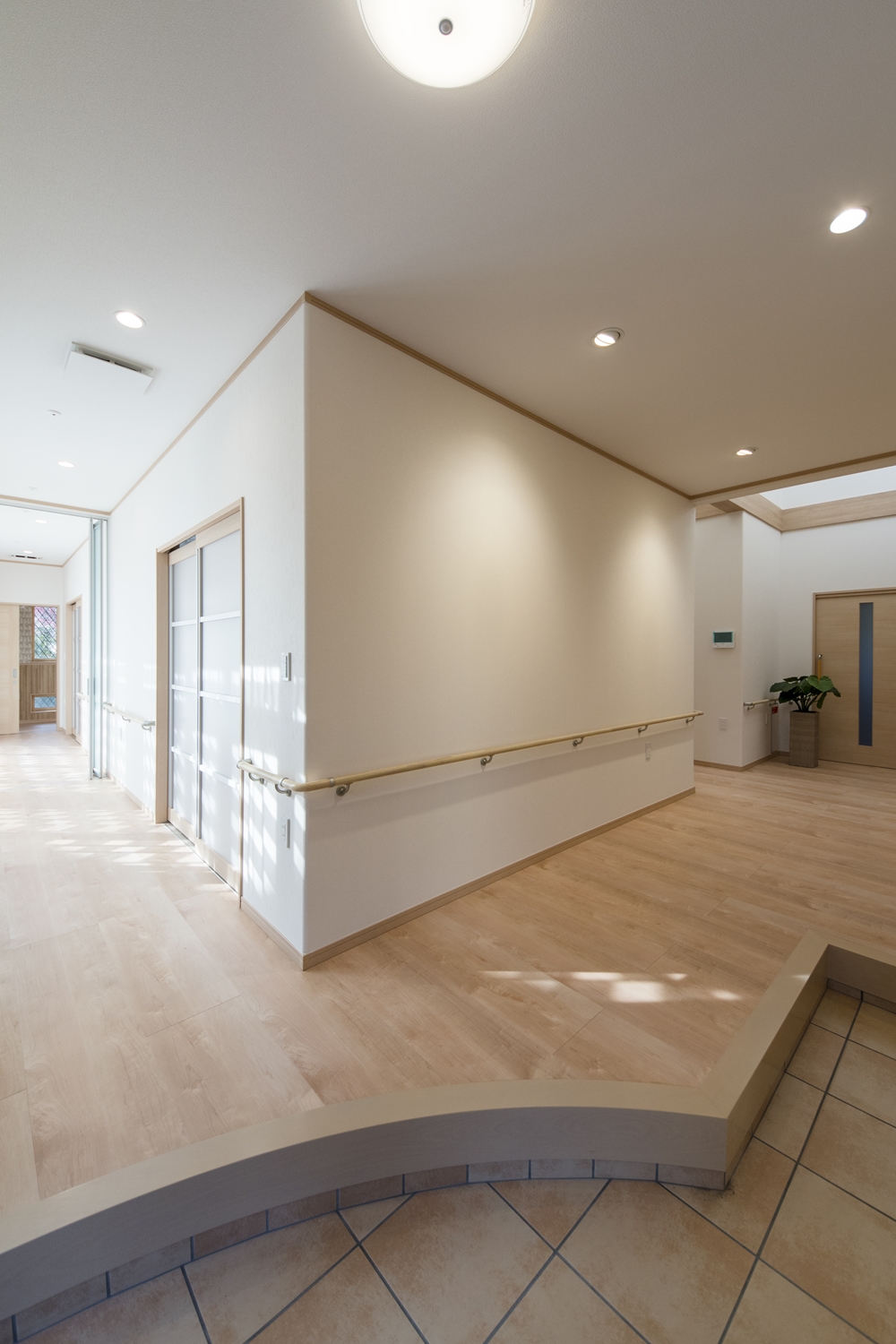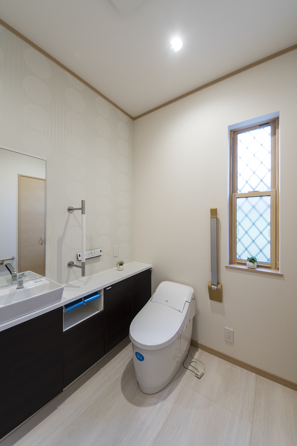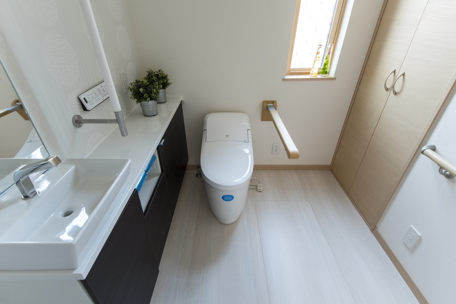 広々としたトイレ。手すり設置で安全で快適な暮らしをサポート。跳ね上げ式の手摺は空間の有効利用及び利用者様の自立を支援し、使わない時は上にたためます。