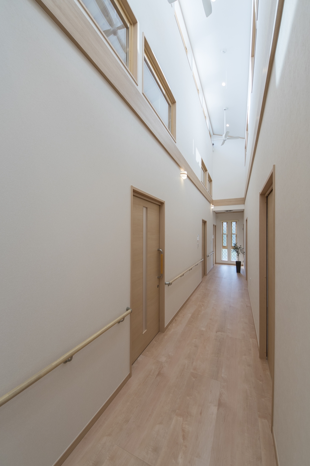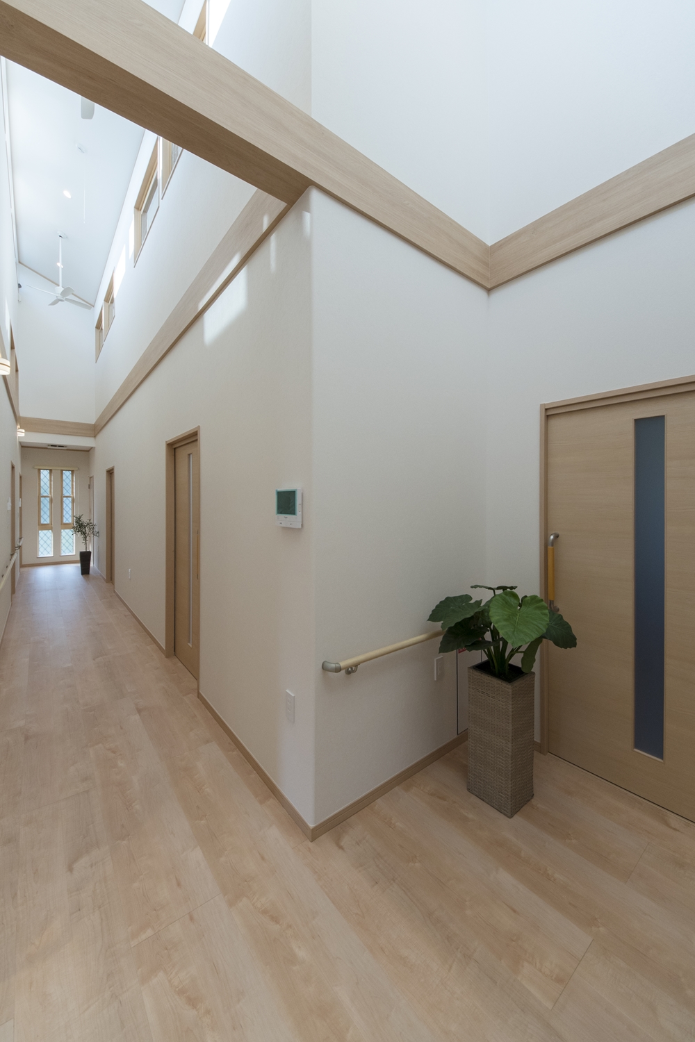 お部屋をぐるっと囲む設計の廊下。天井は勾配天井になっていて、窓から光が降り注ぐ開放的で贅沢な空間です。
