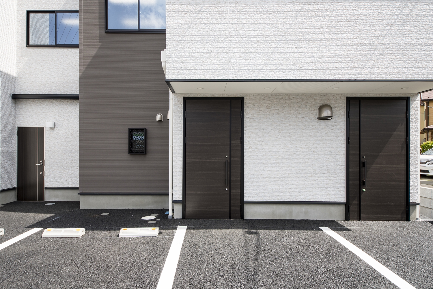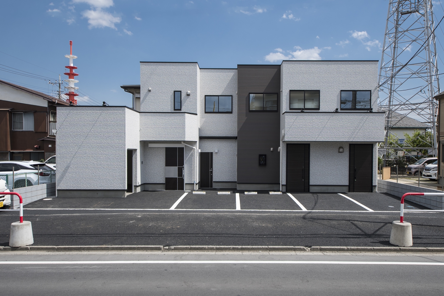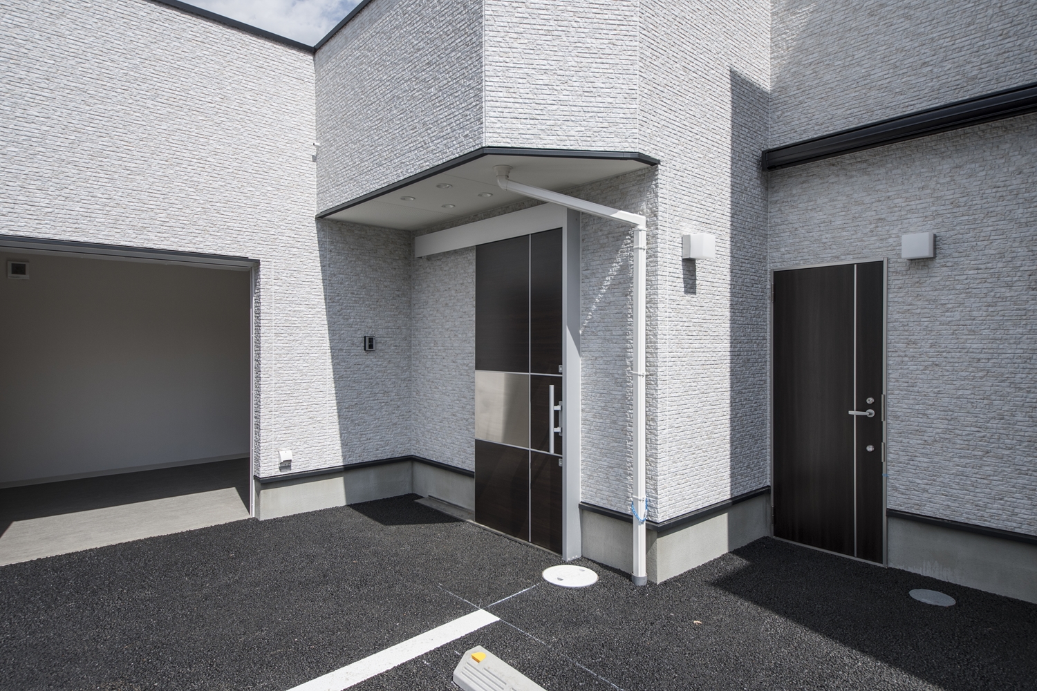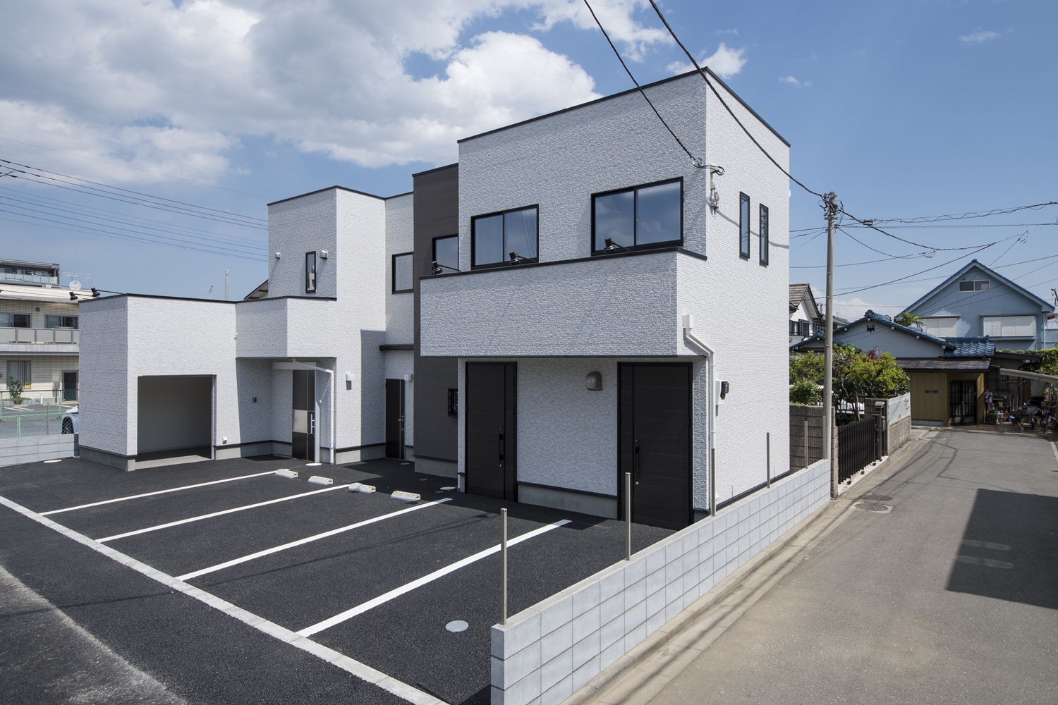 白をベースにモノトーン系カラーをアクセントにした外壁、四角形を組み合わせたフォルム。スタイリッシュなデザインの事務所が完成しました。