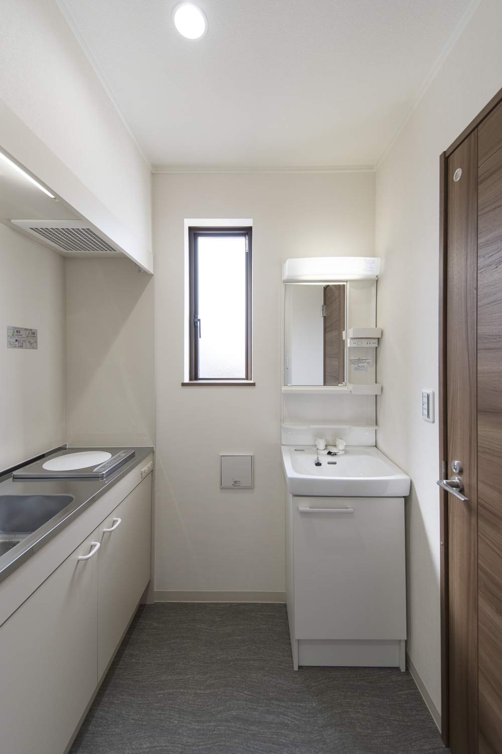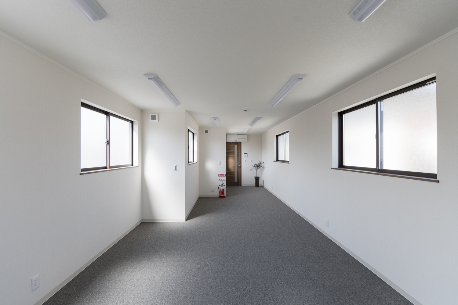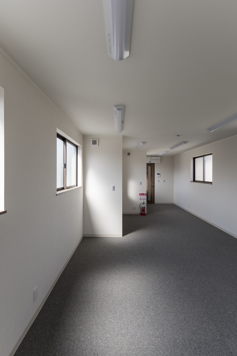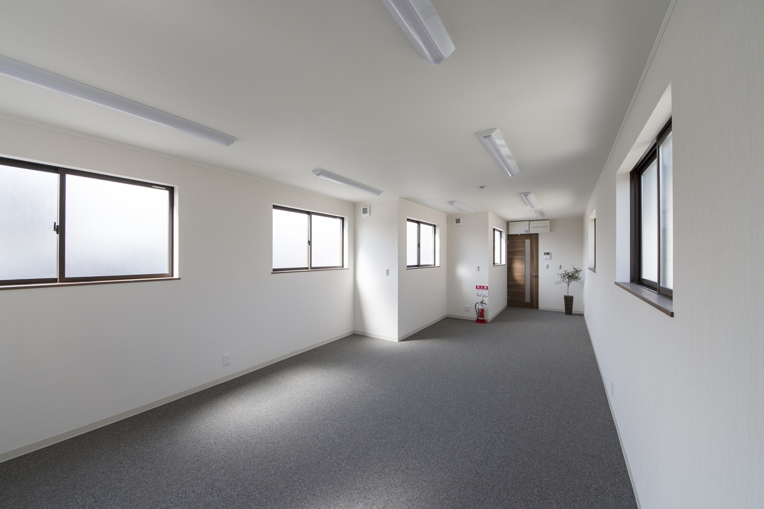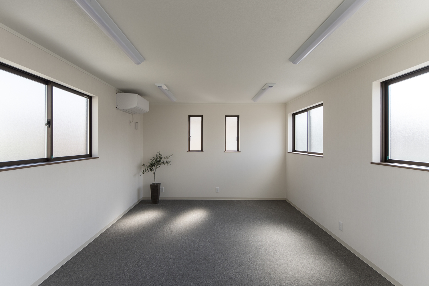 白をベースにモノトーン系カラーをアクセントにした外壁、四角形を組み合わせたフォルム。スタイリッシュなデザインの事務所が完成しました。