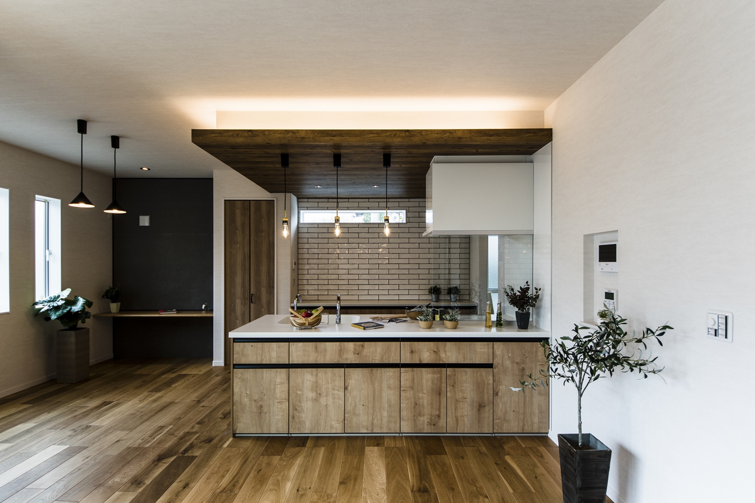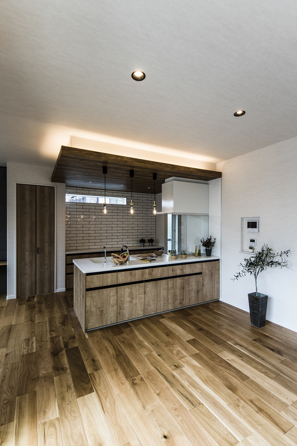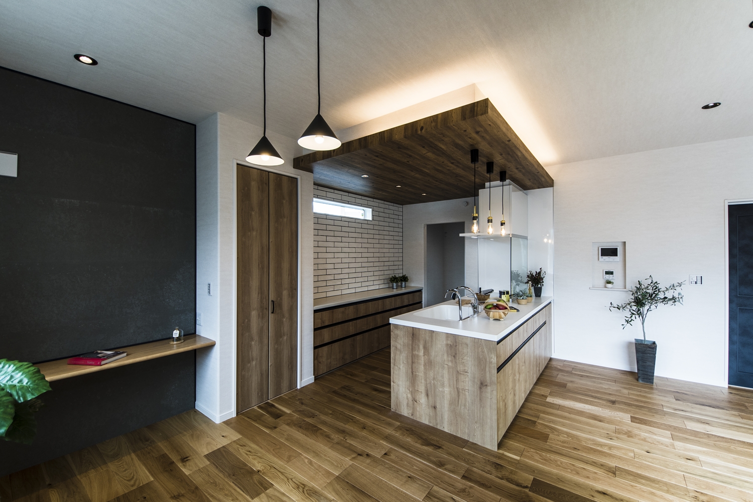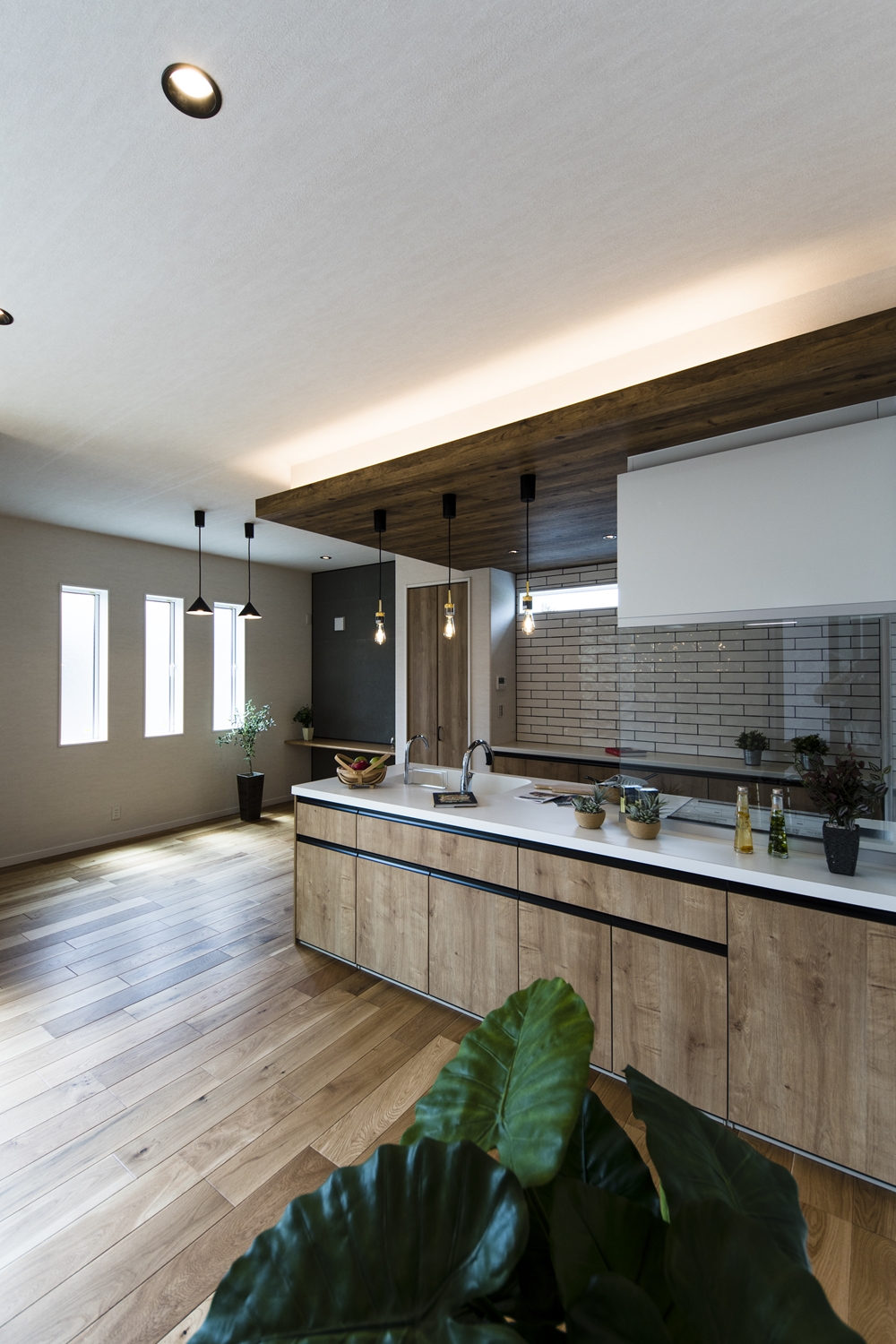 ウッドテイストの下がり天井が空間を仕切り、キッチン全体を引き締めます。魅力的な多灯照明がくつろぎと温もりを与えます。
