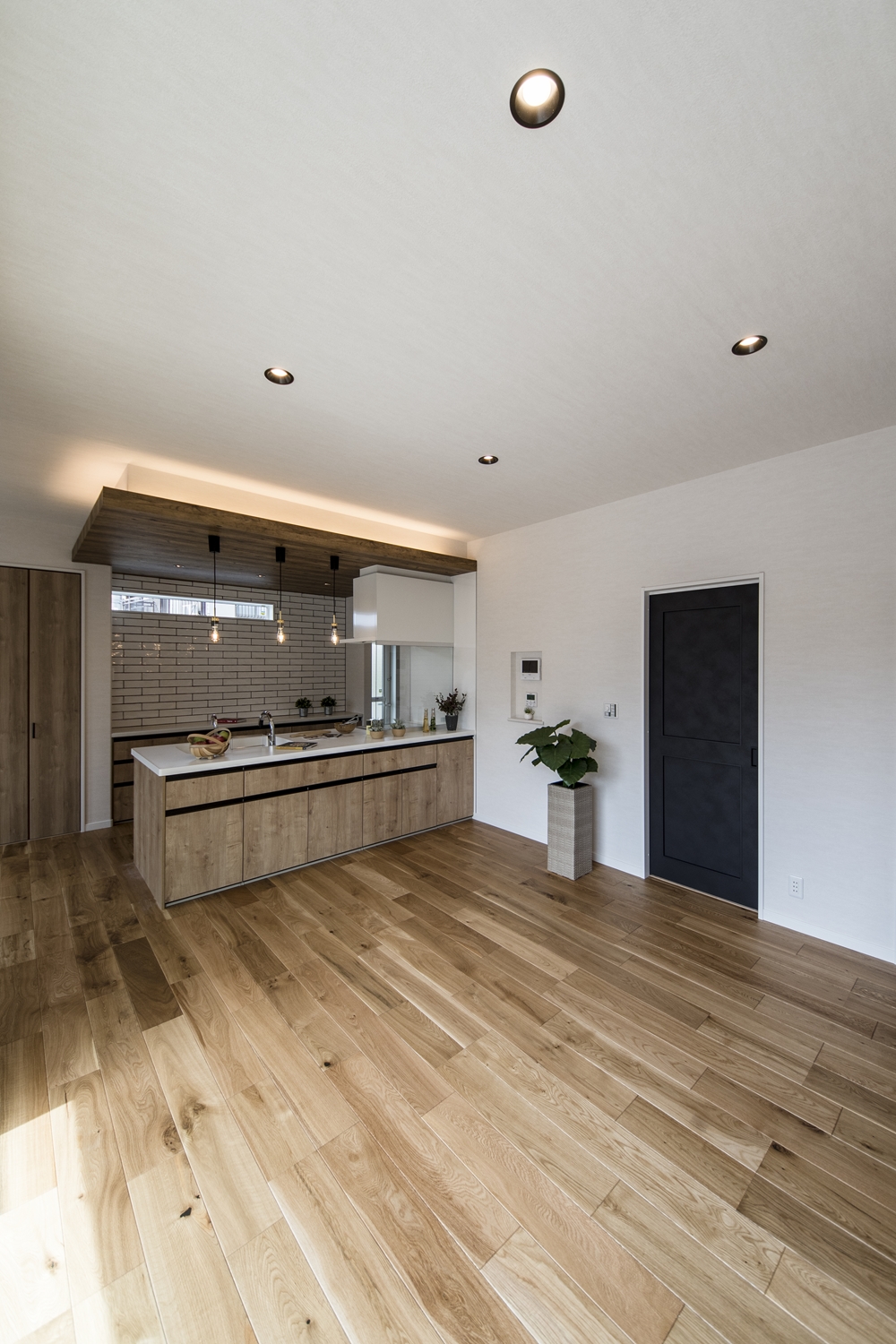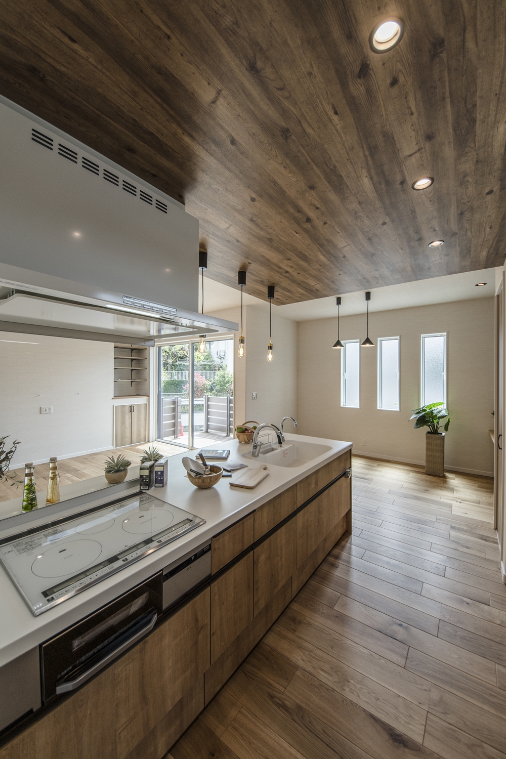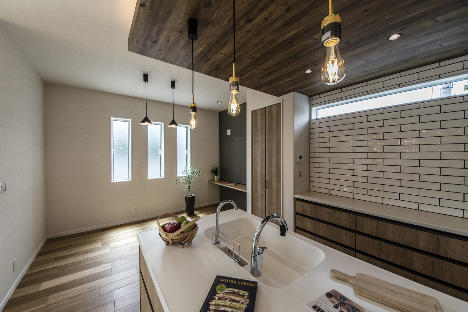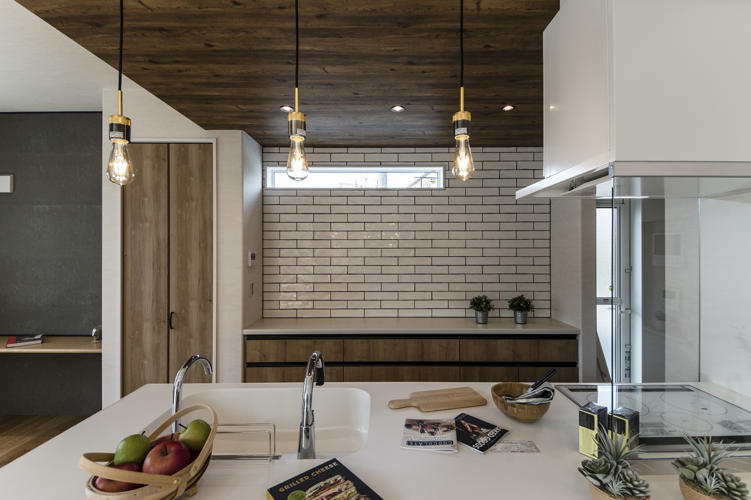 ウッドテイストの下がり天井が空間を仕切り、キッチン全体を引き締めます。魅力的な多灯照明がくつろぎと温もりを与えます。