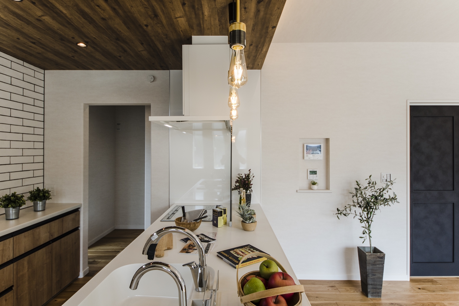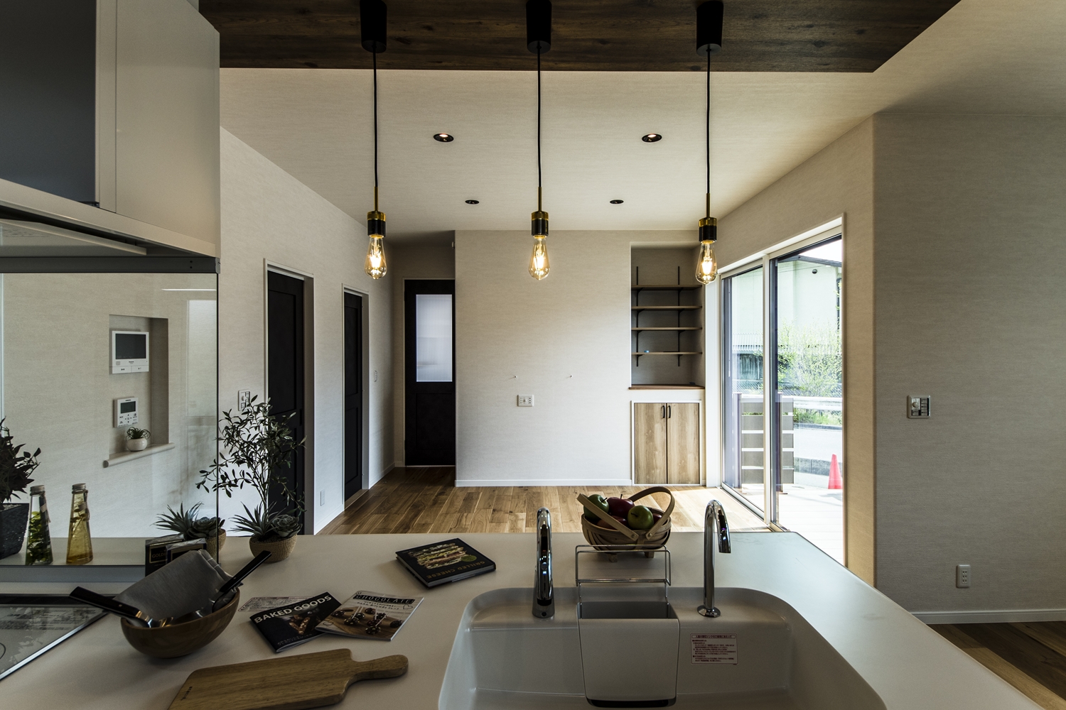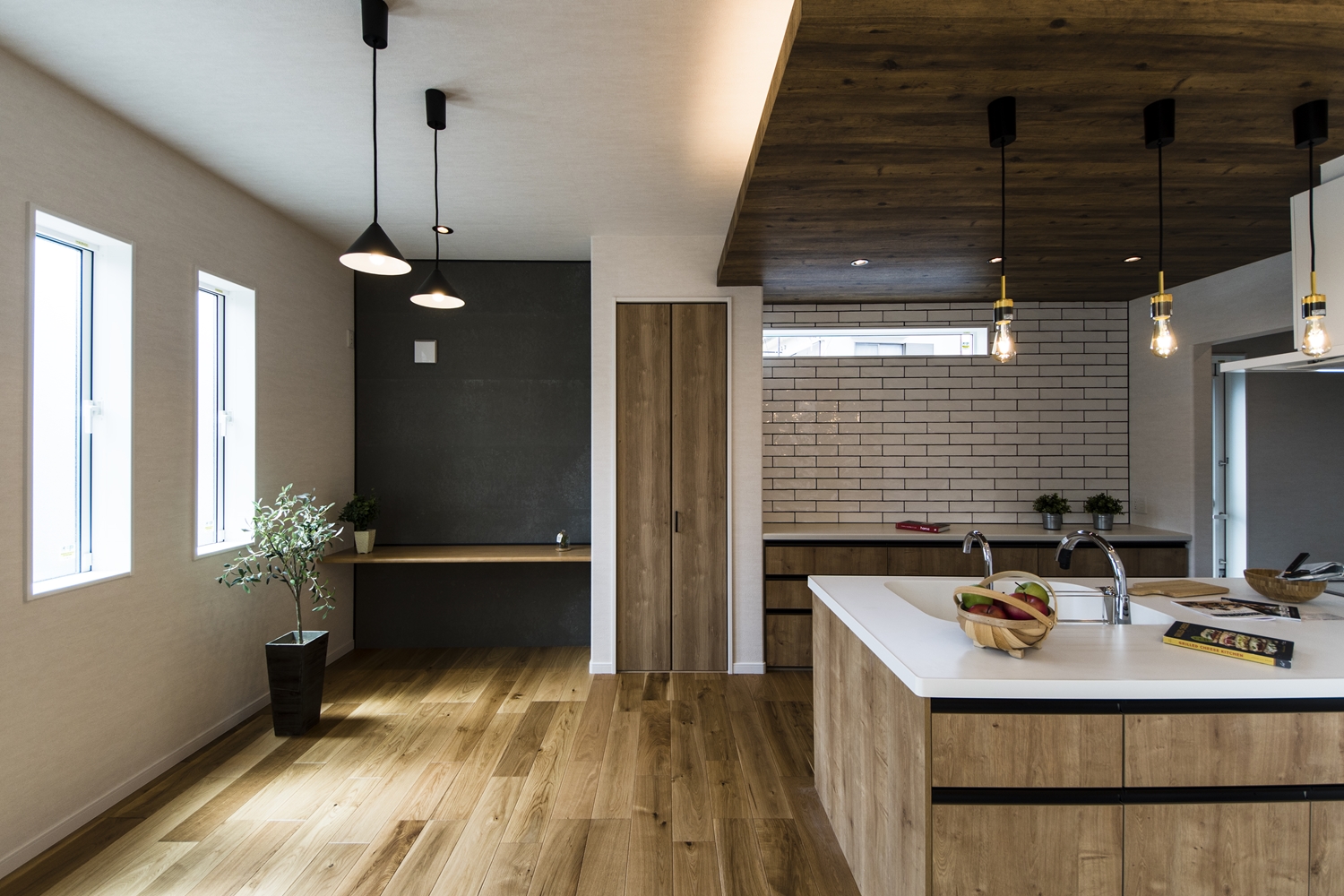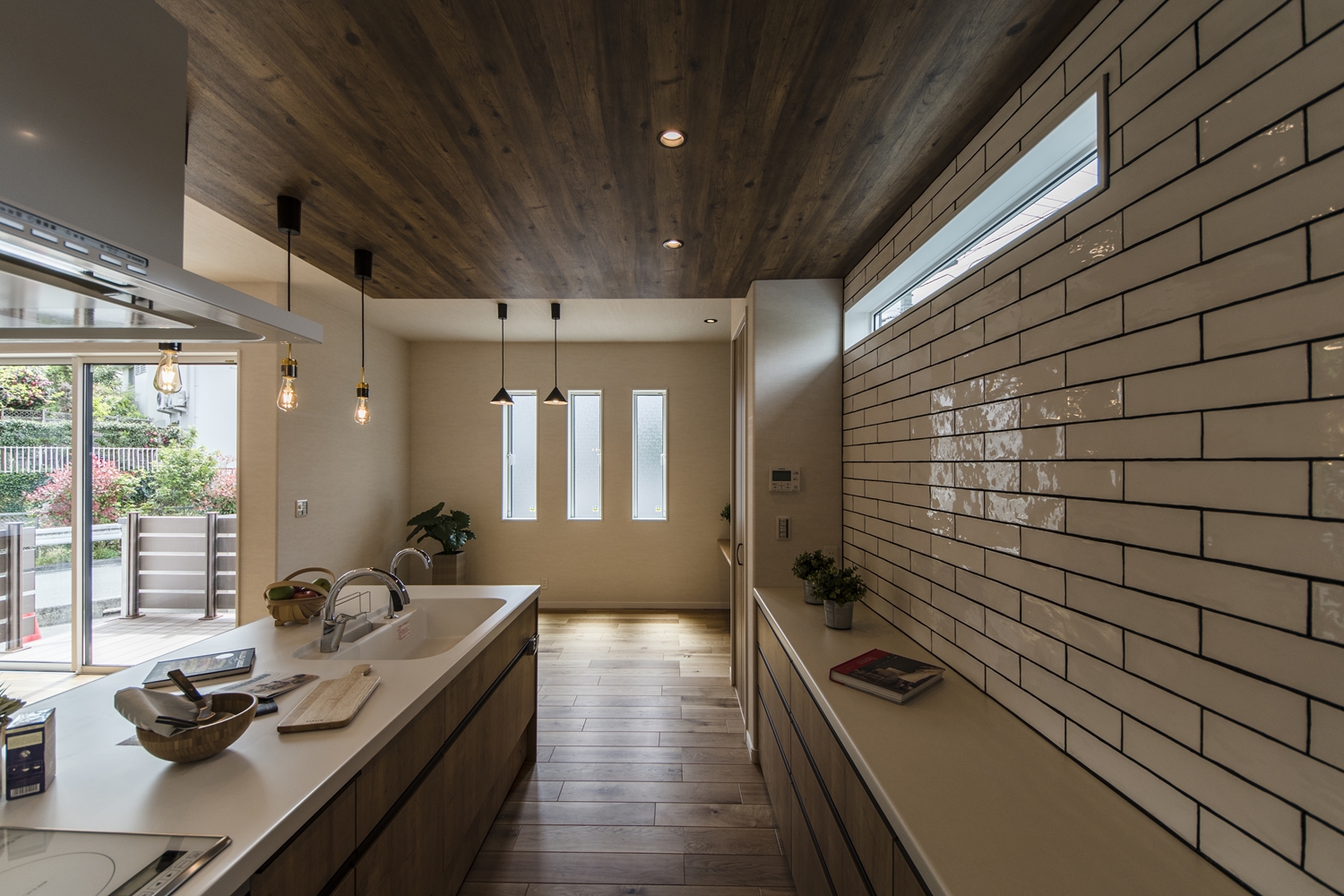 ウッドテイストの下がり天井が空間を仕切り、キッチン全体を引き締めます。魅力的な多灯照明がくつろぎと温もりを与えます。