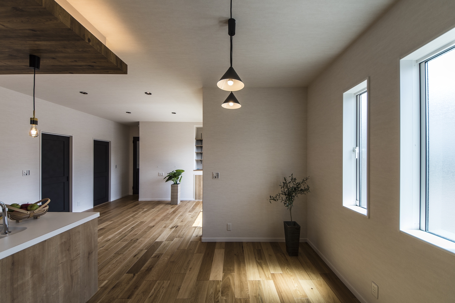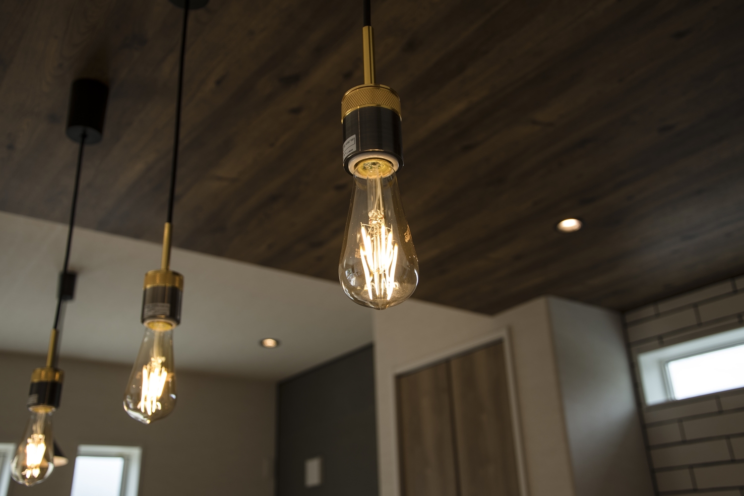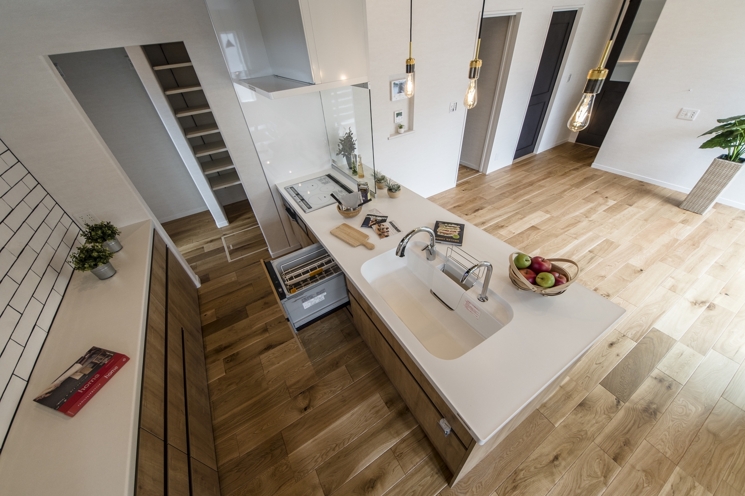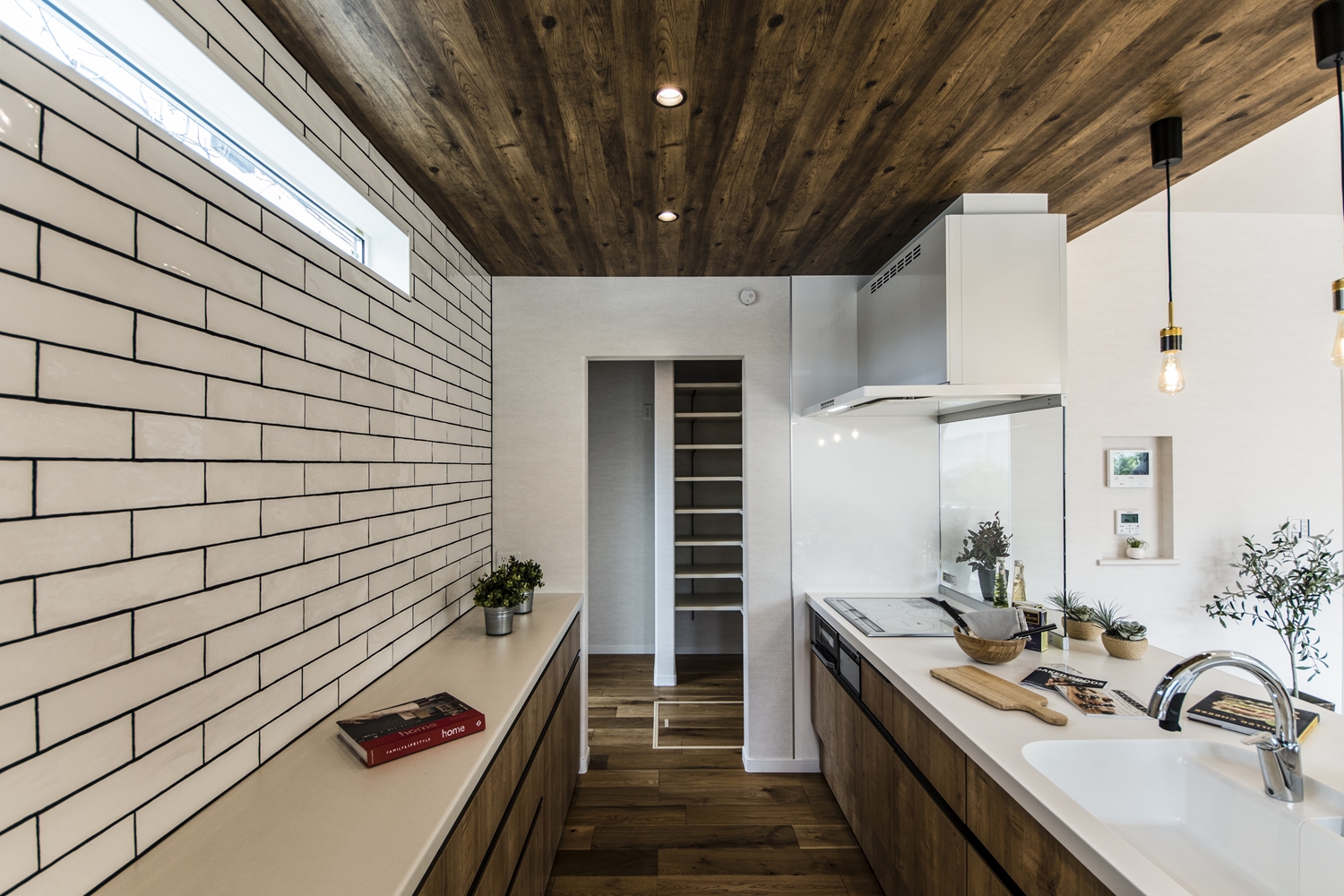 ウッドテイストの下がり天井が空間を仕切り、キッチン全体を引き締めます。魅力的な多灯照明がくつろぎと温もりを与えます。
