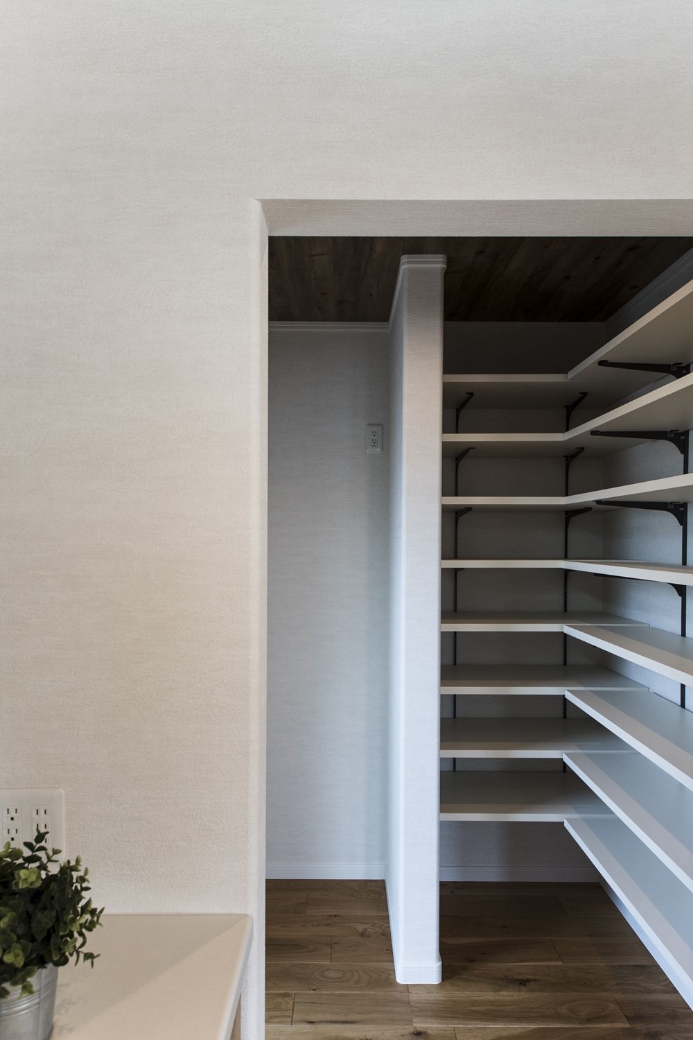 キッチンの奥に、パントリーと冷蔵庫スペースを造りました。ゲストからは見えない位置にあるので、キッチンがとってもスッキリです!!