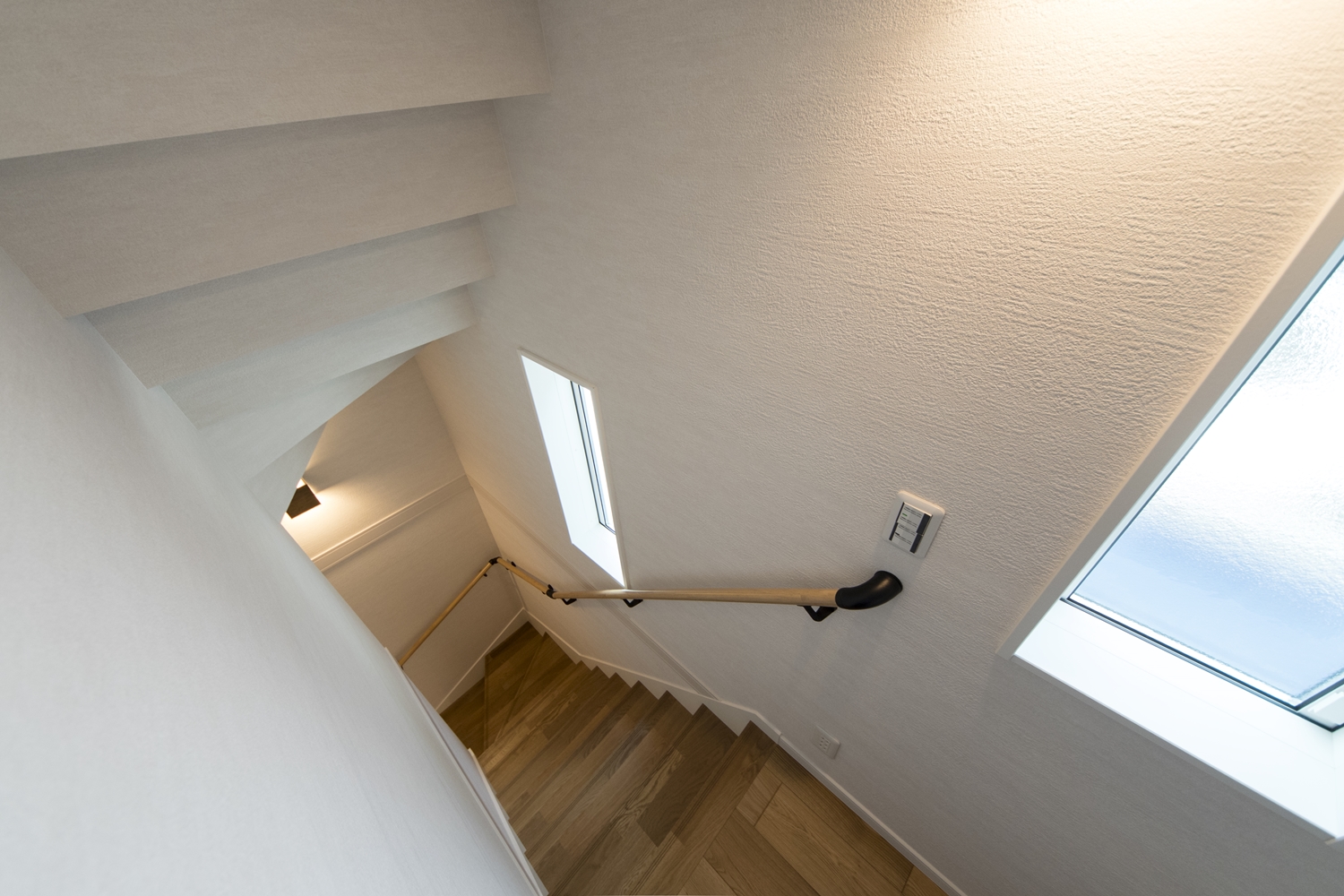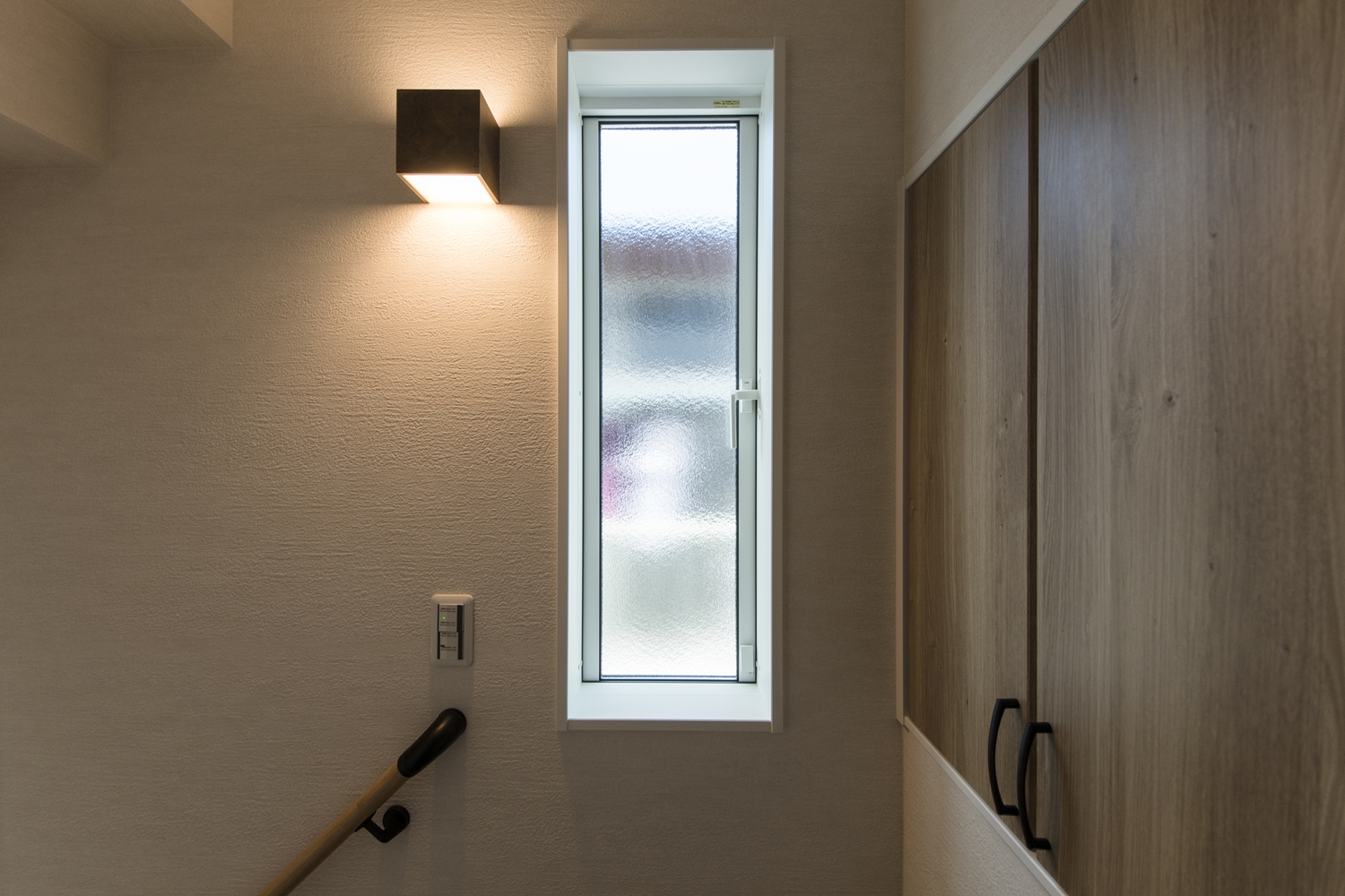 窓からの自然光とブラケットライトのやわらかい光が階段を照らします。