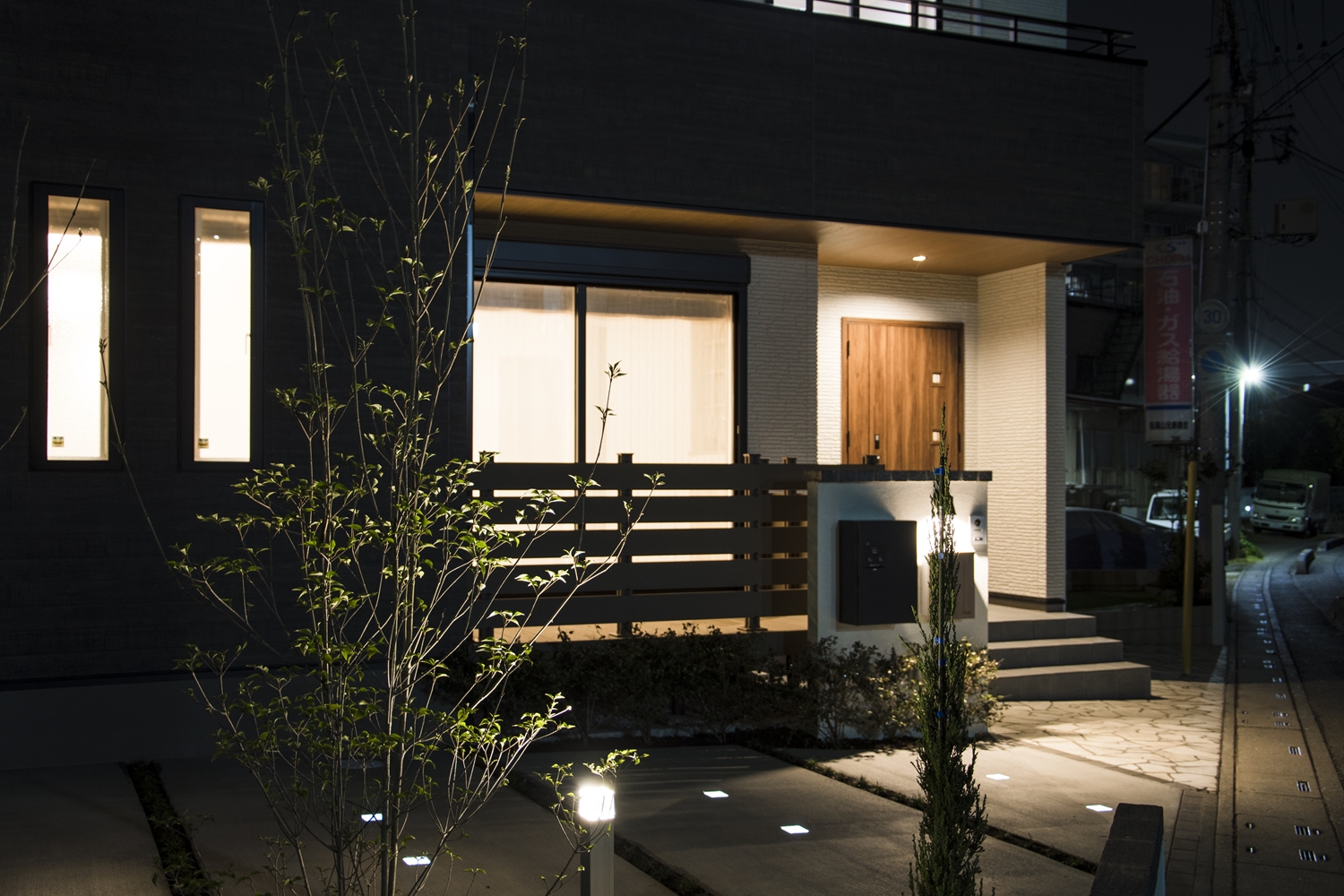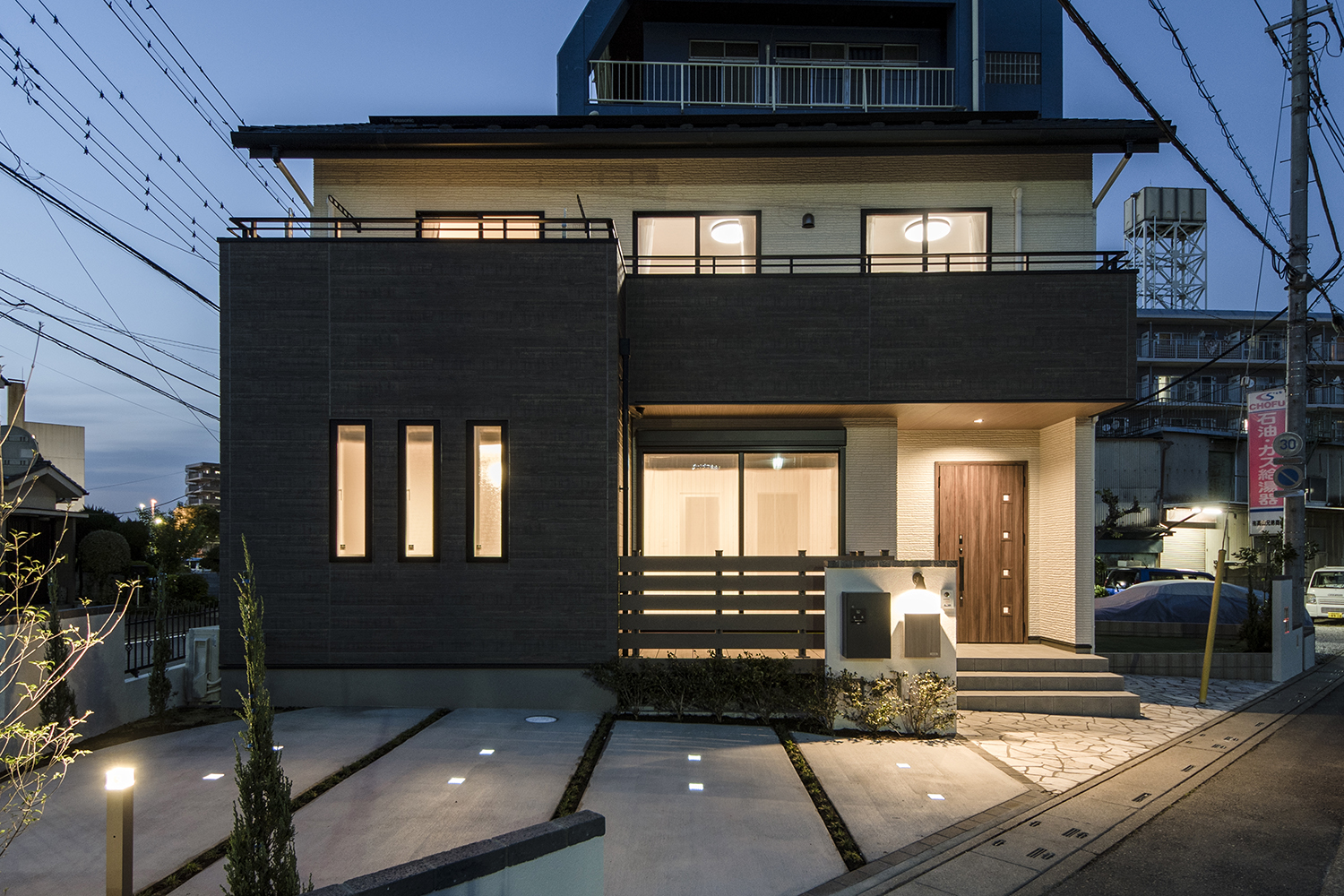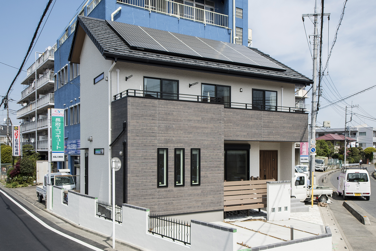 白をベースに、ヴィンテージ感のあるウッドカラーをアクセントにした外観。太陽光発電を導入した環境にやさしい住まい。