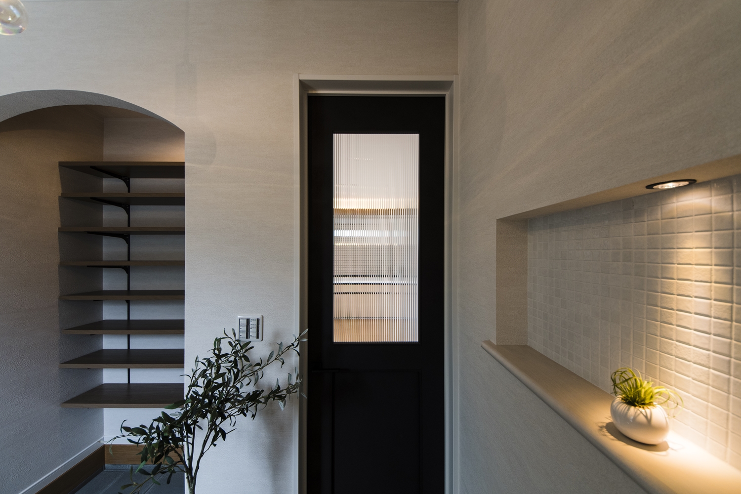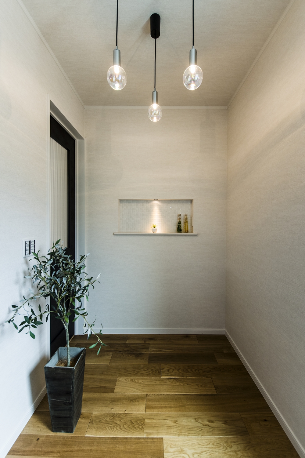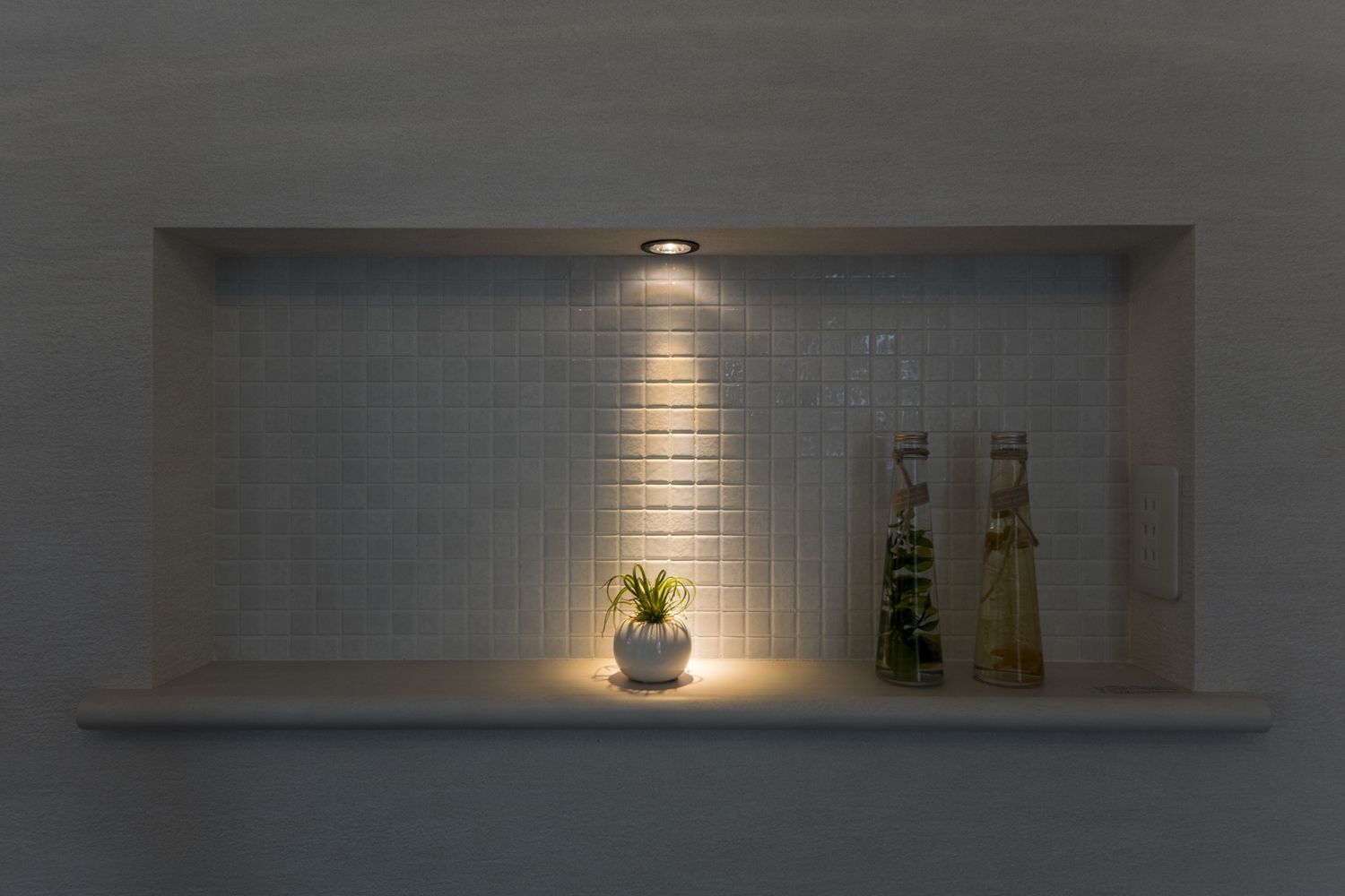 玄関ホール/小物を飾るニッチカウンターを設えました。アイテムに光を当てて、より雰囲気のあるインテリアを演出できます。