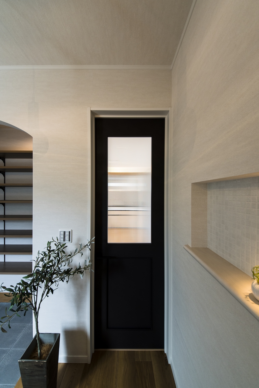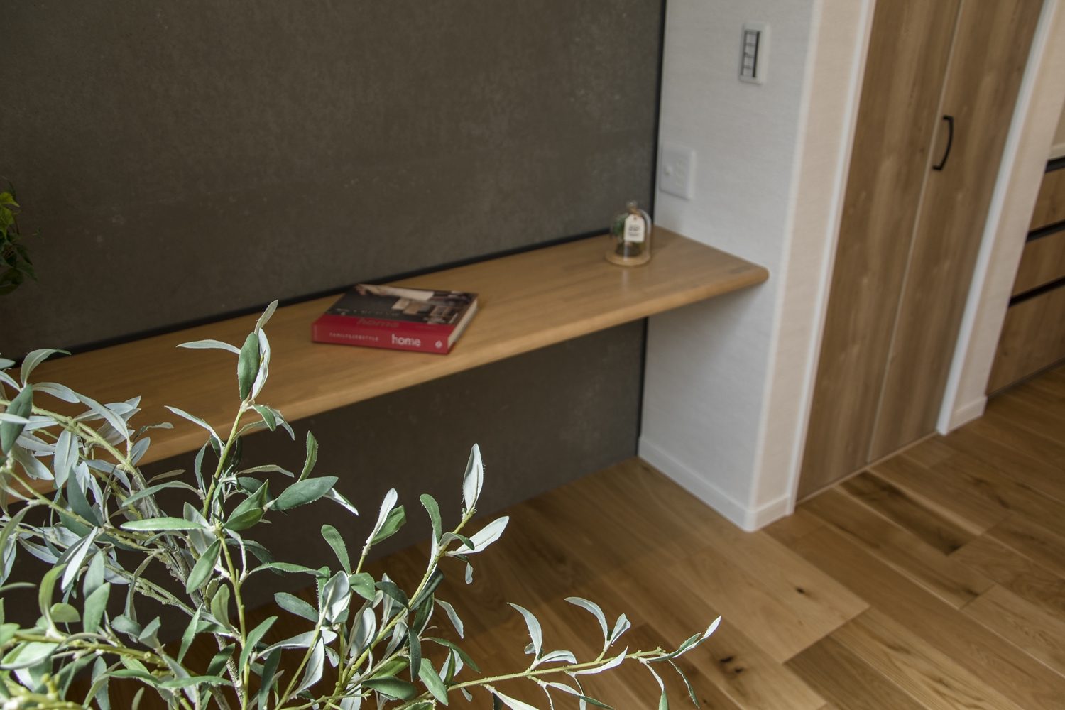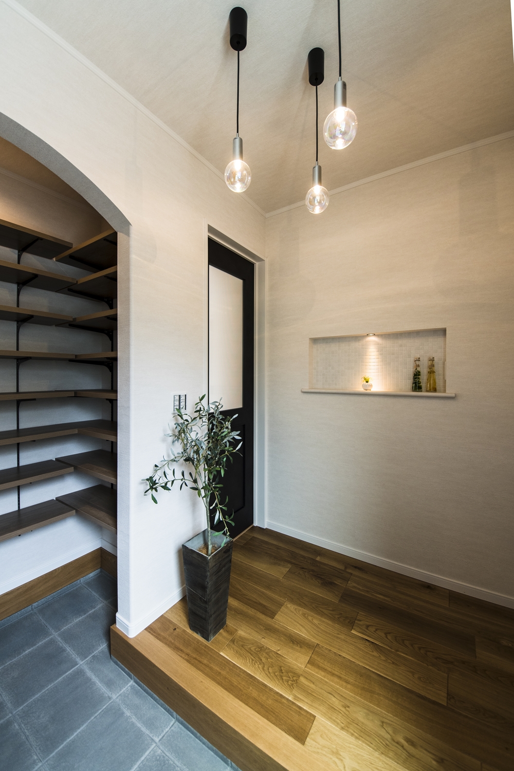玄関ホール/小物を飾るニッチカウンターを設えました。アイテムに光を当てて、より雰囲気のあるインテリアを演出できます。
