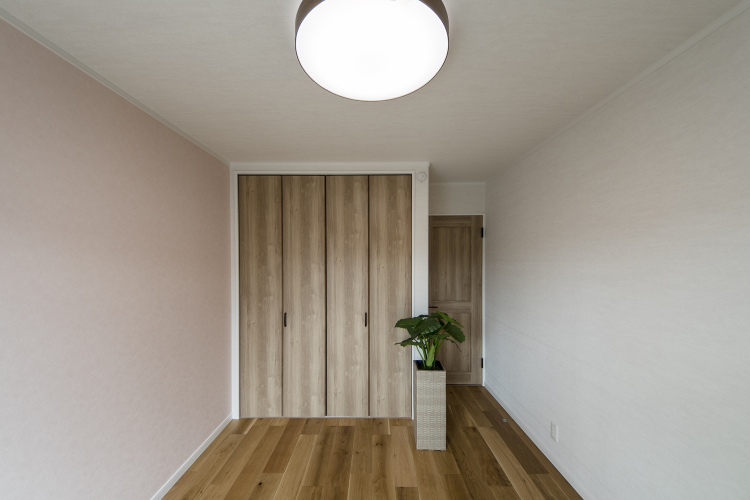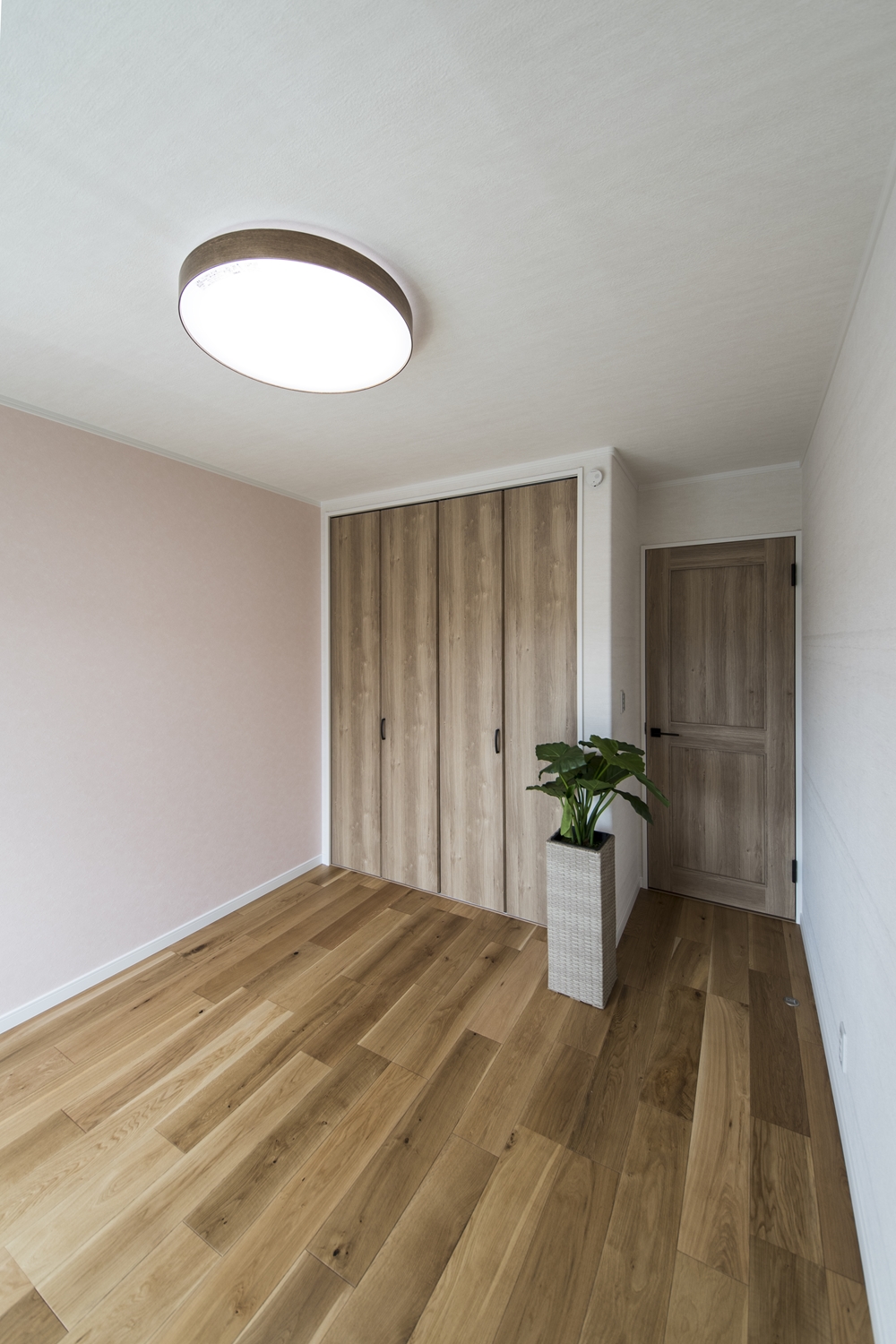 2階洋室/木のやさしい風合いを感じる建具やフローリングが、穏やかで心地の良い空間。淡いピンクのクロスをアクセントにしました。