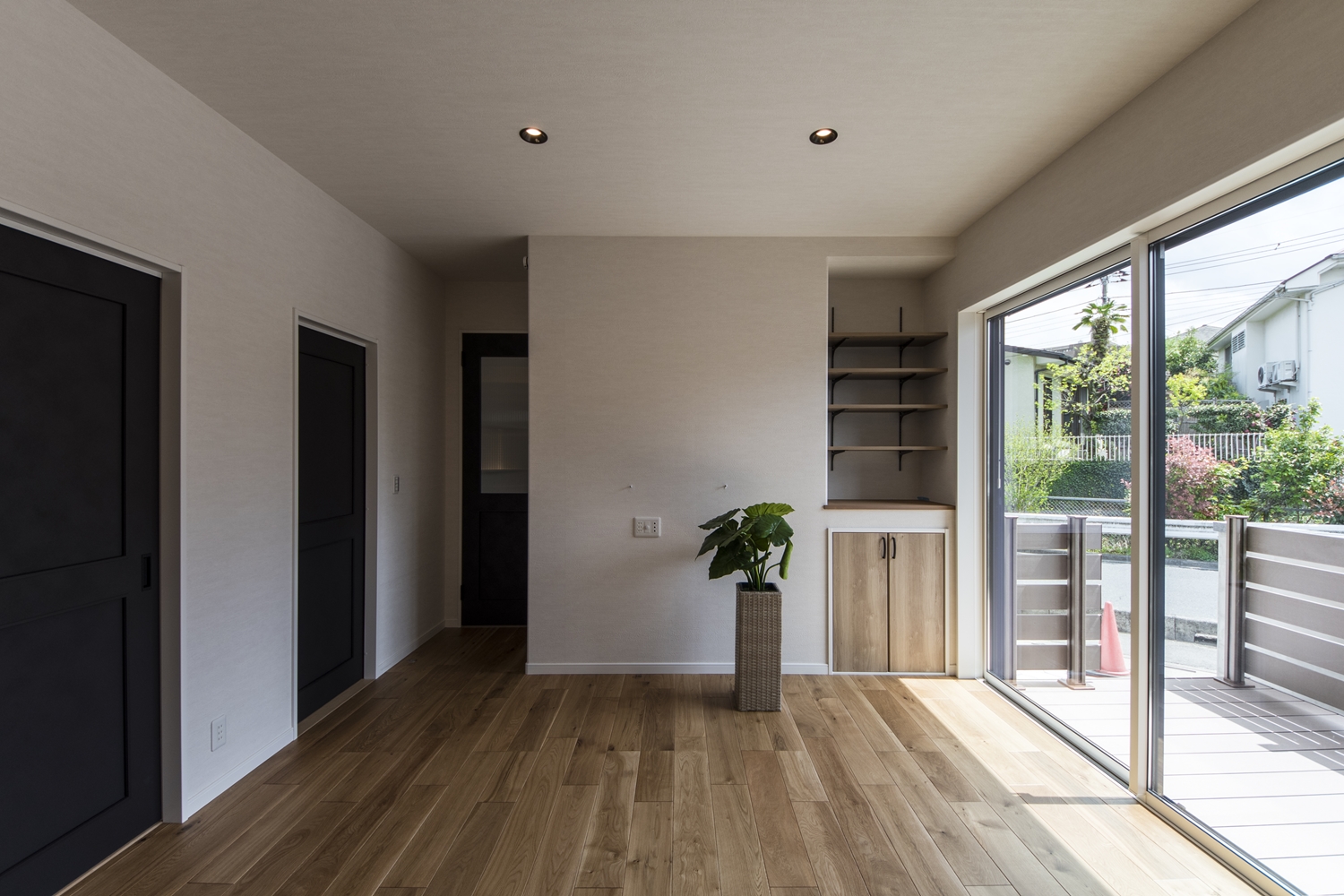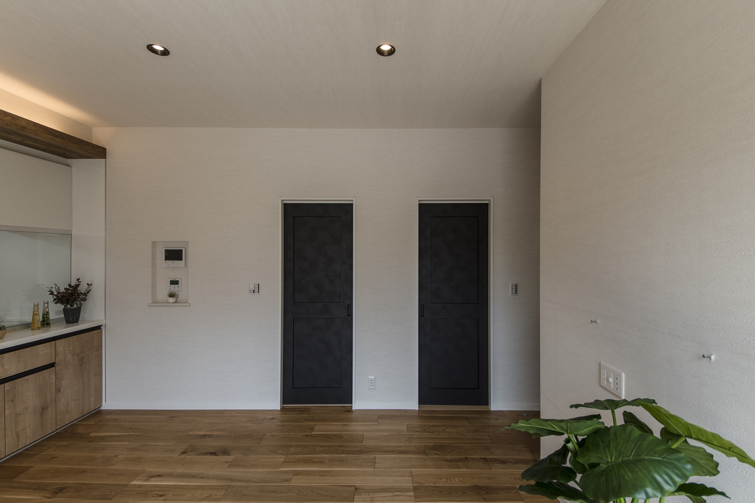 シャープなレトロ調ガラスとペンキをローラーで塗った様な、マットな質感のブラックのリビングドアを施しました。