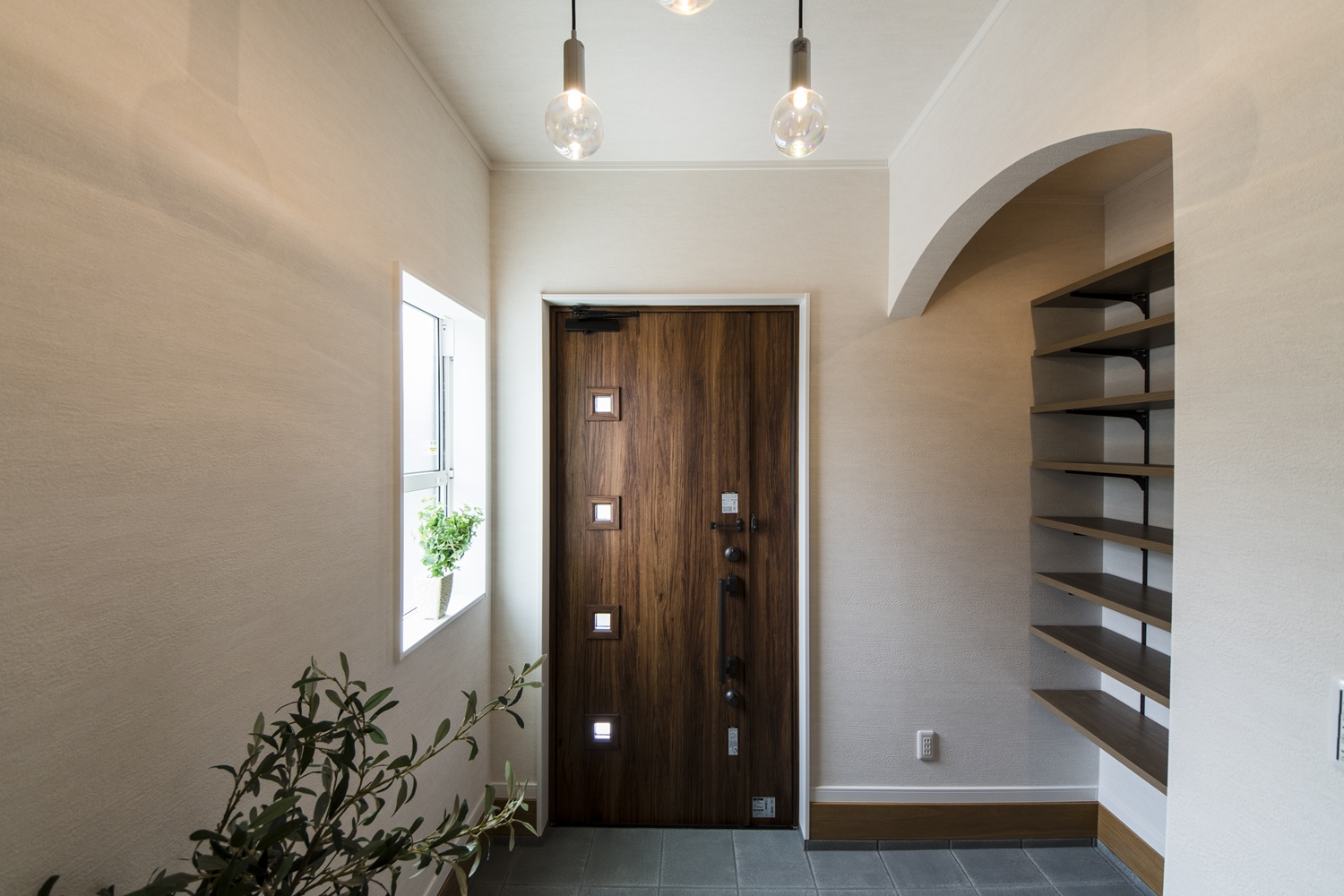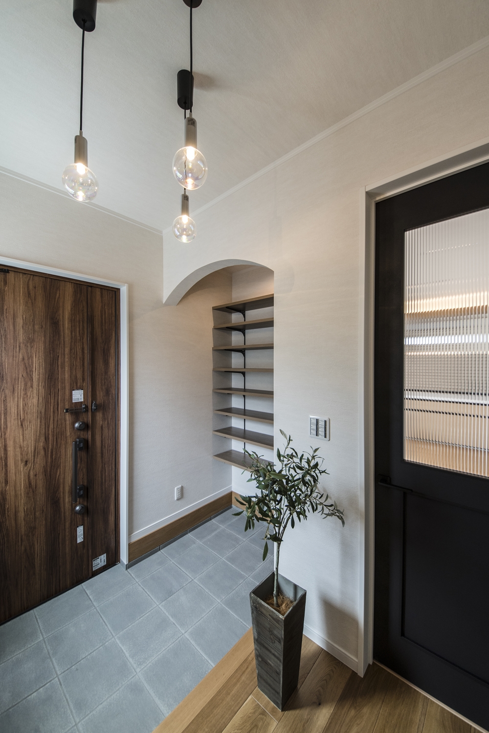 シューズクロークにアーチ状の下がり壁を設えた木の温もり感じるナチュラルテイストな玄関。