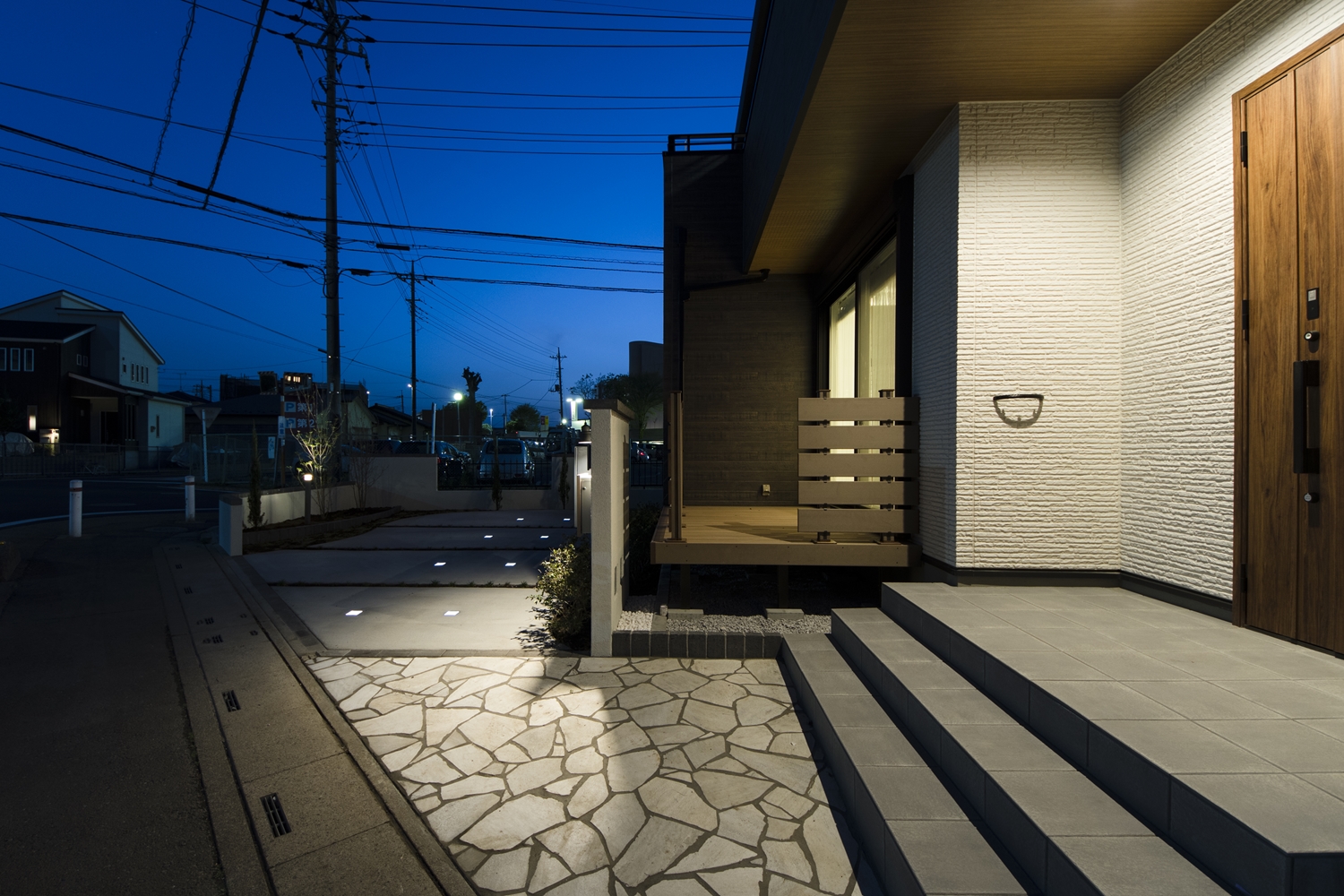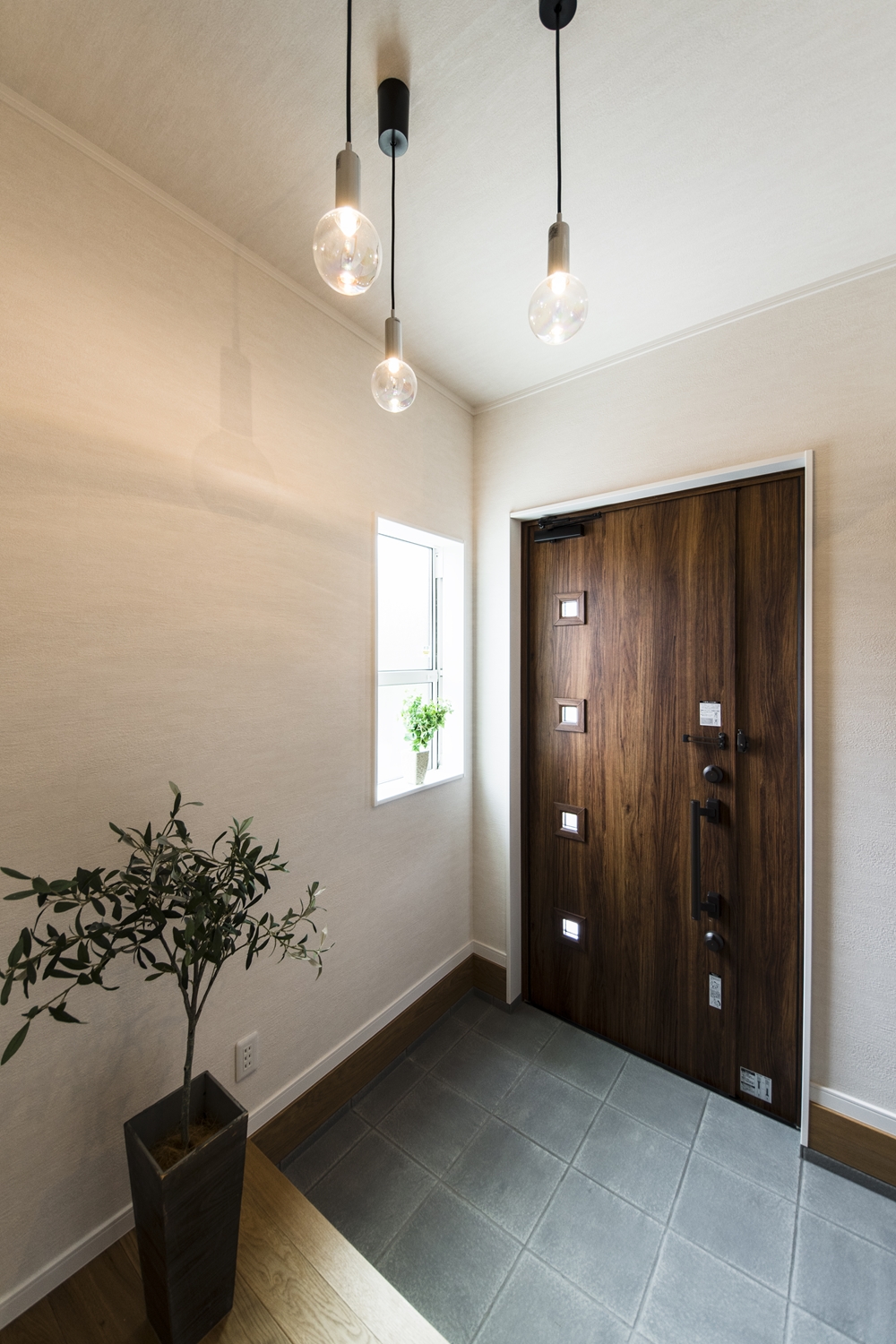 木の温もり感じる暖かみのある玄関ホール。キラキラと煌めく照明の光が空間を表情豊かに彩ります。