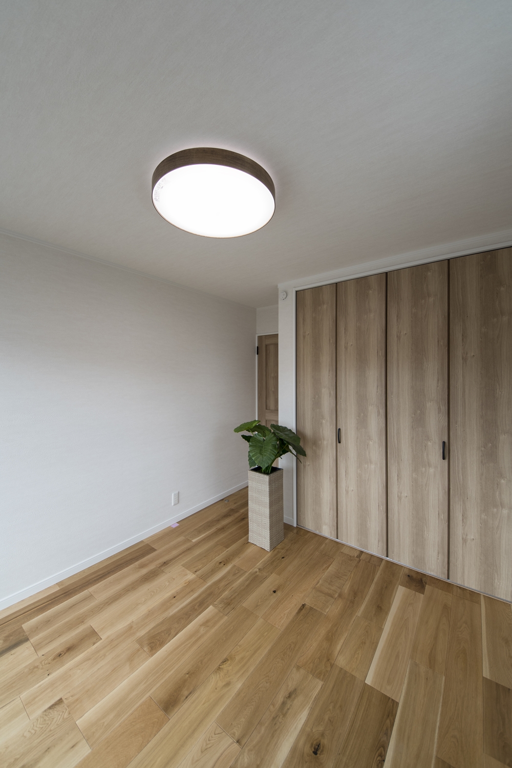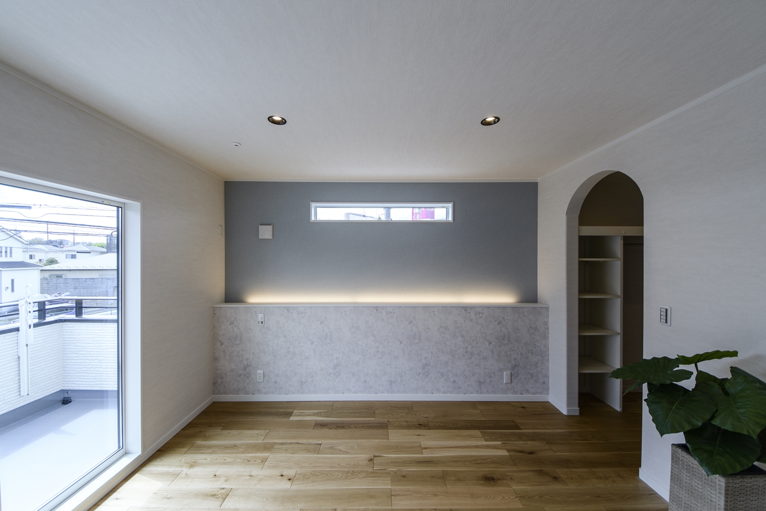 2F寝室/グレー系の落ち着いた雰囲気の壁紙をアクセントにして、間接照明を施しました。就寝前の癒しの雰囲気作りに効果的です。