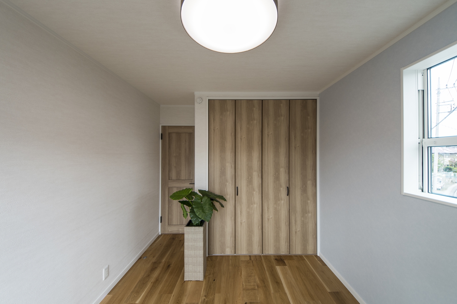 2階洋室/木のやさしい風合いを感じる建具やフローリングが、穏やかで心地の良い空間。淡いブルーグレーのクロスをアクセントにしました。