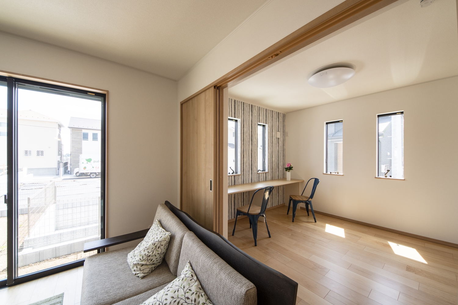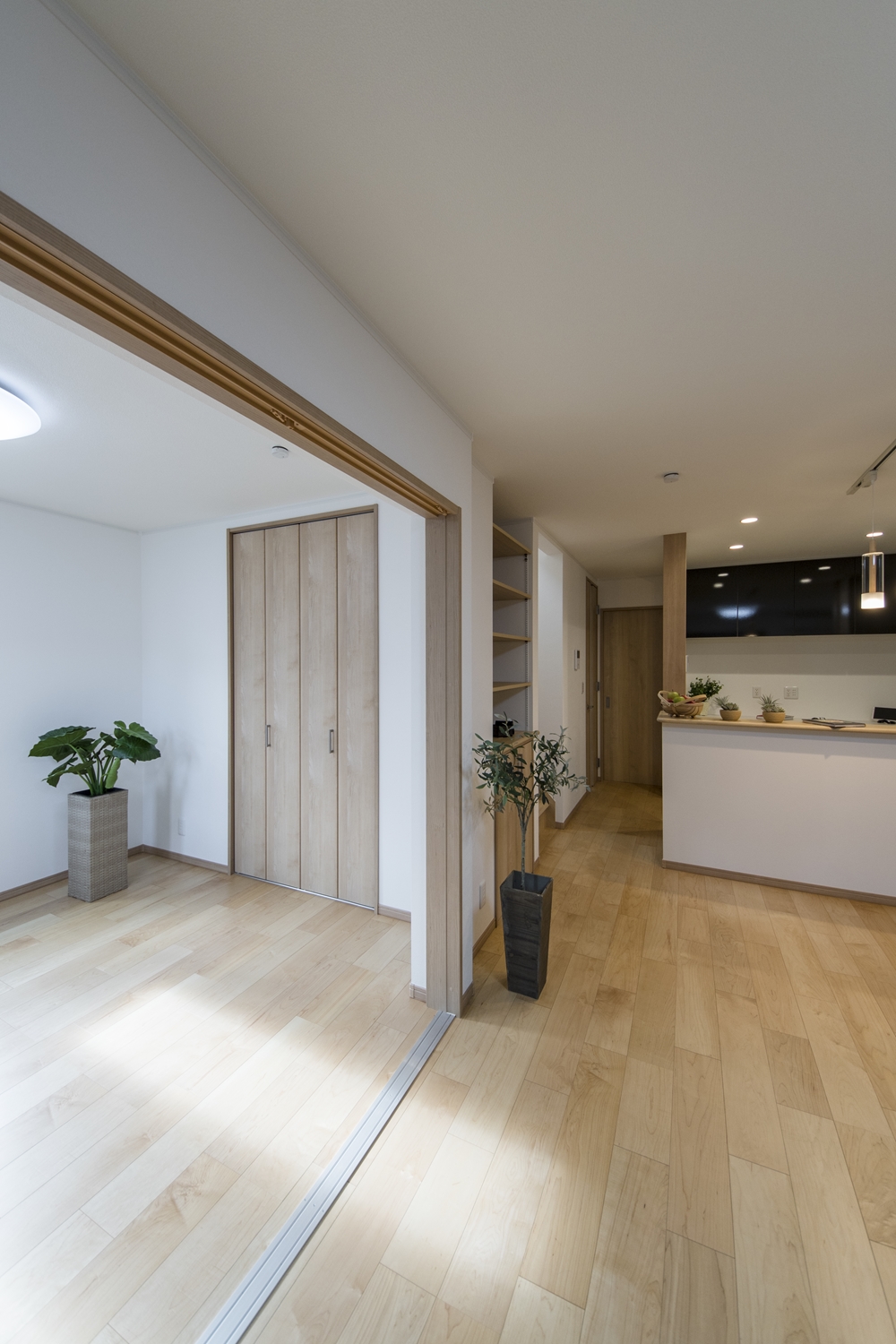 扉を開けてひとつなぎになった隣の洋室はリビングに開放感をプラスしてくれます。