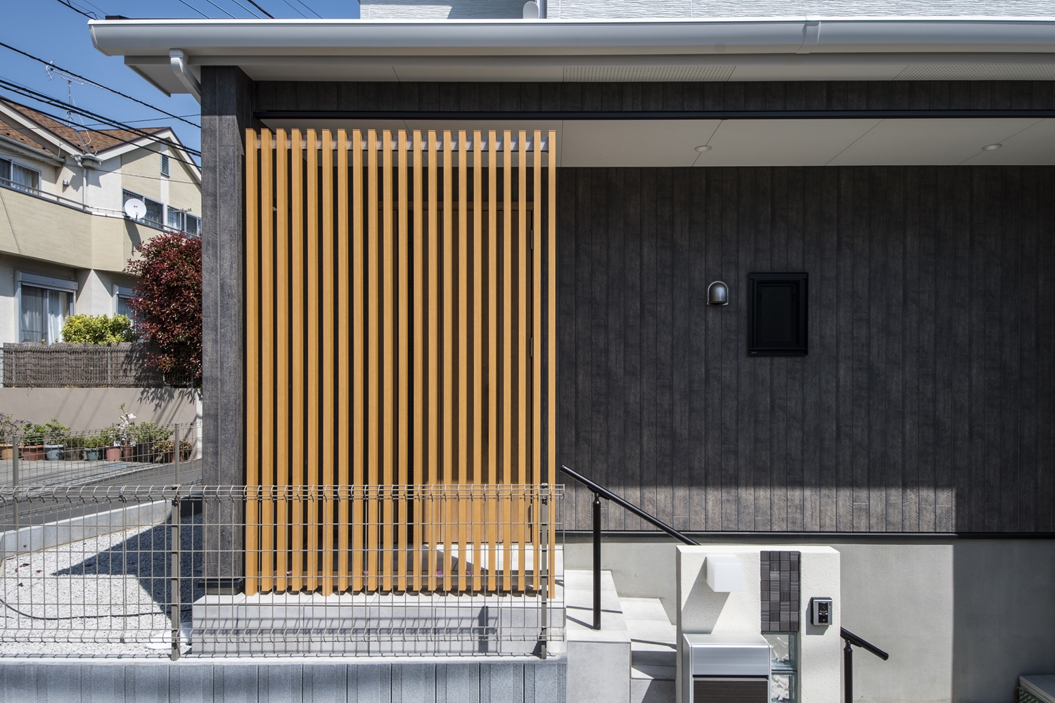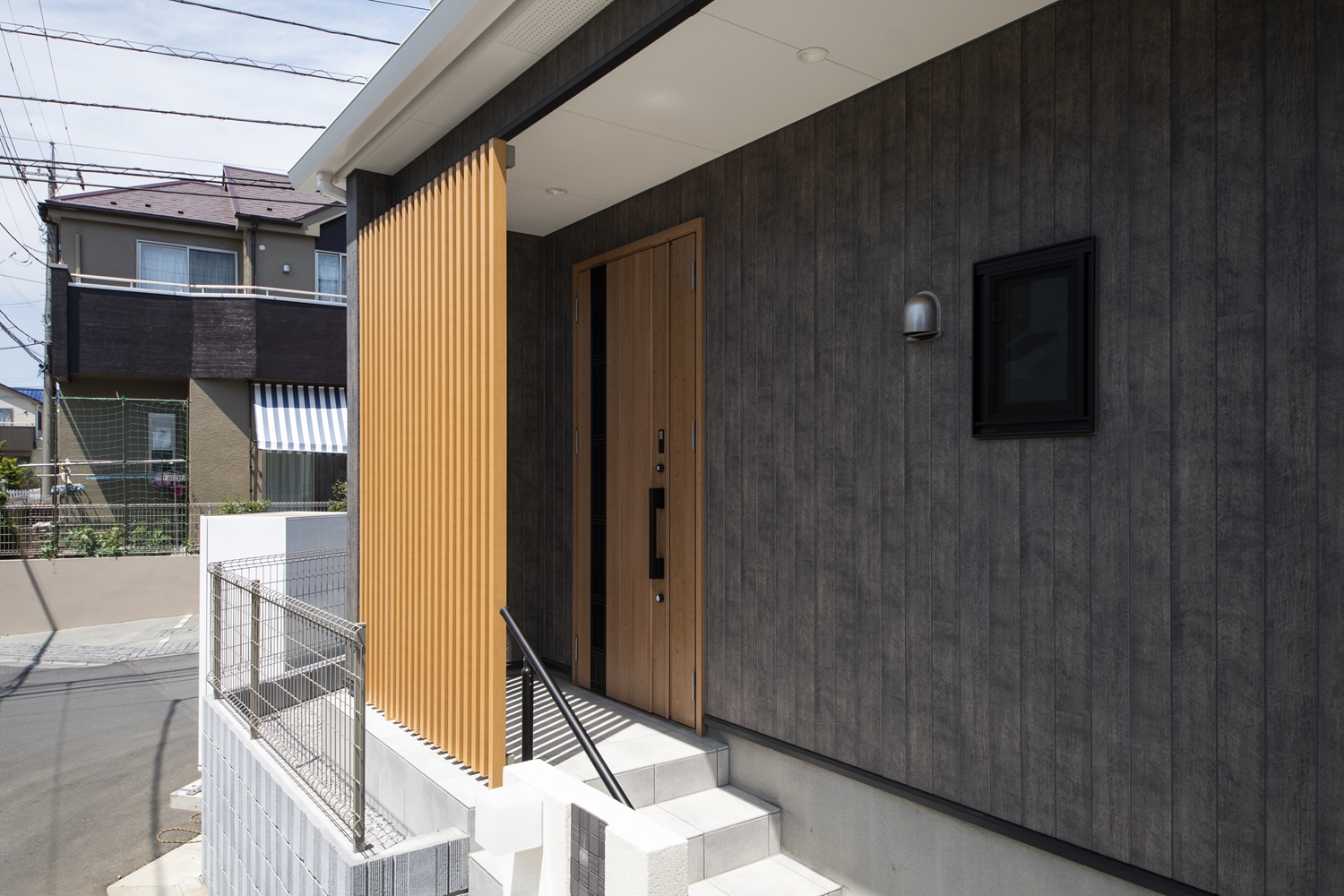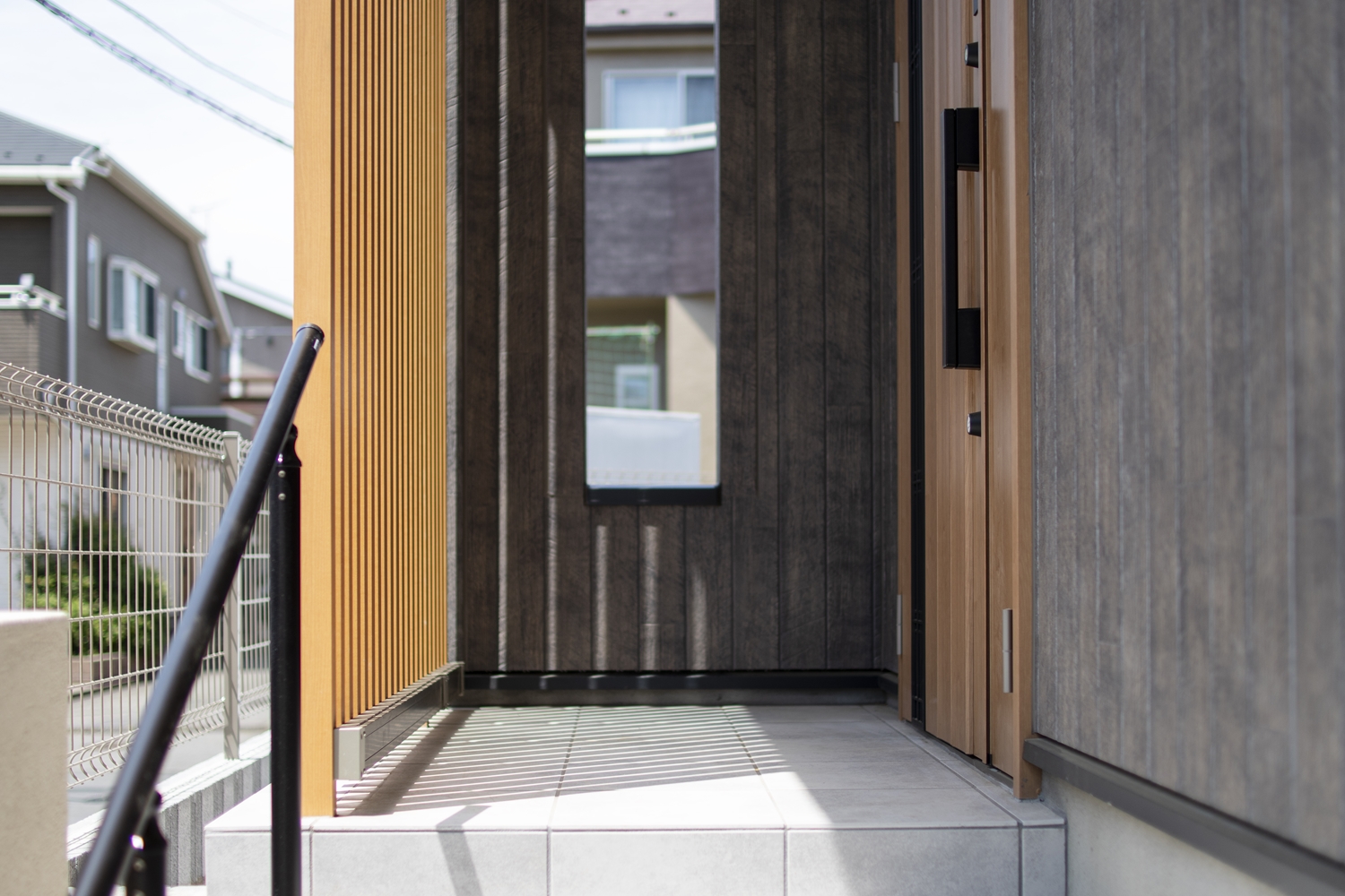 エントランスに木目の格子を施しました。周囲の視線を程よくカットし、爽やかな光や風を取入れます。見た目も上質な印象です。