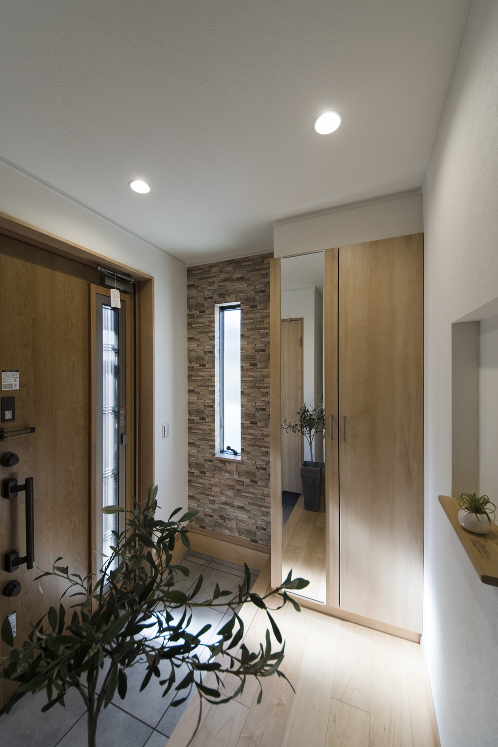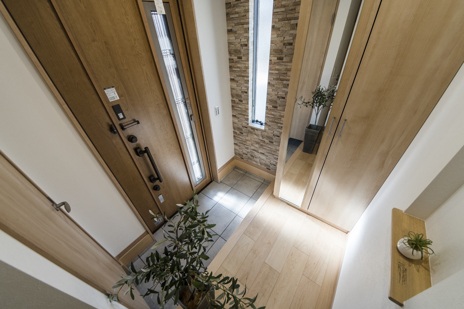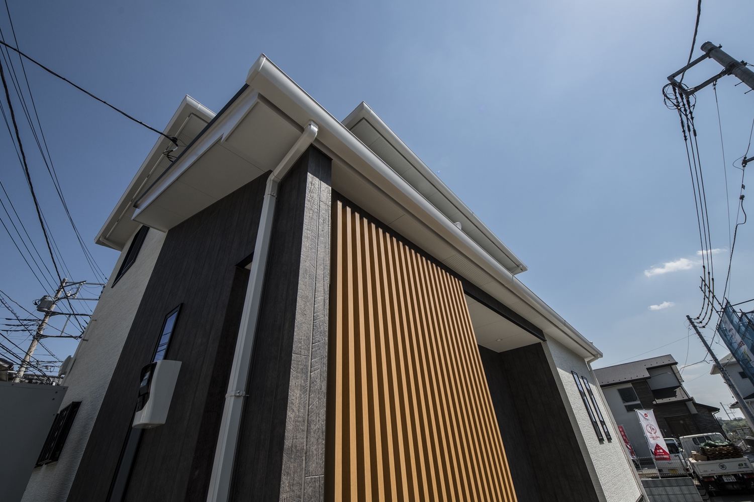 エントランスに木目の格子を施しました。周囲の視線を程よくカットし、爽やかな光や風を取入れます。見た目も上質な印象です。