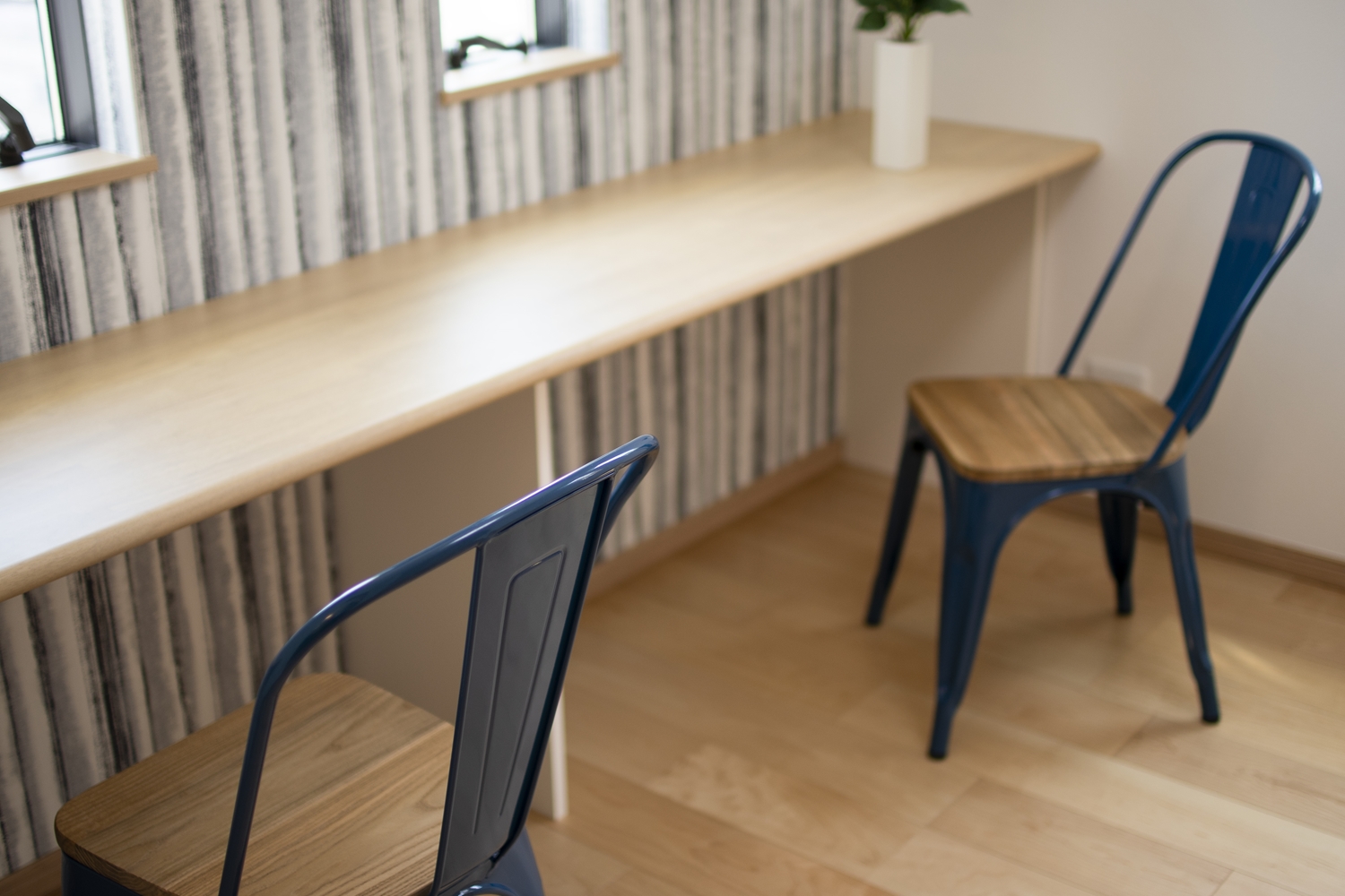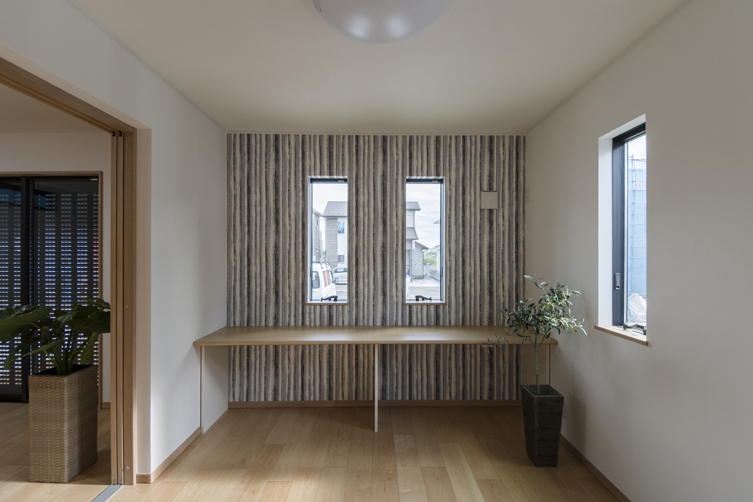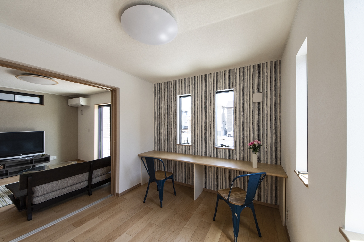 1階洋室/スタディコーナーやミセスコーナーとして利用できるカウンターを設置。アクセントクロスがモダンな印象を与えます。