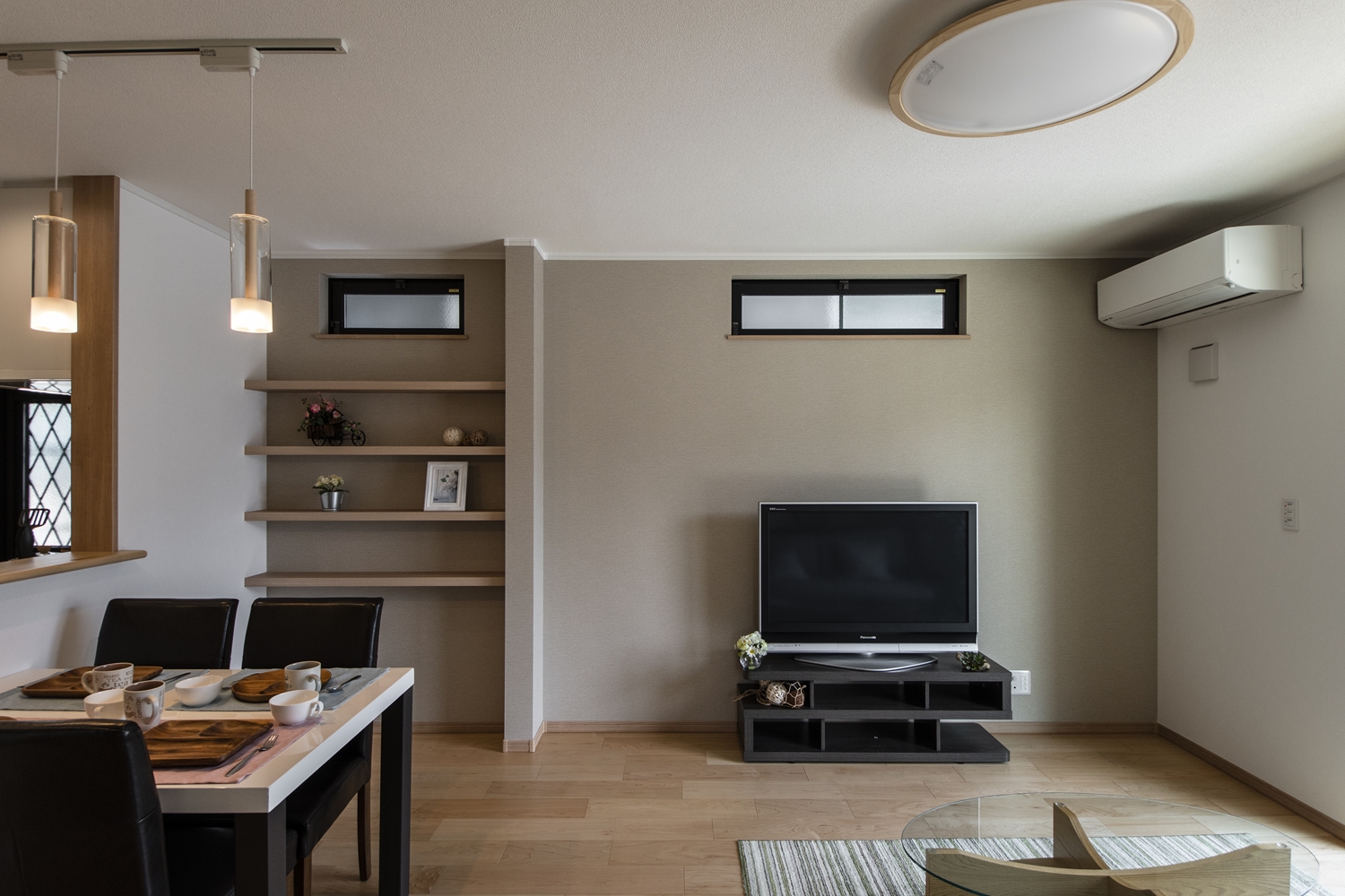 ベージュ系のクロスをアクセントにして、収納や小物のディスプレイも楽しめるシェルフを設えました。