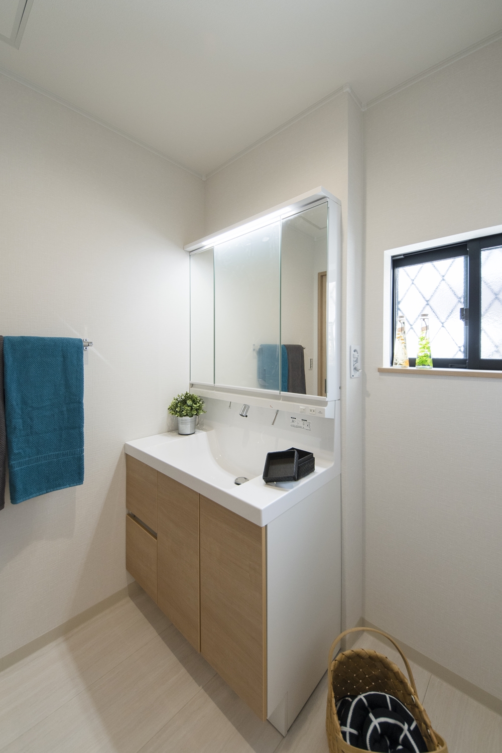 白を基調とした清潔感のあるサニタリールーム。木目調の洗面化粧台がナチュラルな雰囲気を演出。