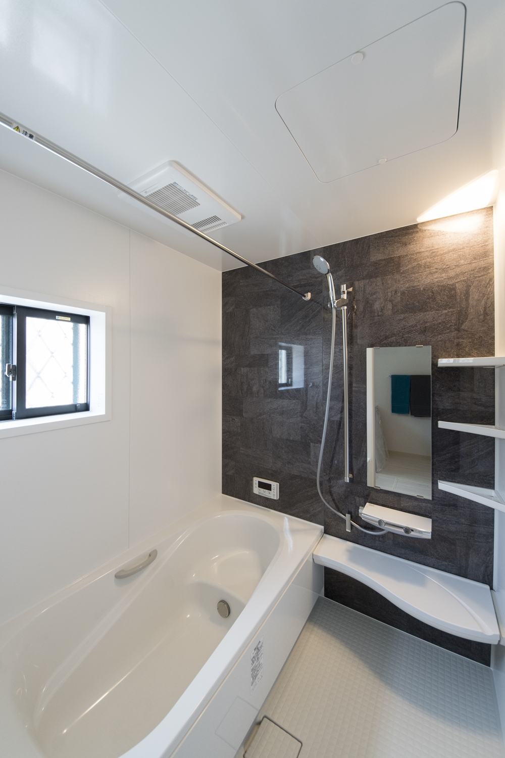 天然石の豊かな表情をモチーフにした、グレーのアクセントパネルが上質な空間を演出します。