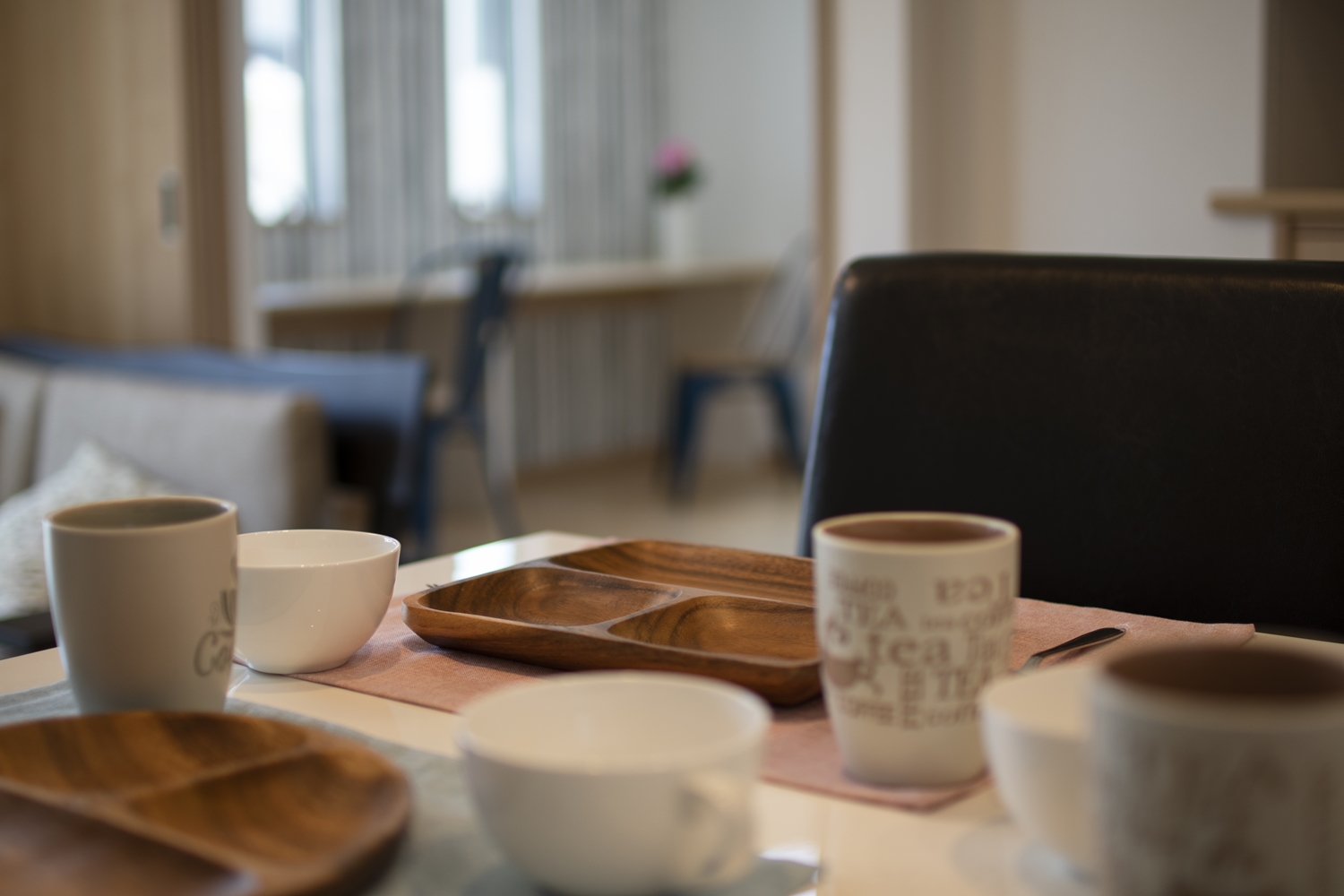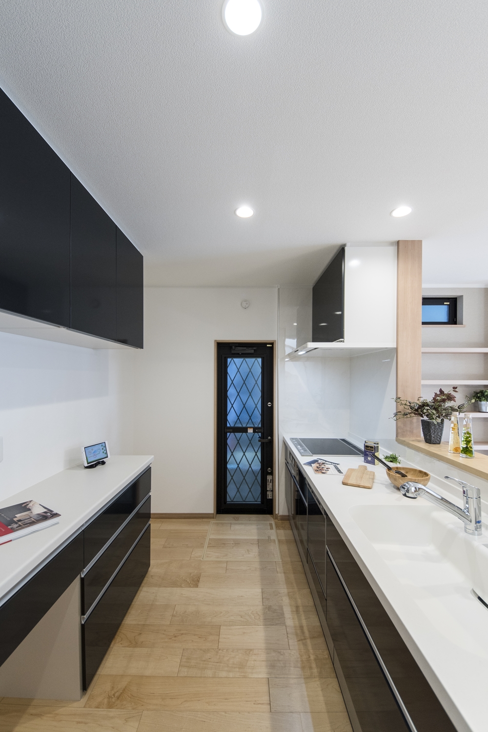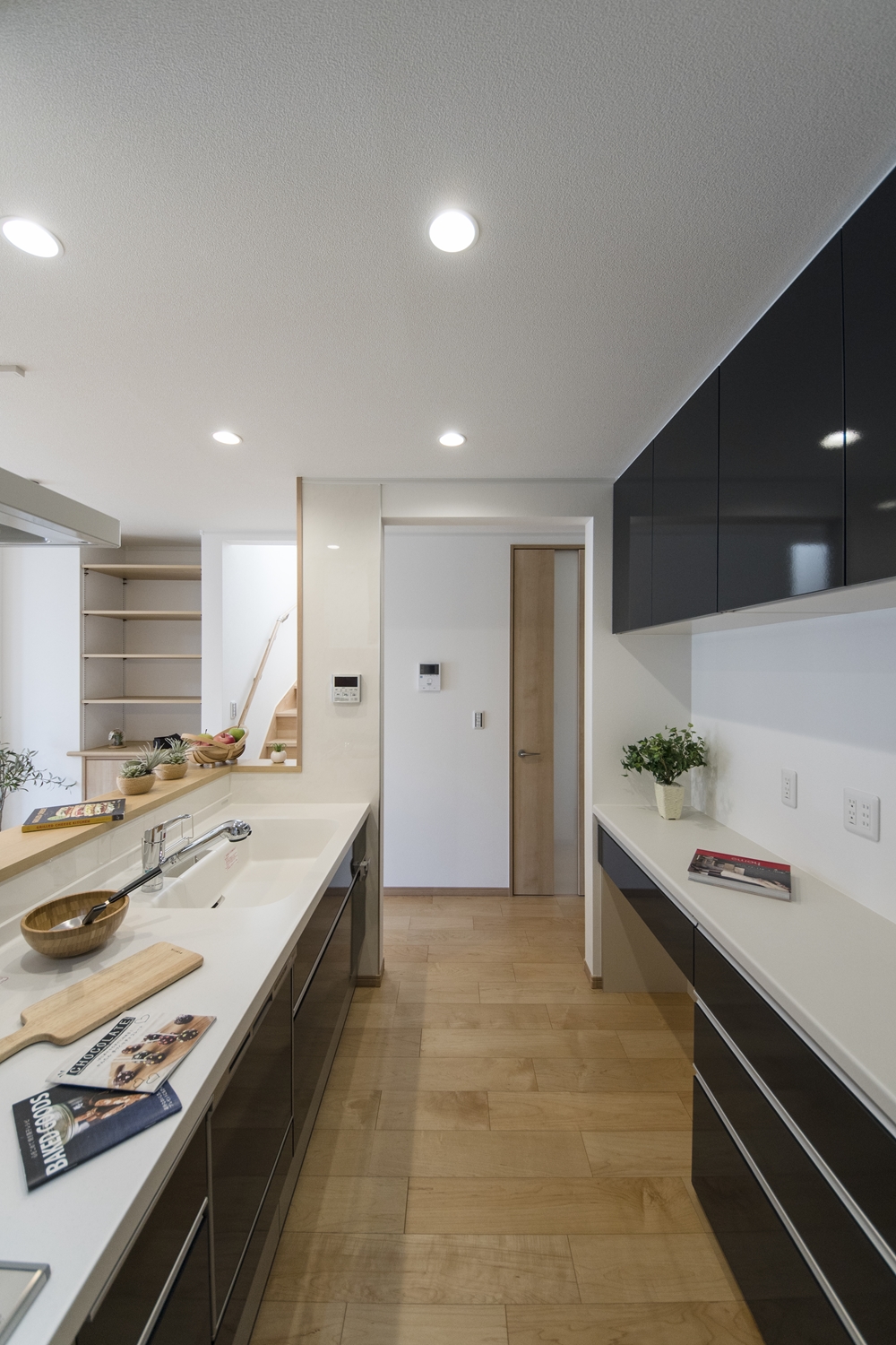 キッチン背面にはキッチンと同じ配色のカップボードを設置しました。
