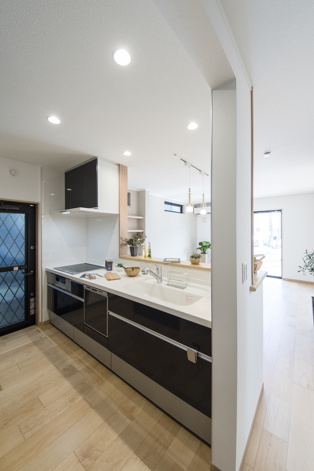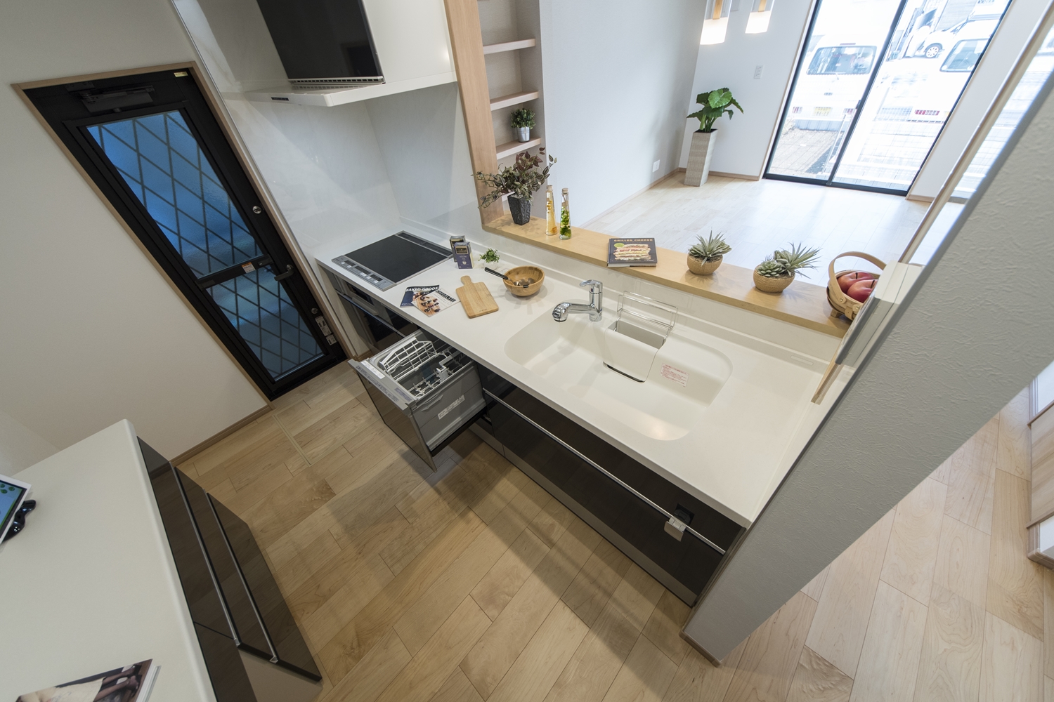 食器洗い乾燥機や、カップボード、吊戸棚を施した、見た目も使い勝手も優秀なキッチン。