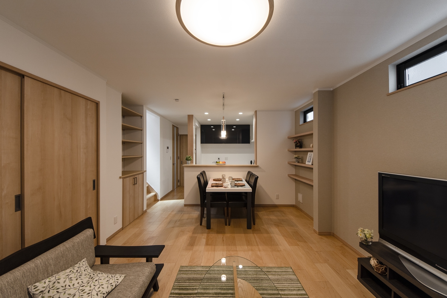 キッチンから、リビング、ダイニングが見渡せる、開放的で一体感のある間取り。